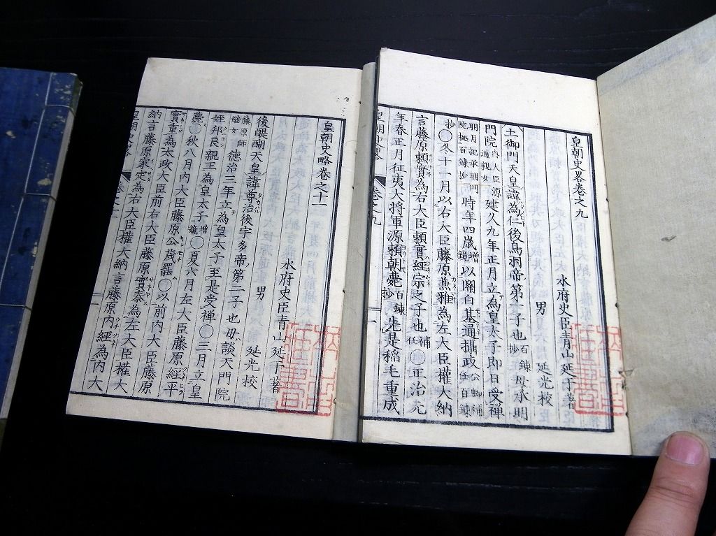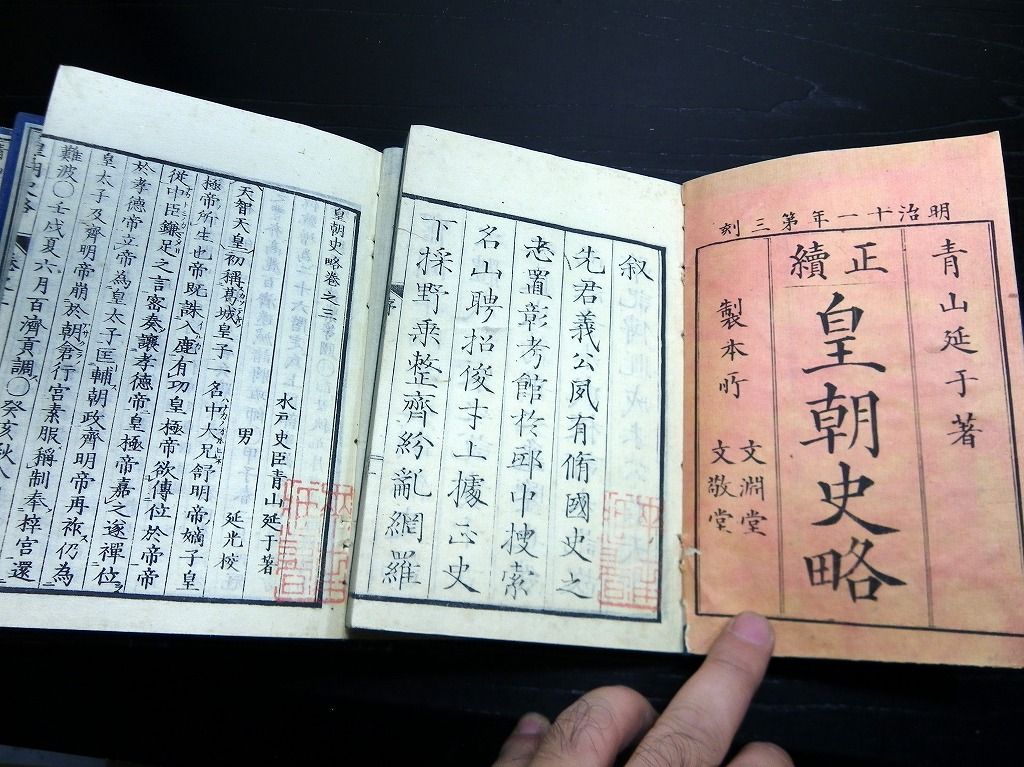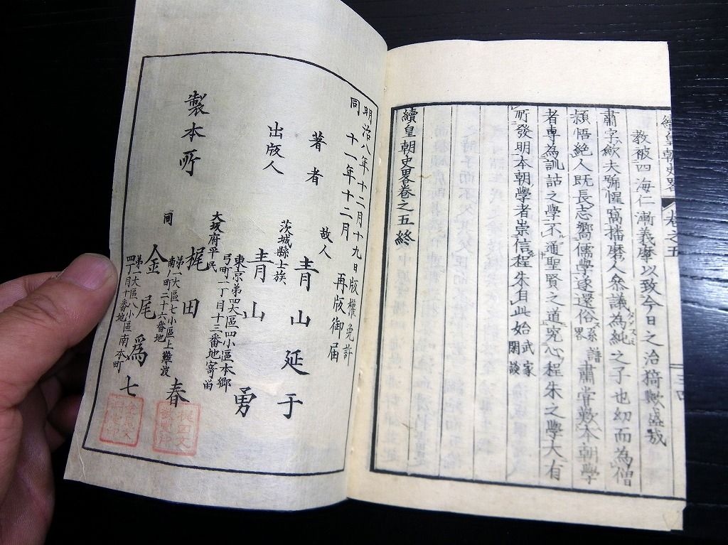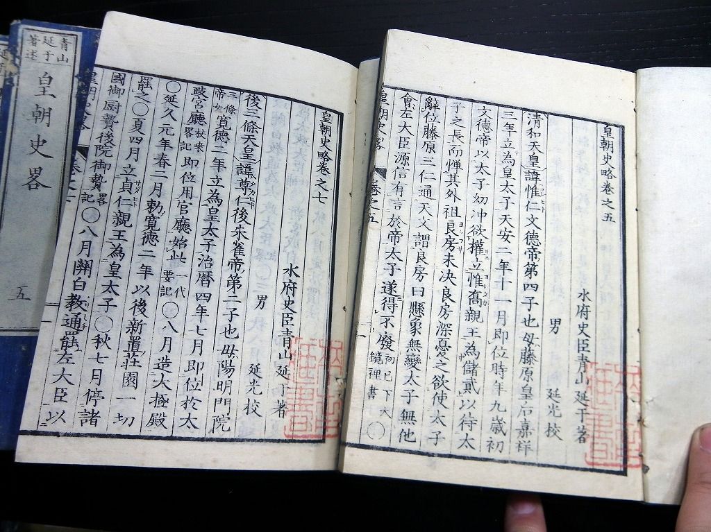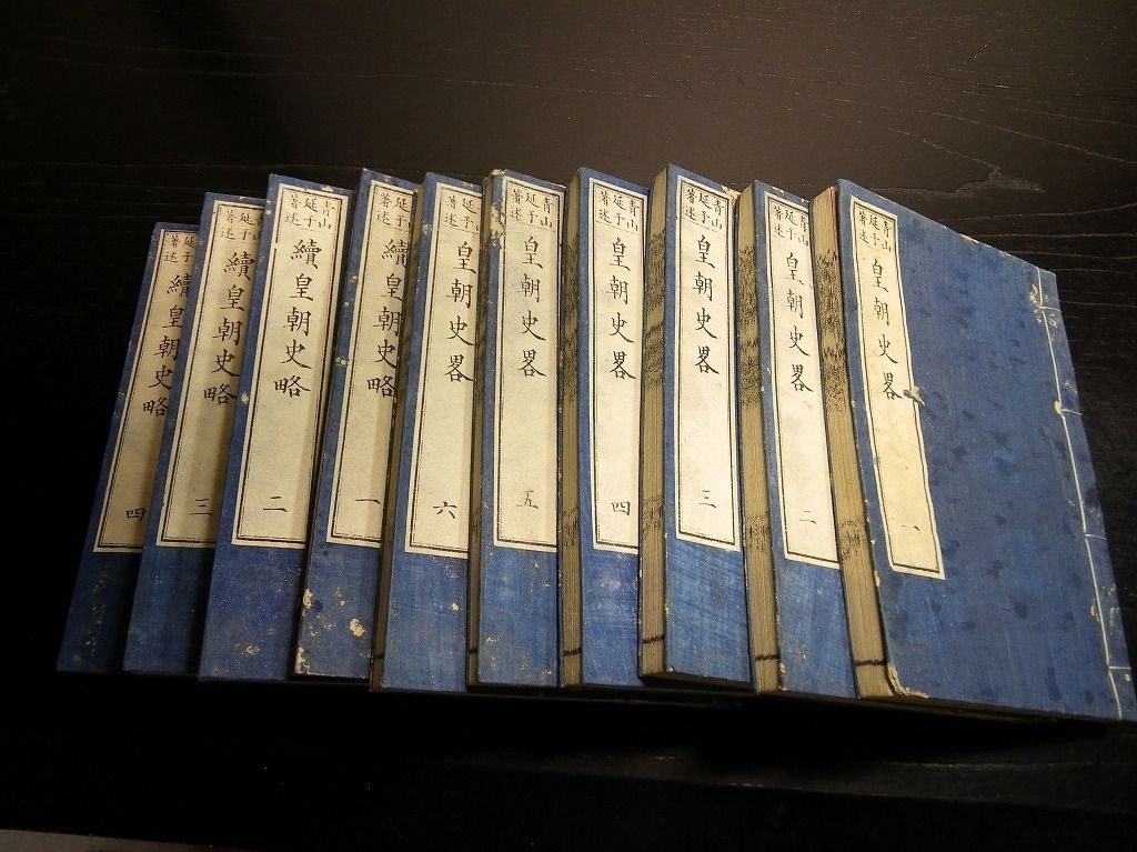 2019年08月24日 和本明治11年(1878)版日本史「皇朝史略」10冊揃/青山延于/漢文/古書古文書/木版摺り 和本明治11年(1878)版日本史「皇朝史略」10冊揃/青山延于/漢文/古書古文書/木版摺りです。 4+3+3+2+2+14+36、38+28、29+37、31+35、22+22、42+30+1、3+36、31+21、53、34丁。中本。木版刷り。元題簽。見返しあり。奥付あり。 『データ』 【書名】 皇朝史略 【巻冊】 正続10冊揃 【著者】 青山延于 【成立】 明治11年(1878)版 タグ :#和本#日本史#青山延于