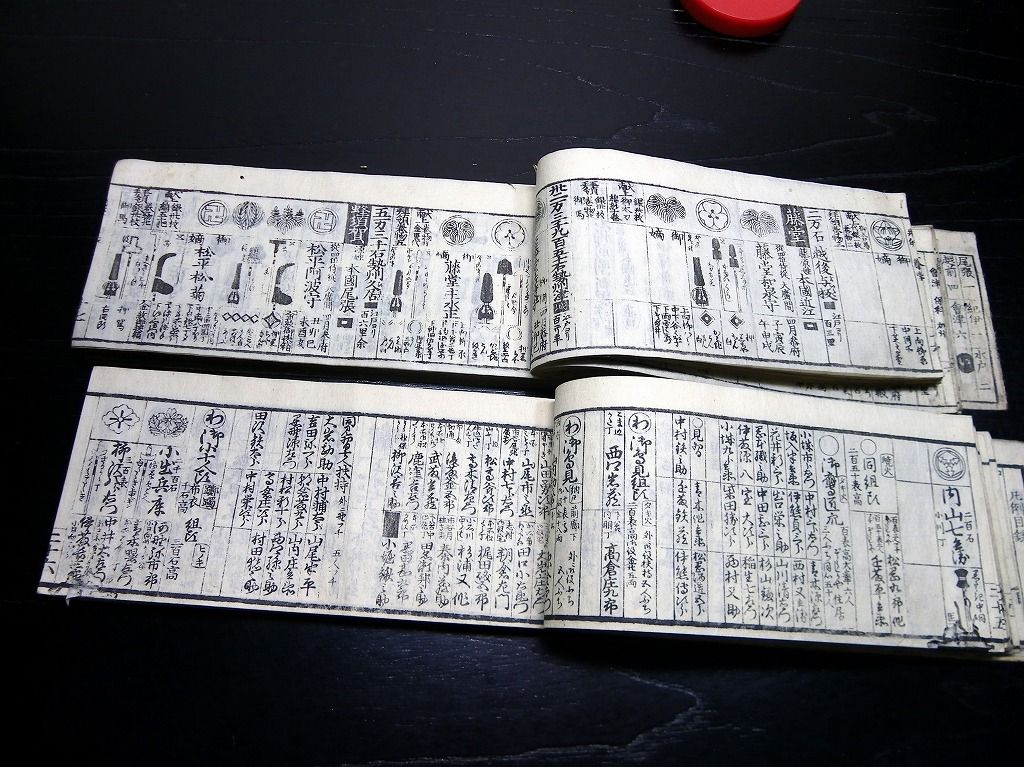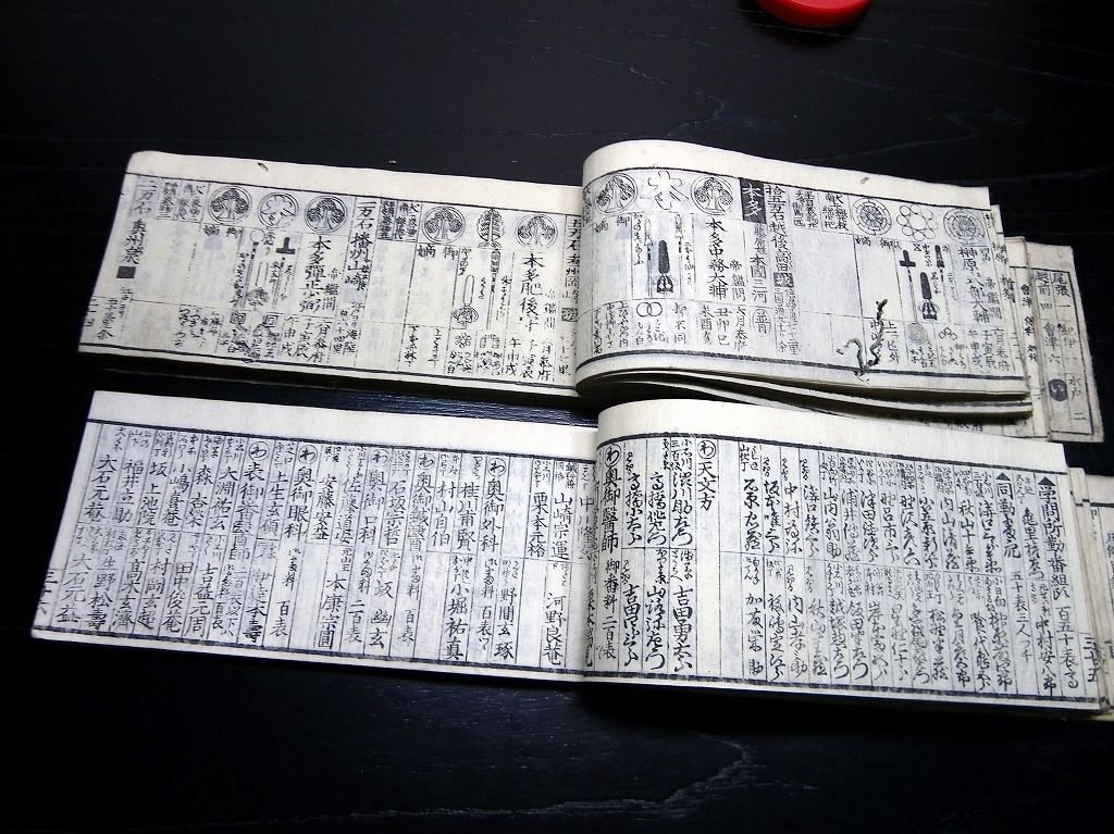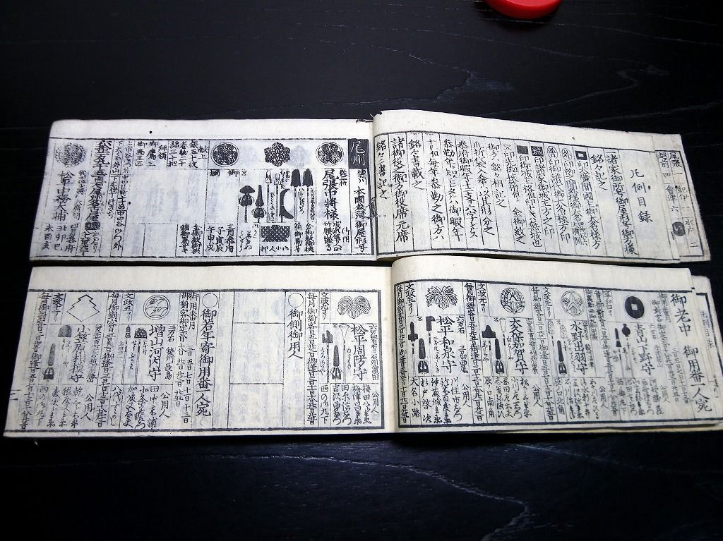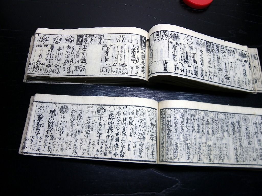 2019年08月29日 和本江戸文政12年(1829)版幕府役職大名名鑑「袖玉武鑑/袖珍武鑑」2冊揃/須原屋茂兵衛/家紋/古書古文書/木版摺り 和本江戸文政12年(1829)版幕府役職大名名鑑「袖玉武鑑/袖珍武鑑」2冊揃/須原屋茂兵衛/家紋/古書古文書/木版摺りです。 73、70丁。横本(7cm×16.5cm)。木版刷り。奥付あり。 『データ』 【書名】 袖玉武鑑/袖珍武鑑 【巻冊】 2冊揃 【著者】 須原屋茂兵衛 【成立】 文政12年(1829)版 タグ :#和本#武鑑#家紋