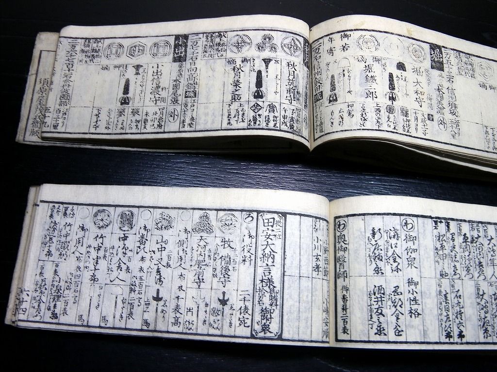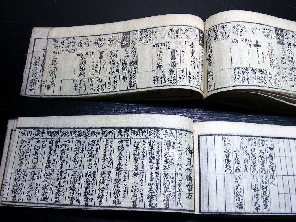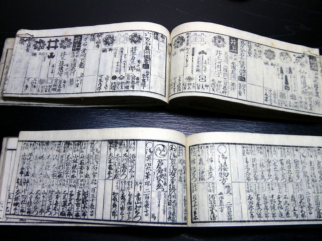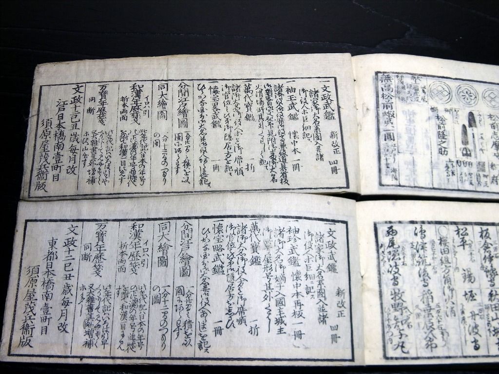 2019年08月29日 和本江戸文政12年(1829)版幕府役職大名名鑑「袖玉武鑑/袖珍武鑑」2冊揃/須原屋茂兵衛/家紋/古書古文書/木版摺り 和本江戸文政12年(1829)版幕府役職大名名鑑「袖玉武鑑/袖珍武鑑」2冊揃/須原屋茂兵衛/家紋/古書古文書/木版摺りです。 73、70丁。横本(7cm×16.5cm)。木版刷り。奥付あり。 『データ』 【書名】 袖玉武鑑/袖珍武鑑 【巻冊】 2冊揃 【著者】 須原屋茂兵衛 【成立】 文政12年(1829)版 タグ :#和本#武鑑#家紋