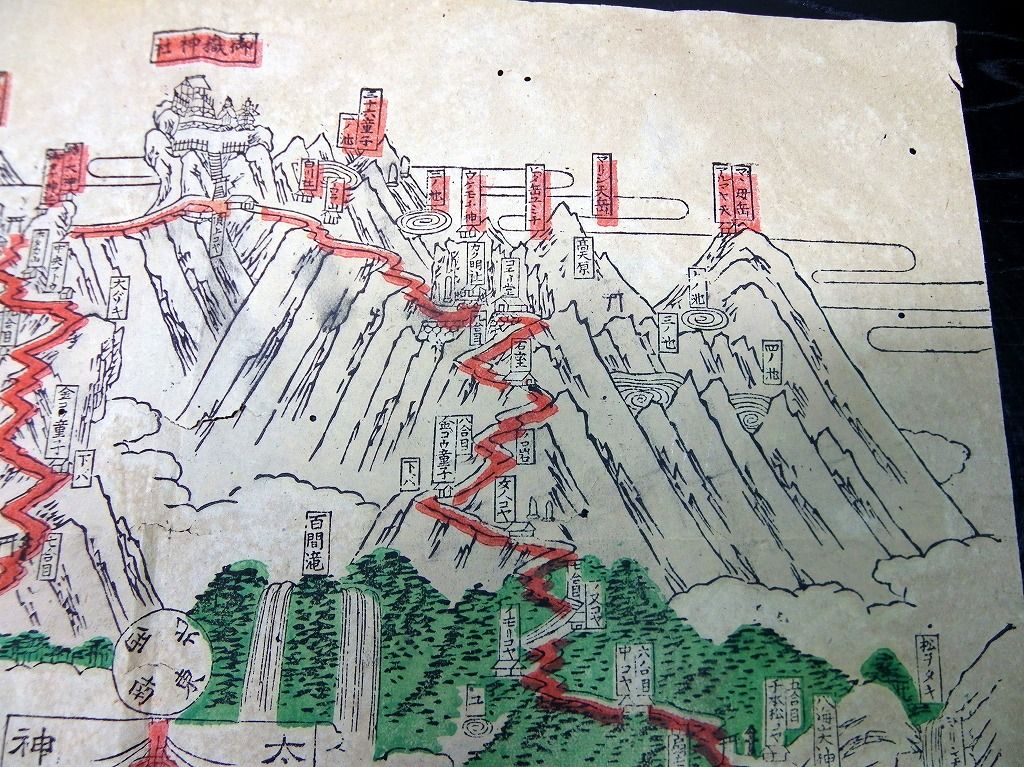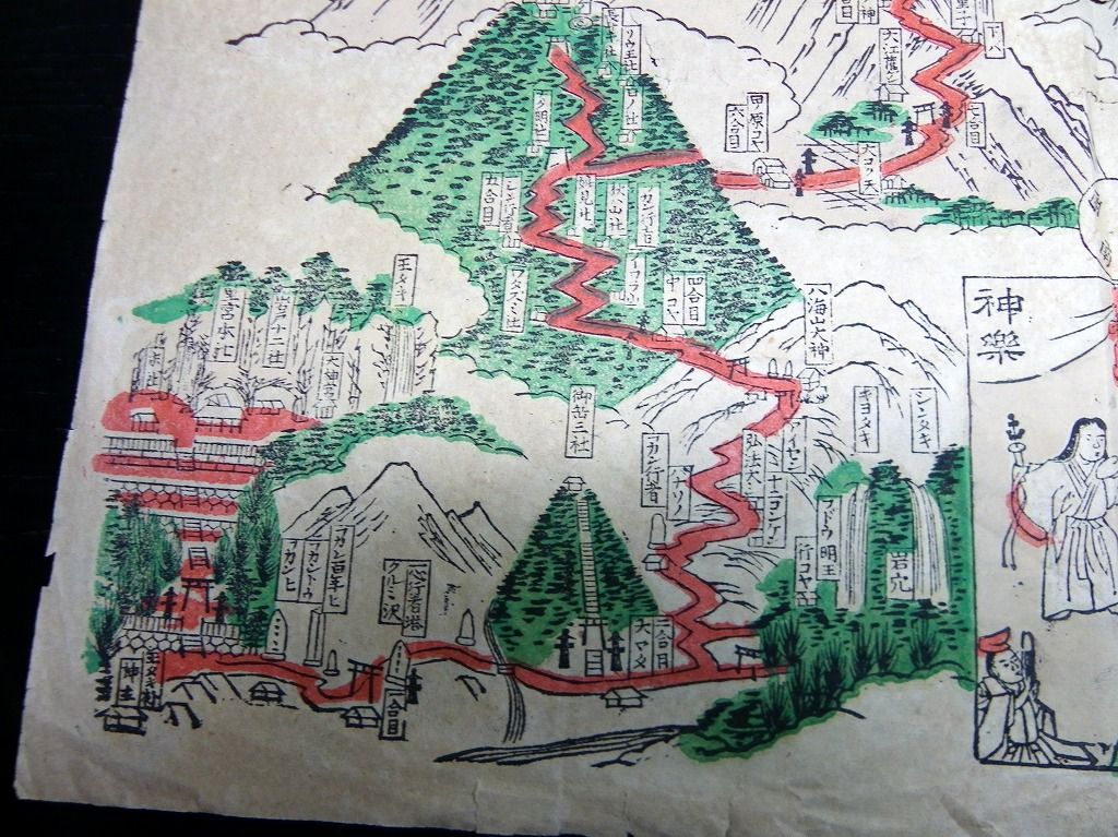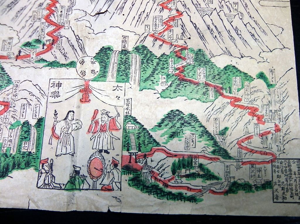 2019年08月10日 明治35年(1902)古地図鳥瞰図「信濃国木曽御嶽山全図/太々神楽図」1点/児野文助 明治35年(1902)古地図鳥瞰図「信濃国木曽御嶽山全図/太々神楽図」1点/児野文助です。 25cm×35cm。 『データ』 【書名】 信濃国木曽御嶽山全図/太々神楽図 【巻冊】 1点 【著者】 児野文助 【成立】 明治35年(1902) タグ :#古地図#摺物#木曽御嶽山