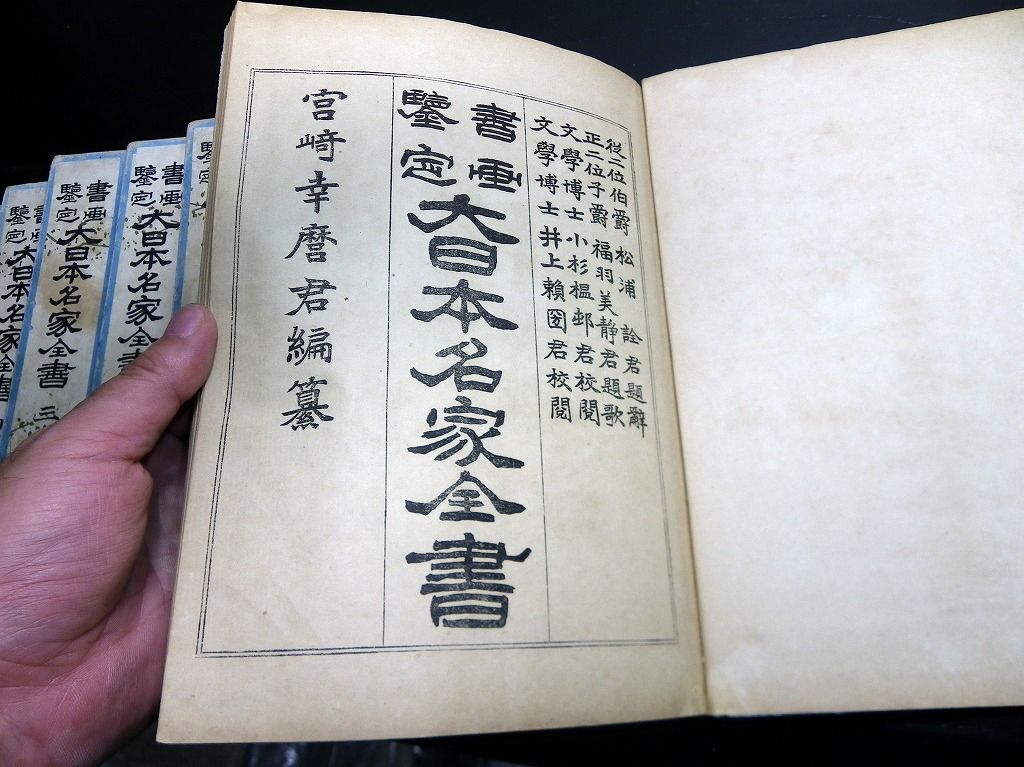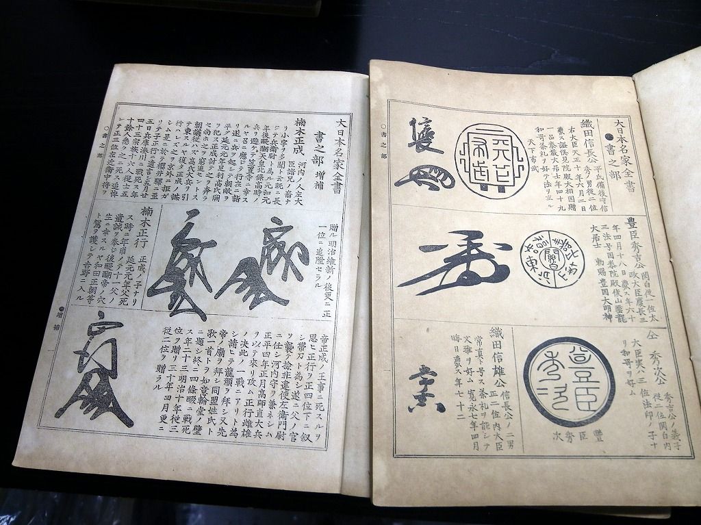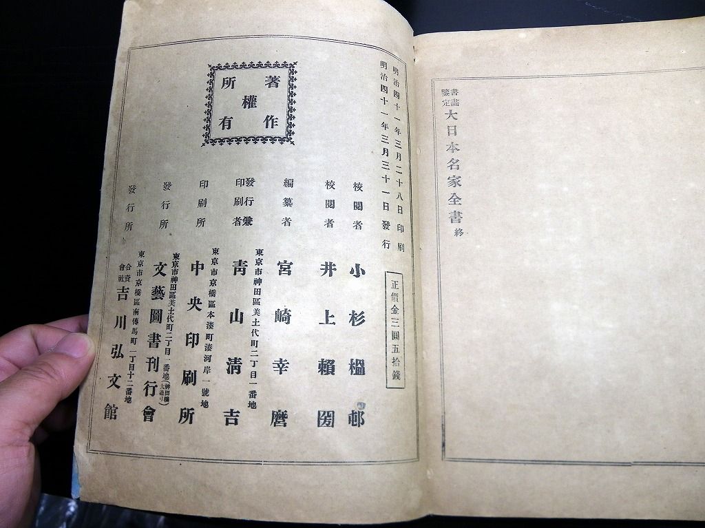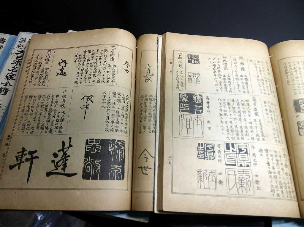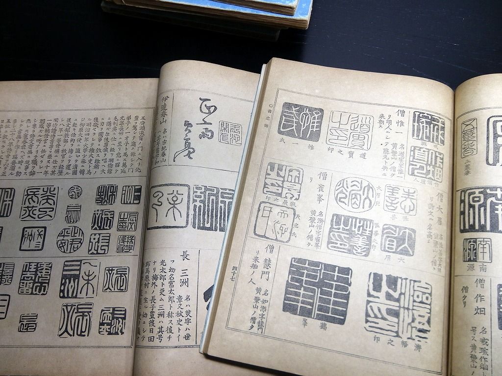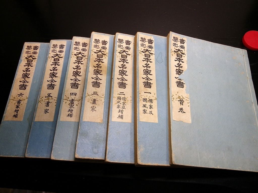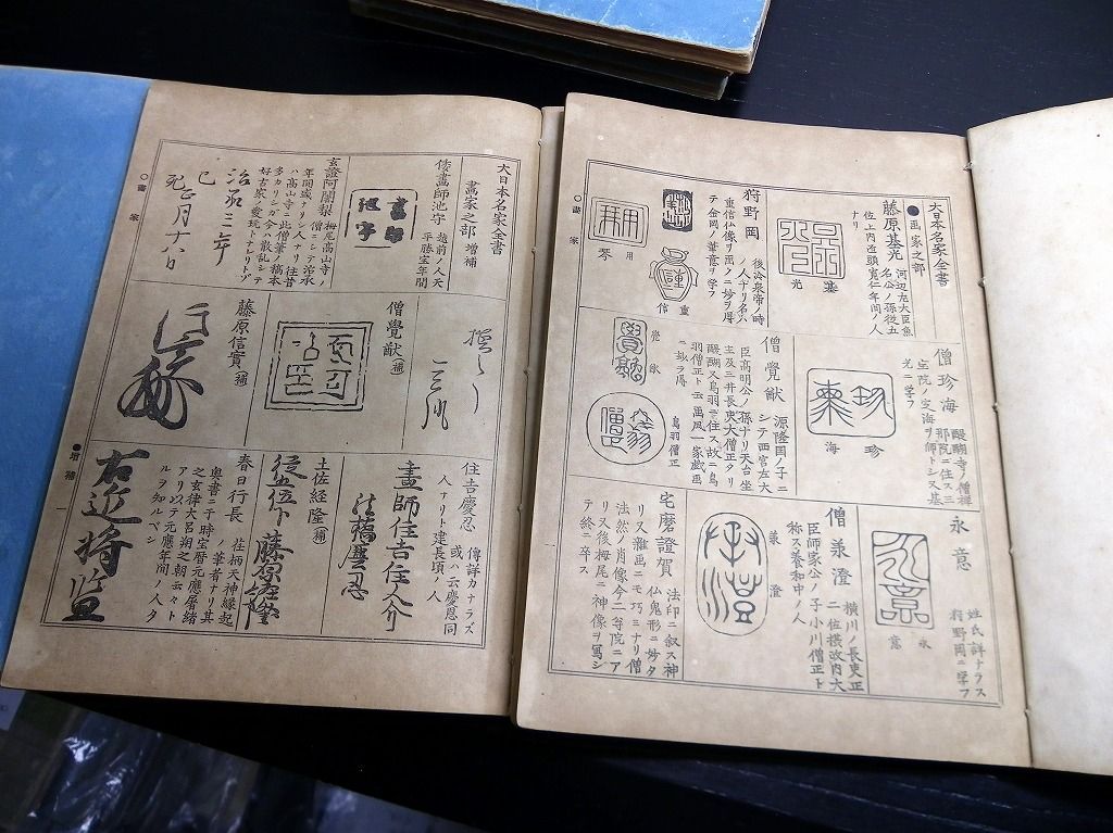 2019年08月31日 和本明治41年(1908)版落款印章事典「書画鑑定大日本名家全書」7冊揃/宮崎幸磨/古書古文書/和紙に活版 和本明治41年(1908)版落款印章事典「書画鑑定大日本名家全書」7冊揃/宮崎幸磨/古書古文書/和紙に活版です。 72、144、100、126、62、114、86頁。26cm×19cm。和紙に活版。元題簽。奥付あり。 『データ』 【書名】 書画鑑定大日本名家全書 【巻冊】 7冊揃 【著者】 宮崎幸磨 【成立】 明治41年(1908)版 タグ :#落款#印章#古書