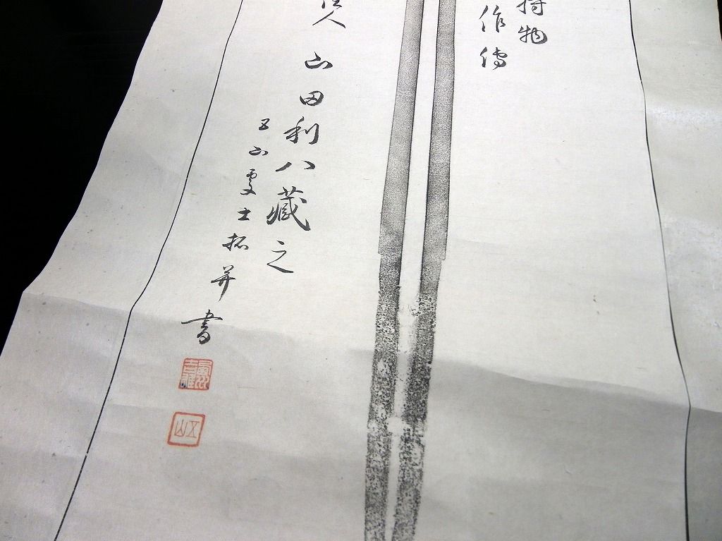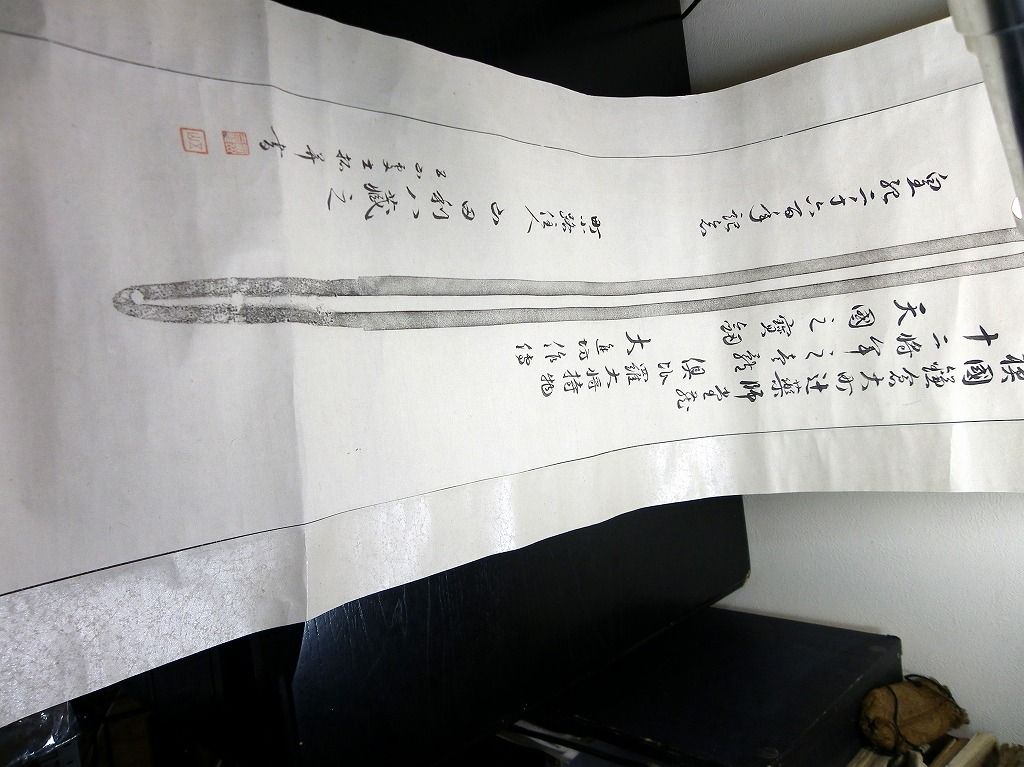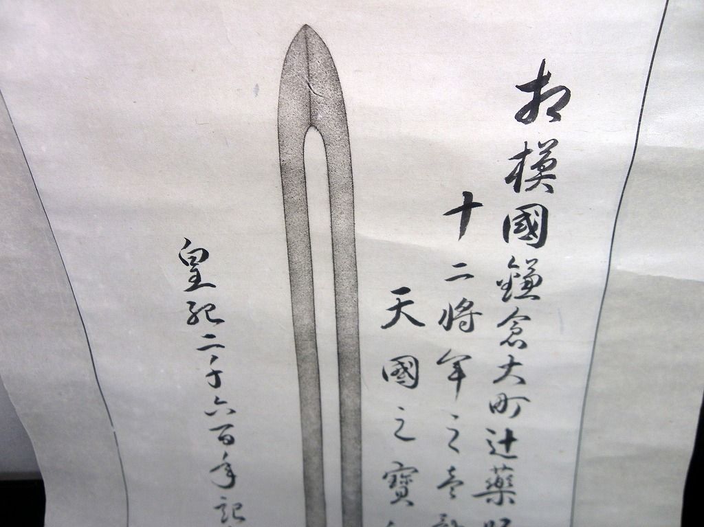 2019年08月17日 皇紀2600年(1940)掛け軸「相模国鎌倉大町辻薬師堂天国の宝剣」1点/山田利八/古書古文書/手書きと拓本 皇紀2600年(1940)掛け軸「相模国鎌倉大町辻薬師堂天国の宝剣」1点/山田利八/古書古文書/手書きと拓本です。 本紙の大きさが124cm×28cm。手書きと拓本。 『データ』 【書名】 相模国鎌倉大町辻薬師堂天国の宝剣 【巻冊】 1点 【著者】 山田利八 【成立】 皇紀2600年(1940) タグ :#掛け軸#掛軸