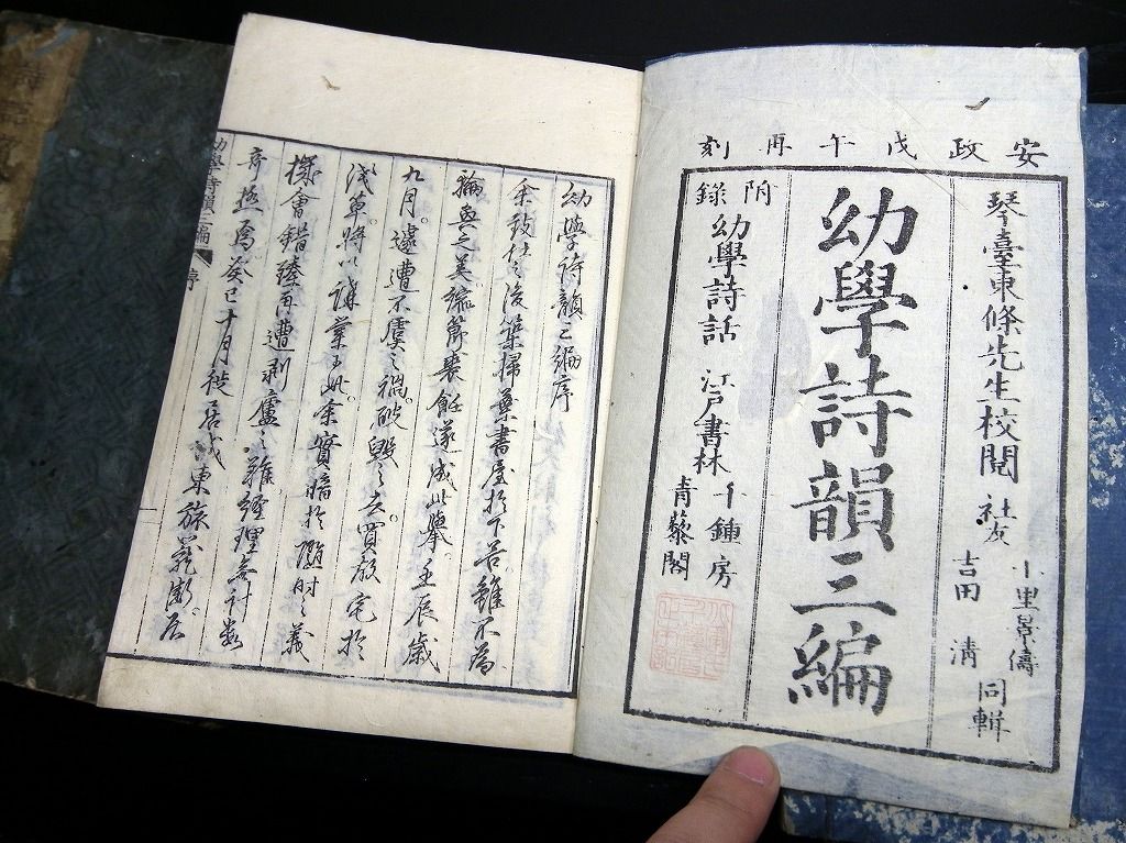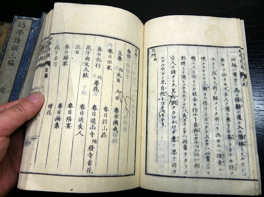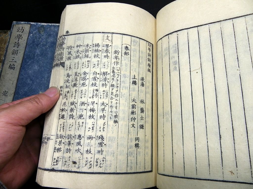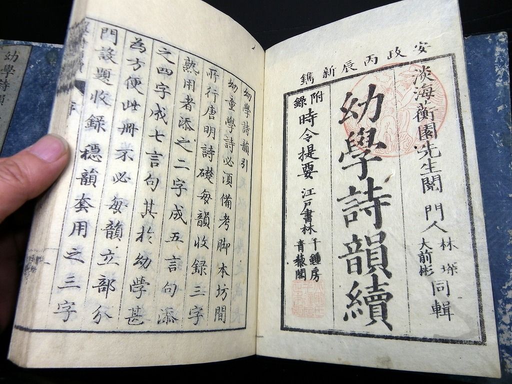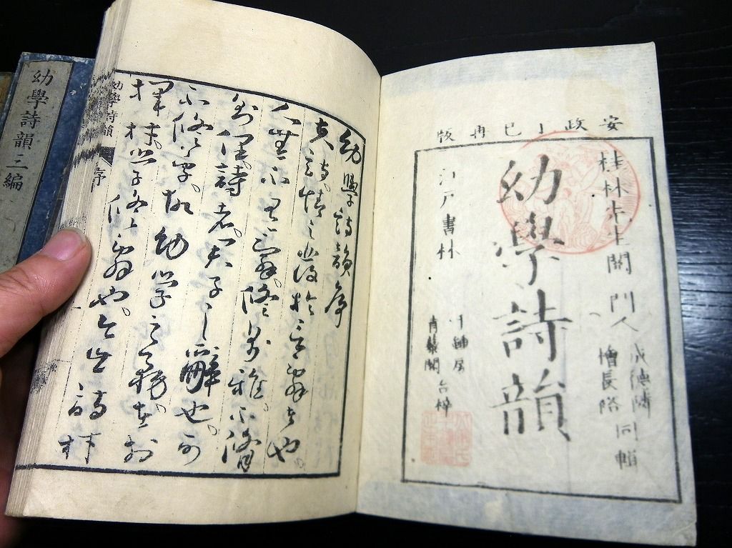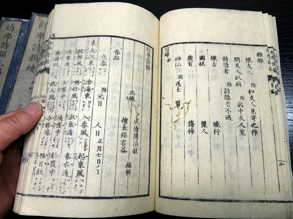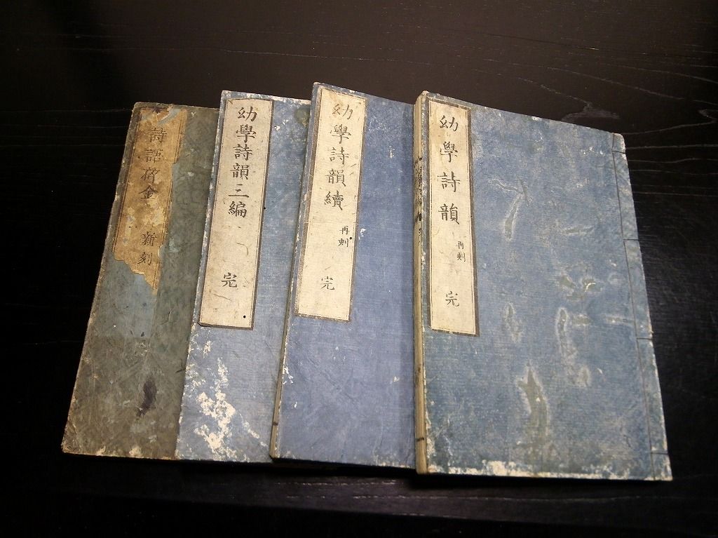2019年08月09日 和本江戸文化~安政漢詩文辞書「幼学詩韻/詩語碎金ほか」4冊/古書古文書/木版摺り 和本江戸文化~安政漢詩文辞書「幼学詩韻/詩語碎金ほか」4冊/古書古文書/木版摺りです。 3+2+48、3+3+52、2+4+50、9+21+31丁。半紙本。木版刷り。元題簽。見返しあり。奥付あり。 『データ』 【書名】 幼学詩韻/詩語碎金ほか 【巻冊】 幼学詩韻、幼学詩韻続、幼学詩韻3編、詩語碎金の4冊です 【成立】 文化~安政 タグ :#和本#漢詩
