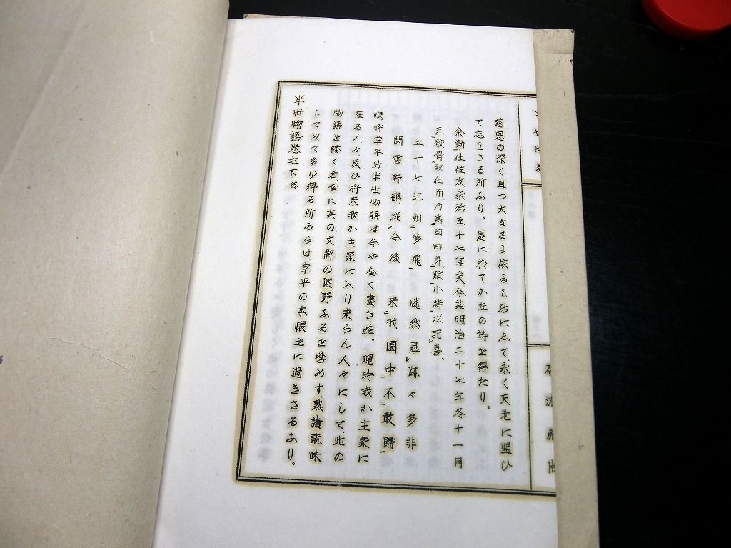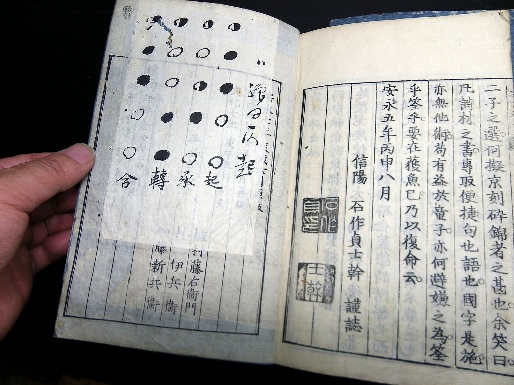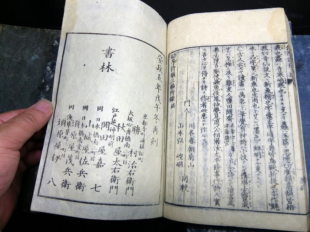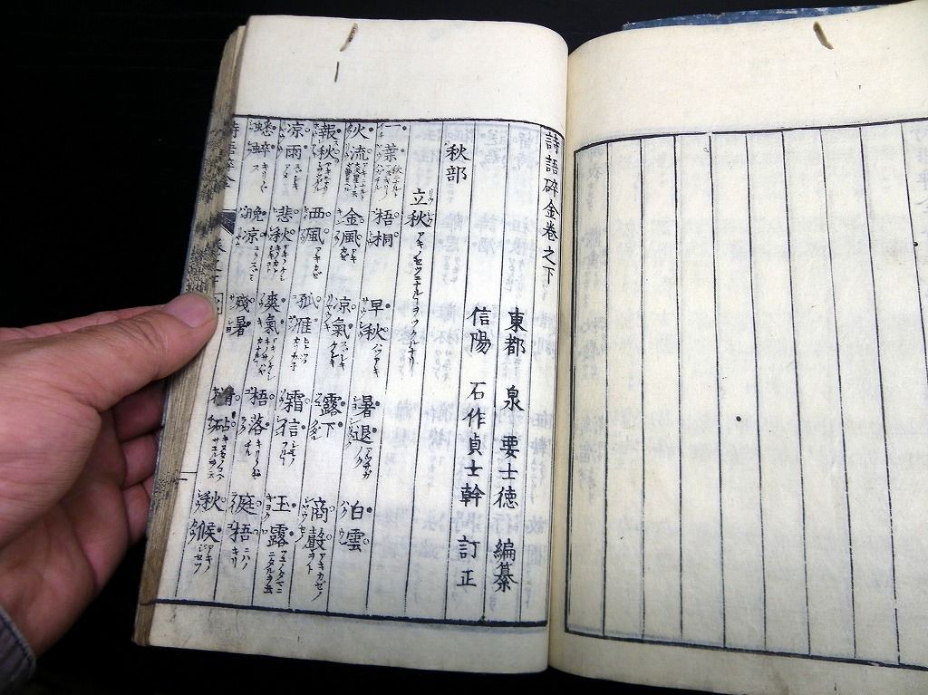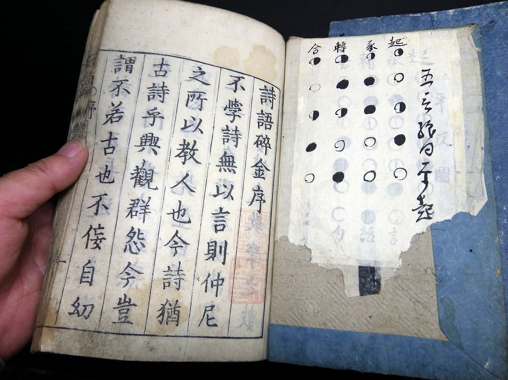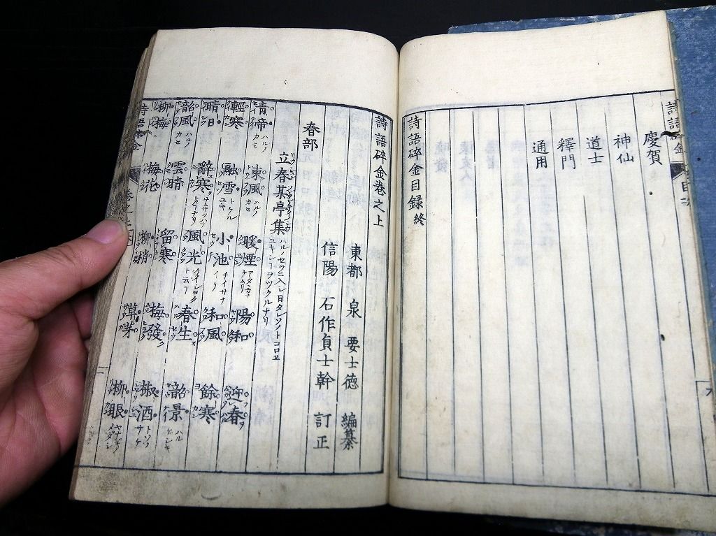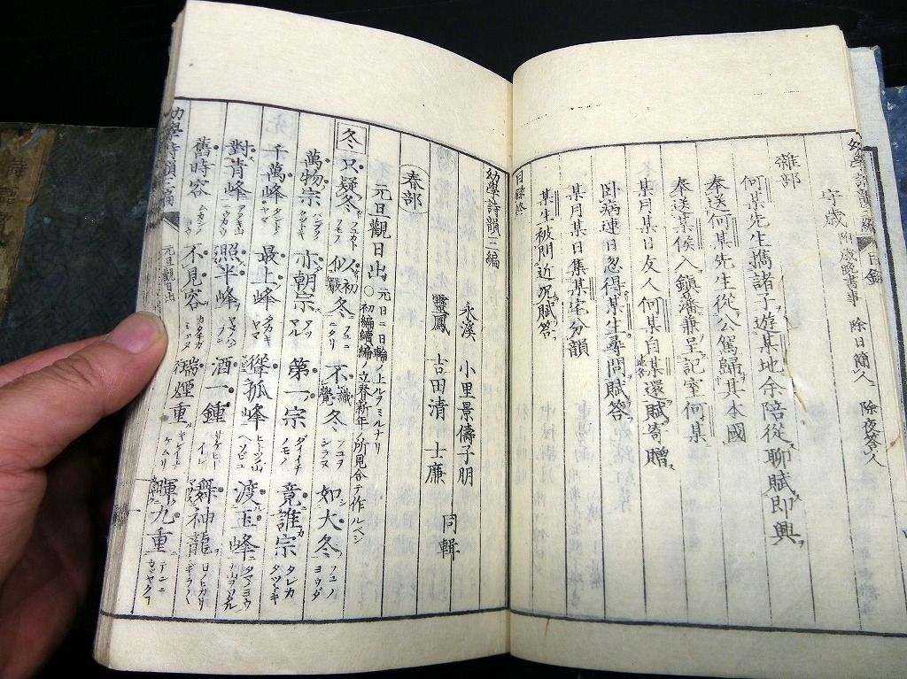 2019年08月09日 和本江戸文化~安政漢詩文辞書「幼学詩韻/詩語碎金ほか」4冊/古書古文書/木版摺り 和本江戸文化~安政漢詩文辞書「幼学詩韻/詩語碎金ほか」4冊/古書古文書/木版摺りです。 3+2+48、3+3+52、2+4+50、9+21+31丁。半紙本。木版刷り。元題簽。見返しあり。奥付あり。 『データ』 【書名】 幼学詩韻/詩語碎金ほか 【巻冊】 幼学詩韻、幼学詩韻続、幼学詩韻3編、詩語碎金の4冊です 【成立】 文化~安政 タグ :#和本#漢詩