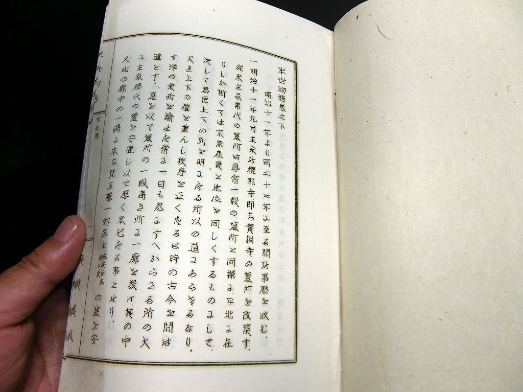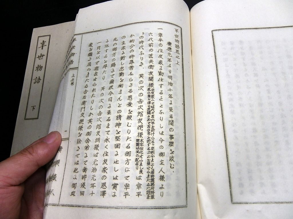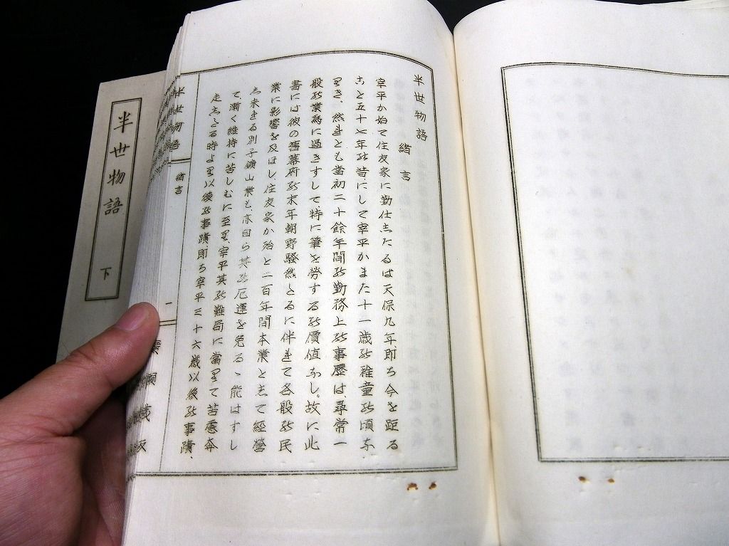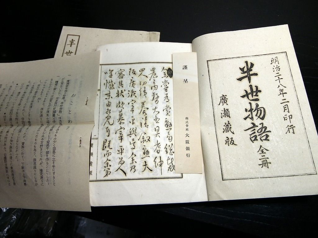 2019年08月31日 和本昭和25年(1950)住友財閥筆頭番頭広瀬宰平自伝「半生物語」上下2冊揃/非売品/古書/謄写版/ガリ版 和本昭和25年(1950)住友財閥筆頭番頭広瀬宰平自伝「半生物語」上下2冊揃/非売品/古書/謄写版/ガリ版です。 3+4+2+53、48丁。24cm×16.5cm。謄写版。奥付あり。 『データ』 【書名】 半生物語 【巻冊】 上下2冊揃 【著者】 広瀬宰平(実業家。住友家の筆頭番頭。11歳で別子銅山勘定場の給仕となり,明治維新に際し別子銅山を新政府の没収から守った。住友家事業の近代化を図り,住友財閥発展の基礎を築いた。五代友厚らと大阪商法会議所,大阪株式取引所,大阪商業講習所(大阪市立大学の前身),大阪商船会社などを設立。)の自伝 【成立】 昭和25年(1950) タグ :#和本#ガリ版#謄写版#住友財閥