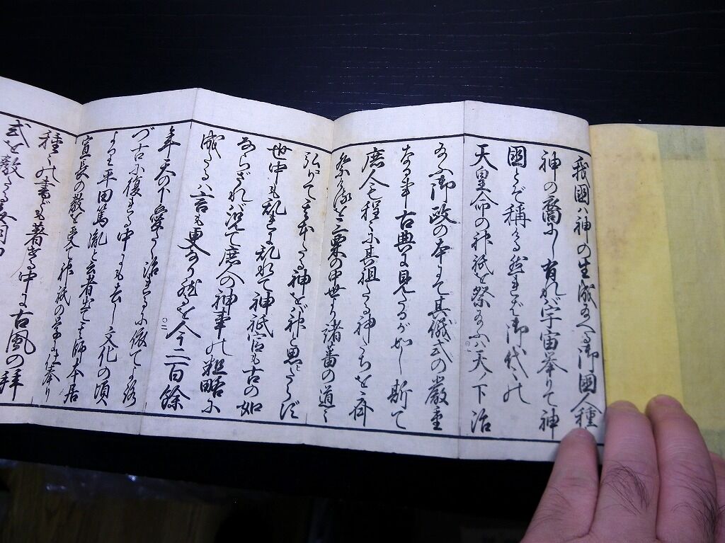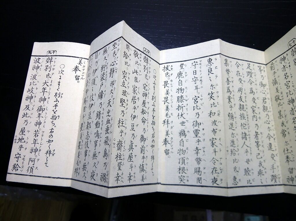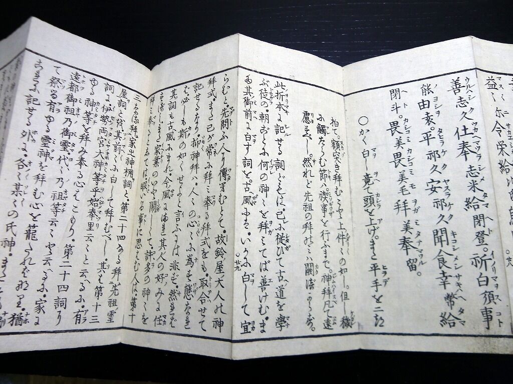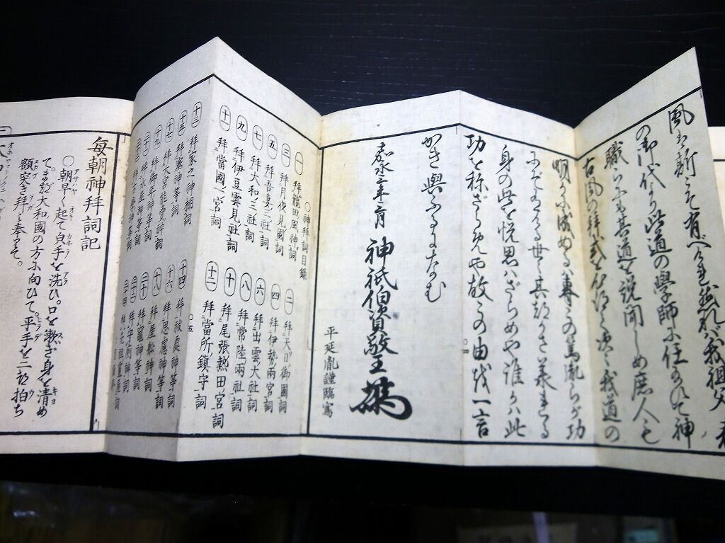 2021年05月31日 和本江戸嘉永3年(1850)序折本「毎朝神拝詞記」全1帖/国学/神道/祝詞/平田篤胤/古書古文書/木版摺り 和本江戸嘉永3年(1850)序折本「毎朝神拝詞記」全1帖/国学/神道/祝詞/平田篤胤/古書古文書/木版摺りです。32丁。17cm×7.5cm。木版刷り。元題簽。『データ』【書名】 毎朝神拝詞記【巻冊】 全1帖【著者】 平田篤胤【成立】 嘉永3年(1850)序 タグ :#和本#国学#神道#平田篤胤