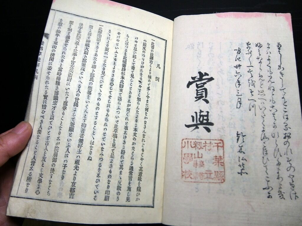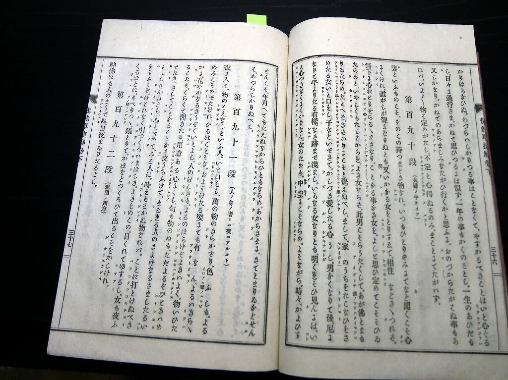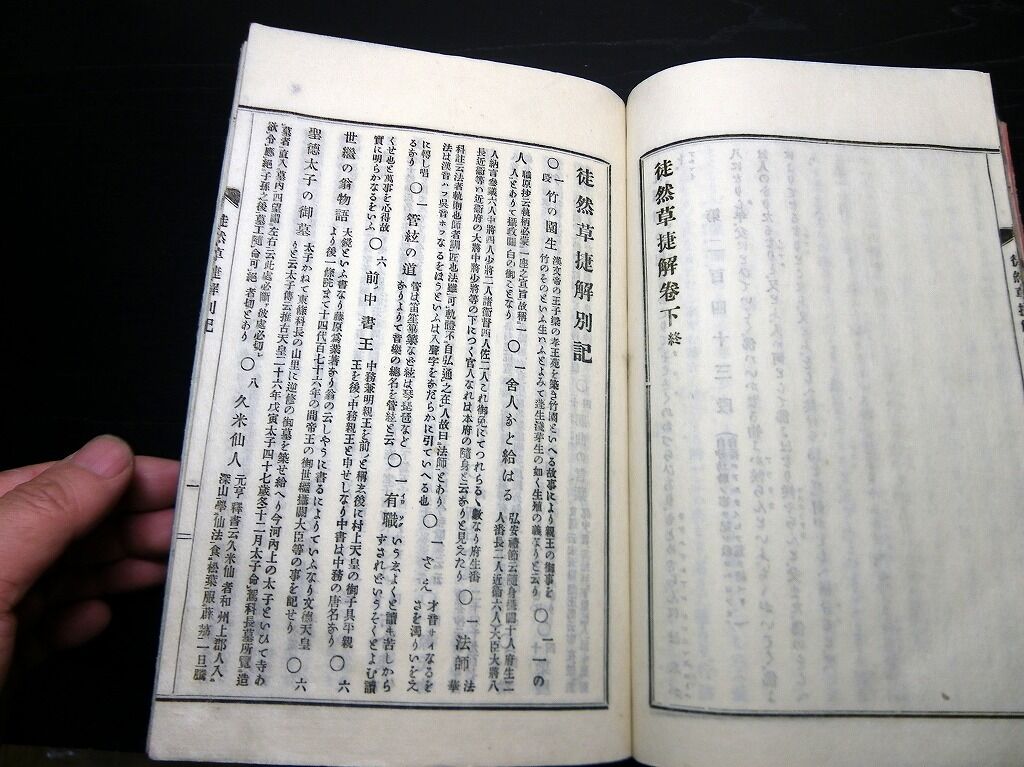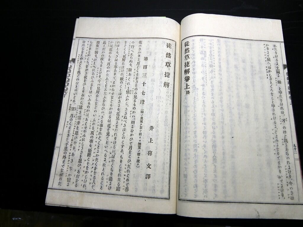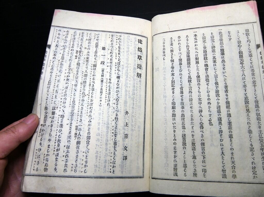 2021年05月31日 和本明治27年(1894)古典注釈「徒然草捷解」全1冊/井上喜文/古書古文書/和紙に活版 和本明治27年(1894)古典注釈「徒然草捷解」全1冊/井上喜文/古書古文書/和紙に活版です。2+92+68+14頁。半紙本。和紙に活版。元題簽。見返しあり。奥付あり。『データ』【書名】 徒然草捷解【巻冊】 全1冊【著者】 井上喜文【成立】 明治27年(1894) タグ :#和本
