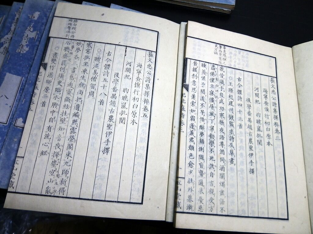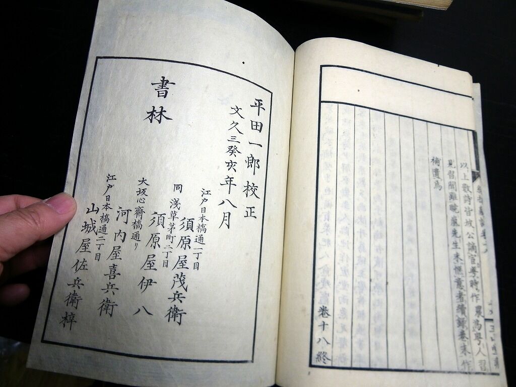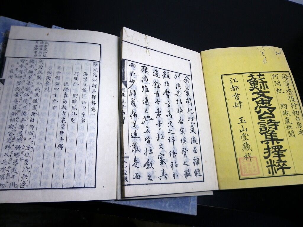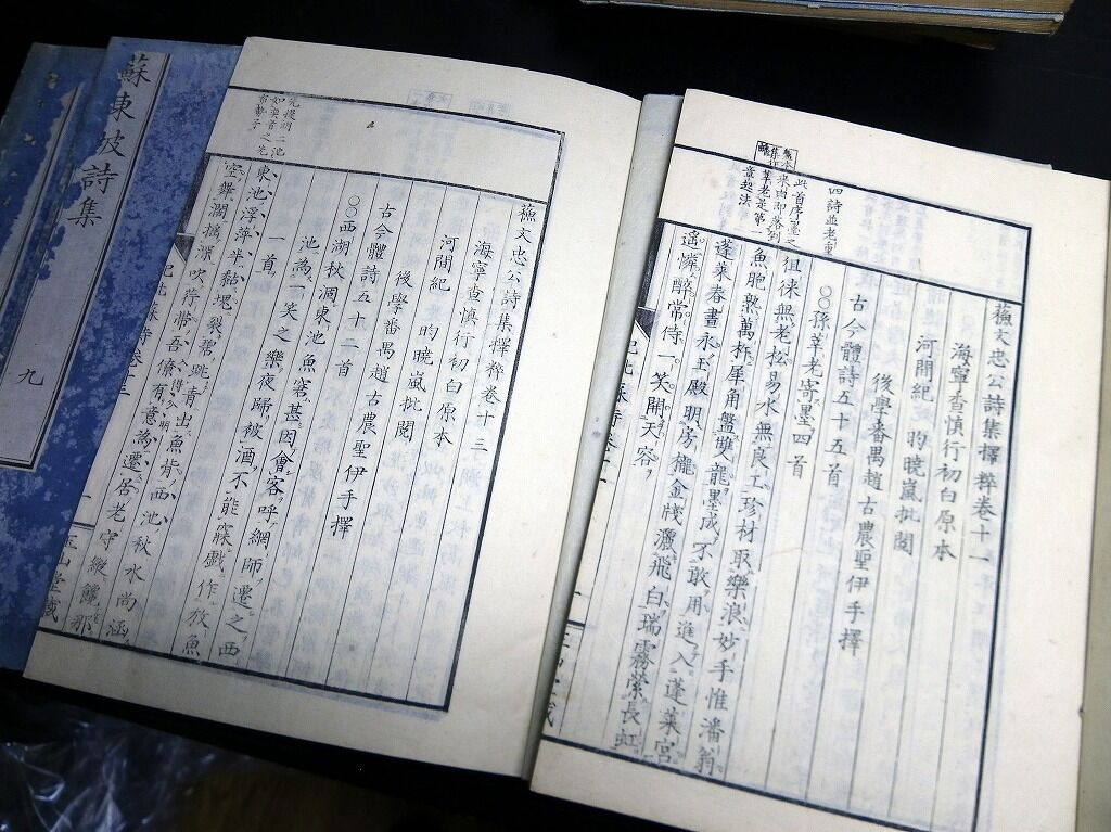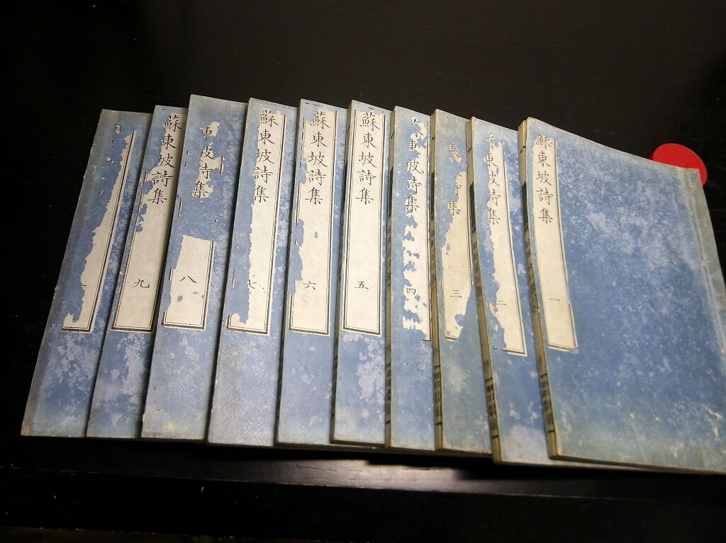 2022年02月11日 和本江戸文久3年(1863)中国漢詩「蘇東坡詩集(蘇文忠公詩集擇粹)」10冊揃い/古書古文書/木版摺り 和本江戸文久3年(1863)中国漢詩「蘇東坡詩集(蘇文忠公詩集擇粹)」10冊揃い/古書古文書/木版摺りです。2+4+28、16+16、14+16、16+14、17+14、16+18、18+15、16+12、18+14、14+16丁。大本。木版刷り。元題簽傷み欠損あり。見返しあり。奥付あり。『データ』【書名】 蘇東坡詩集(蘇文忠公詩集擇粹)【巻冊】 10冊揃【著者】 蘇東坡【成立】 文久3年(1863) タグ :#和本#漢詩