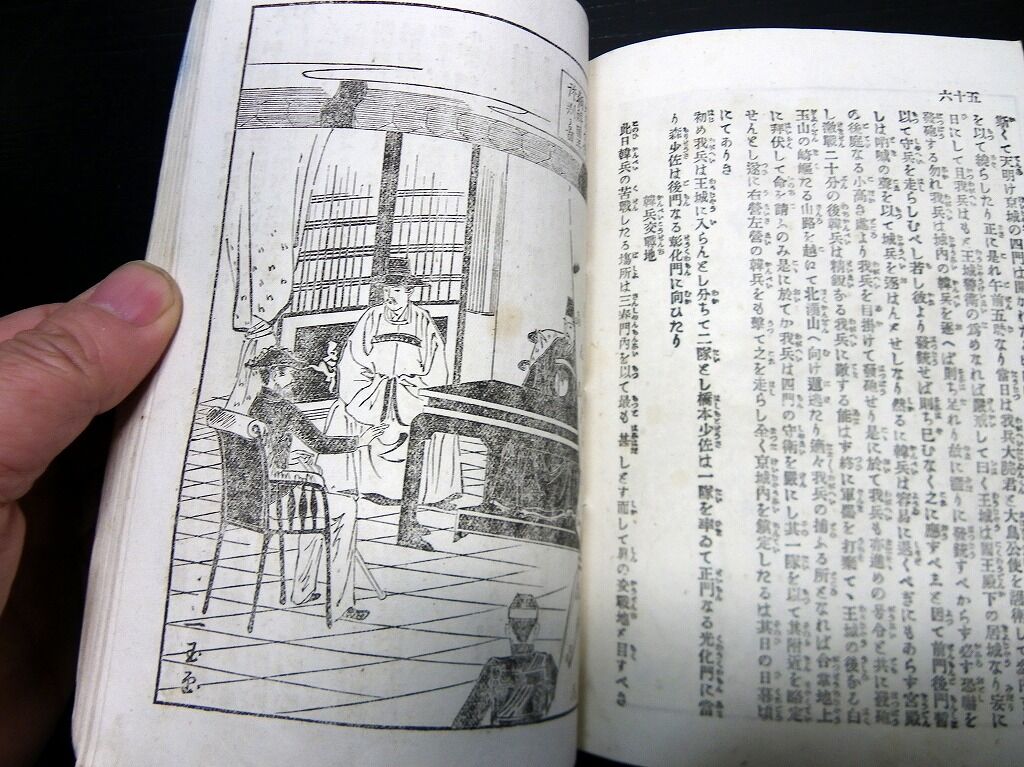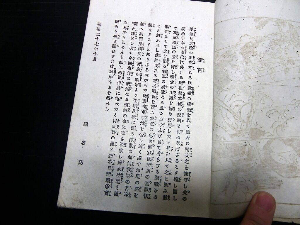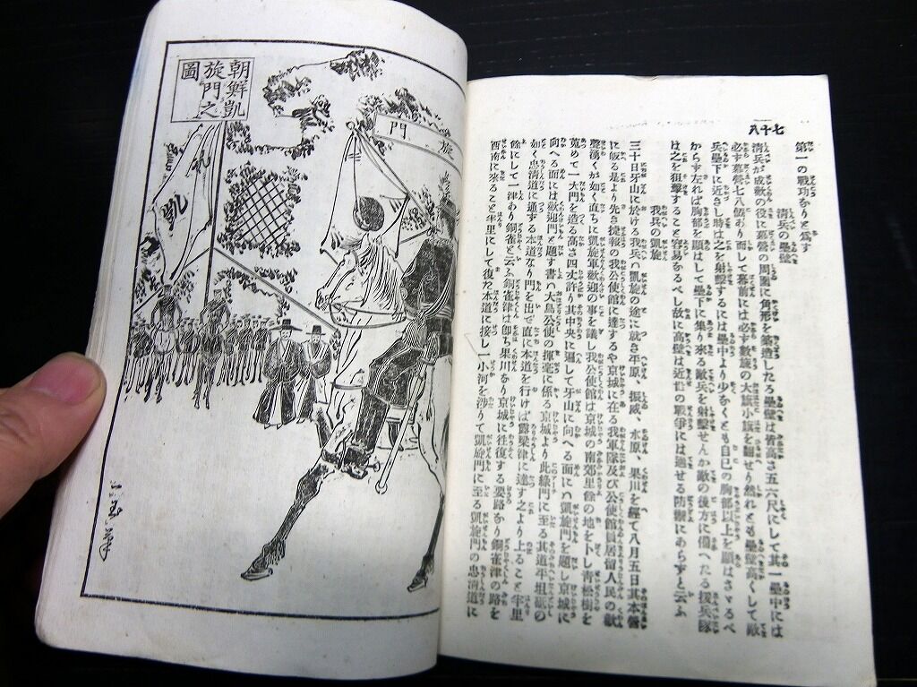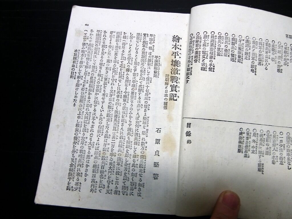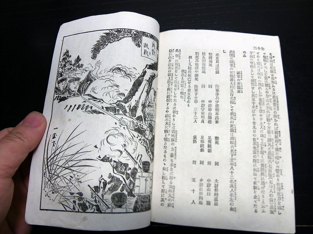 2022年02月28日 明治27年(1894)絵入古書「絵本日清戦争実記」第2編1冊/石原貞堅 明治27年(1894)絵入古書「絵本日清戦争実記」第2編1冊/石原貞堅です。3+99頁。18cm×12cm。奥付あり。『データ』【書名】 絵本日清戦争実記【巻冊】 第2編、1冊です【著者】 石原貞堅【成立】 明治27年(1894) タグ :#日清戦争#古書