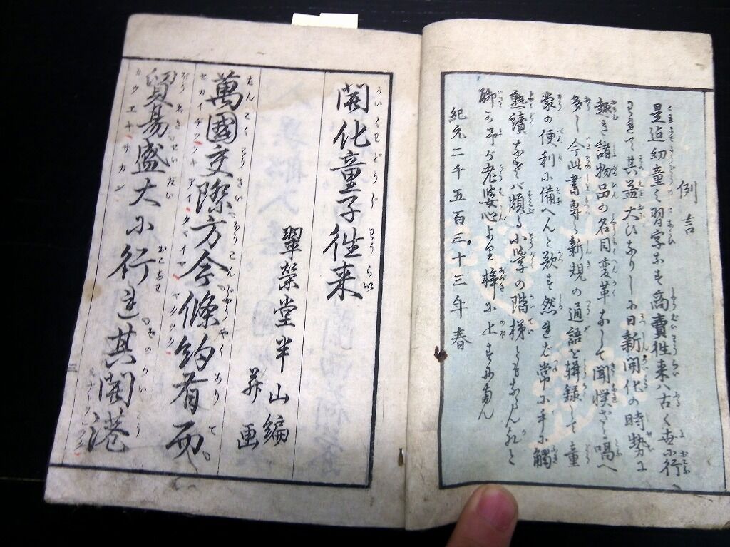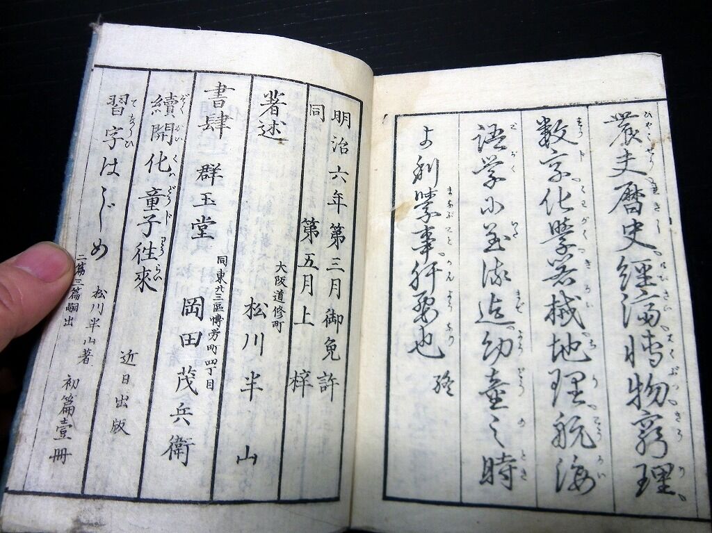 2022年02月28日 和本明治6年(1873)往来物「開化童子往来」全1冊/松川半山/絵入古書古文書/木版摺り 和本明治6年(1873)往来物「開化童子往来」全1冊/松川半山/絵入古書古文書/木版摺りです。30丁。中本。木版刷り。奥付あり。『データ』【書名】 開化童子往来【巻冊】 全1冊【著者】 松川半山【成立】 明治6年(1873) タグ :#和本#往来物#古書#古文書