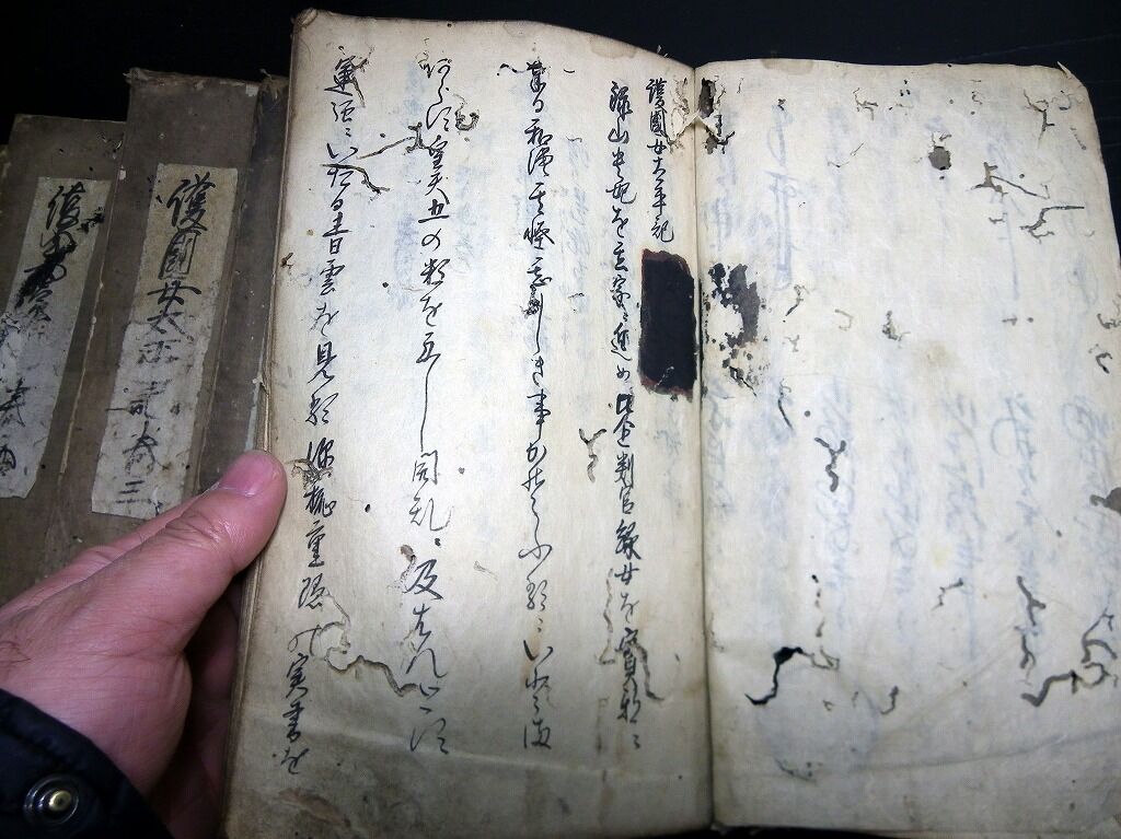 2022年02月15日 和本江戸天保3年(1832)大坂の陣写本「厭蝕太平楽記」全35巻16冊揃/真田幸村/古書古文書/手書き 和本江戸天保3年(1832)大坂の陣写本「厭蝕太平楽記」全35巻16冊揃/真田幸村/古書古文書/手書きです。57、72、63、54、56、54、44、49、48、61、39、48、49、50、52、41丁。半紙本程度。手書き。元題簽傷みあり。『データ』【書名】 厭蝕太平楽記【巻冊】 全35巻16冊揃【成立】 天保3年(1832)写 タグ :#和本#大坂の陣#写本#真田幸村#真田丸