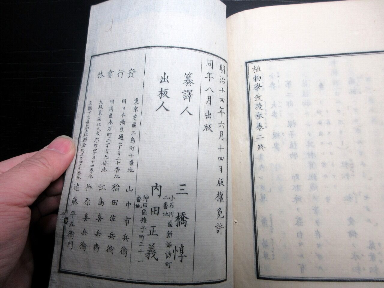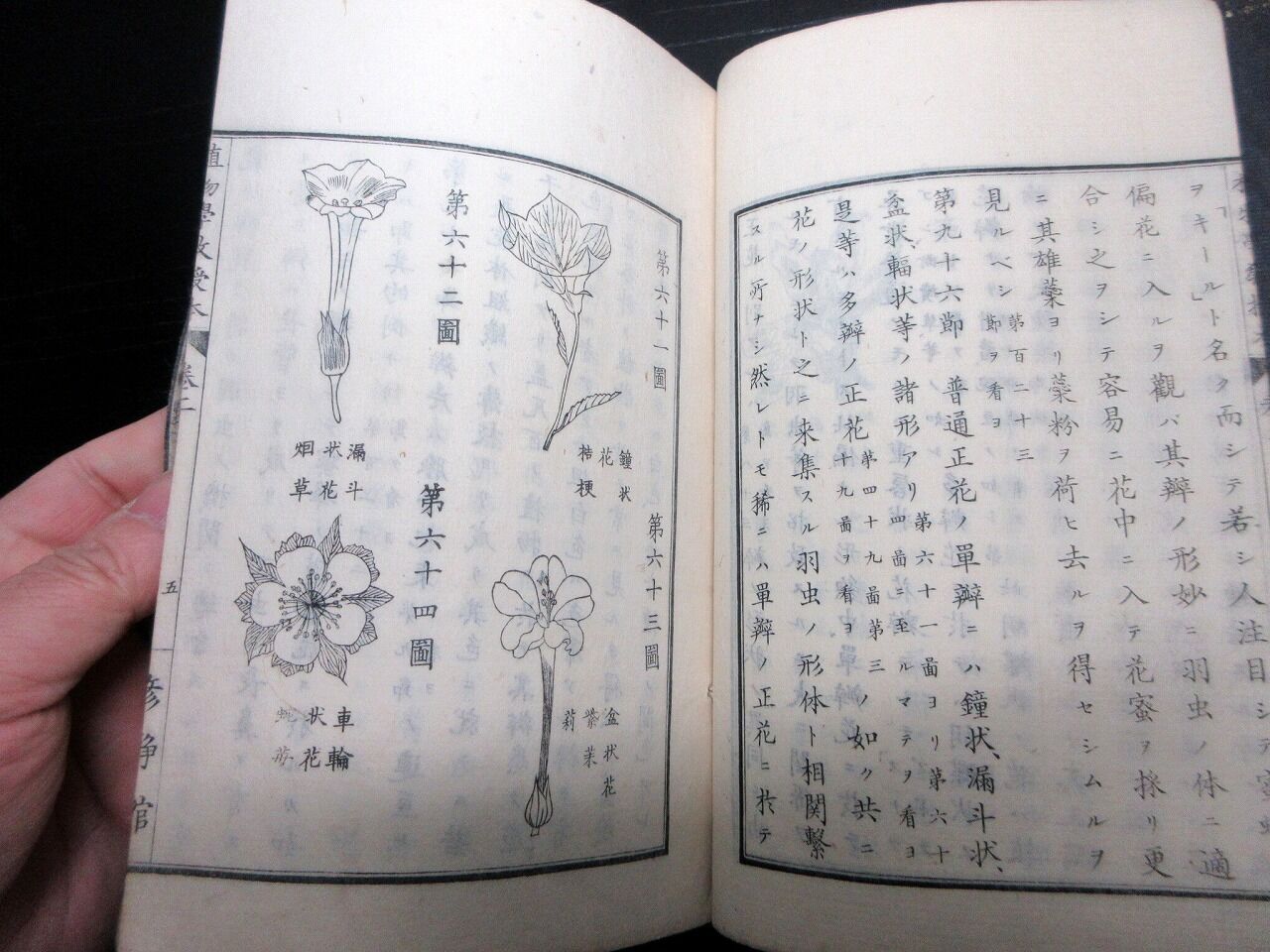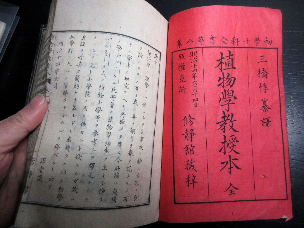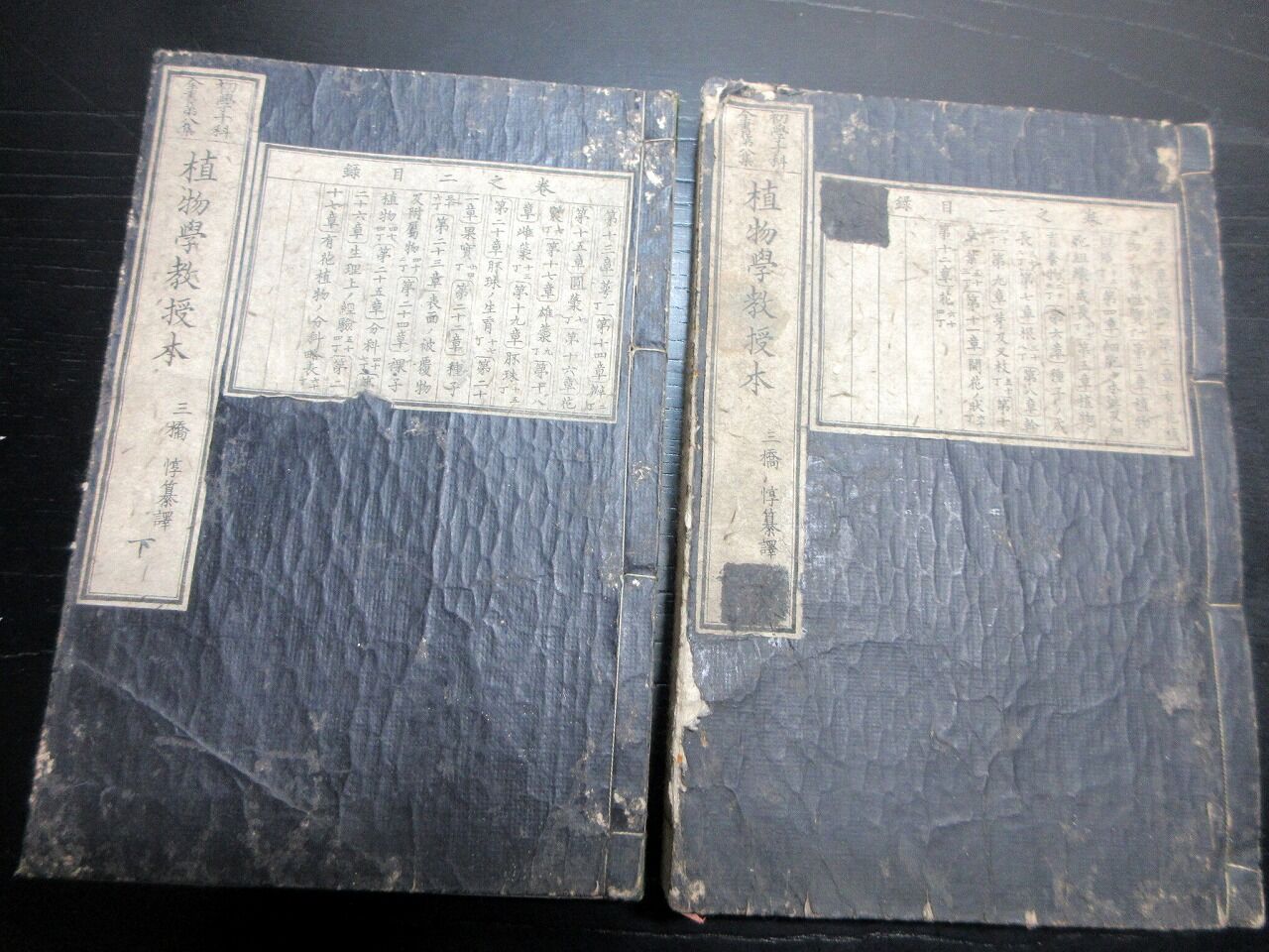 2024年03月02日 和本明治14年(1881)「植物学教授本」上下2冊揃い/三橋惇/古書古文書/木版摺り 和本明治14年(1881)「植物学教授本」上下2冊揃い/三橋惇/古書古文書/木版摺りです。1+2+79、69丁。22.5cm×15cm。木版刷り。元題簽。見返しあり。奥付あり。【書名】 植物学教授本【巻冊】 上下2冊揃い【著者】 三橋惇 纂訳【成立】 明治14年(1881) タグ :#和本#理科#JAPAN#antiquebooks