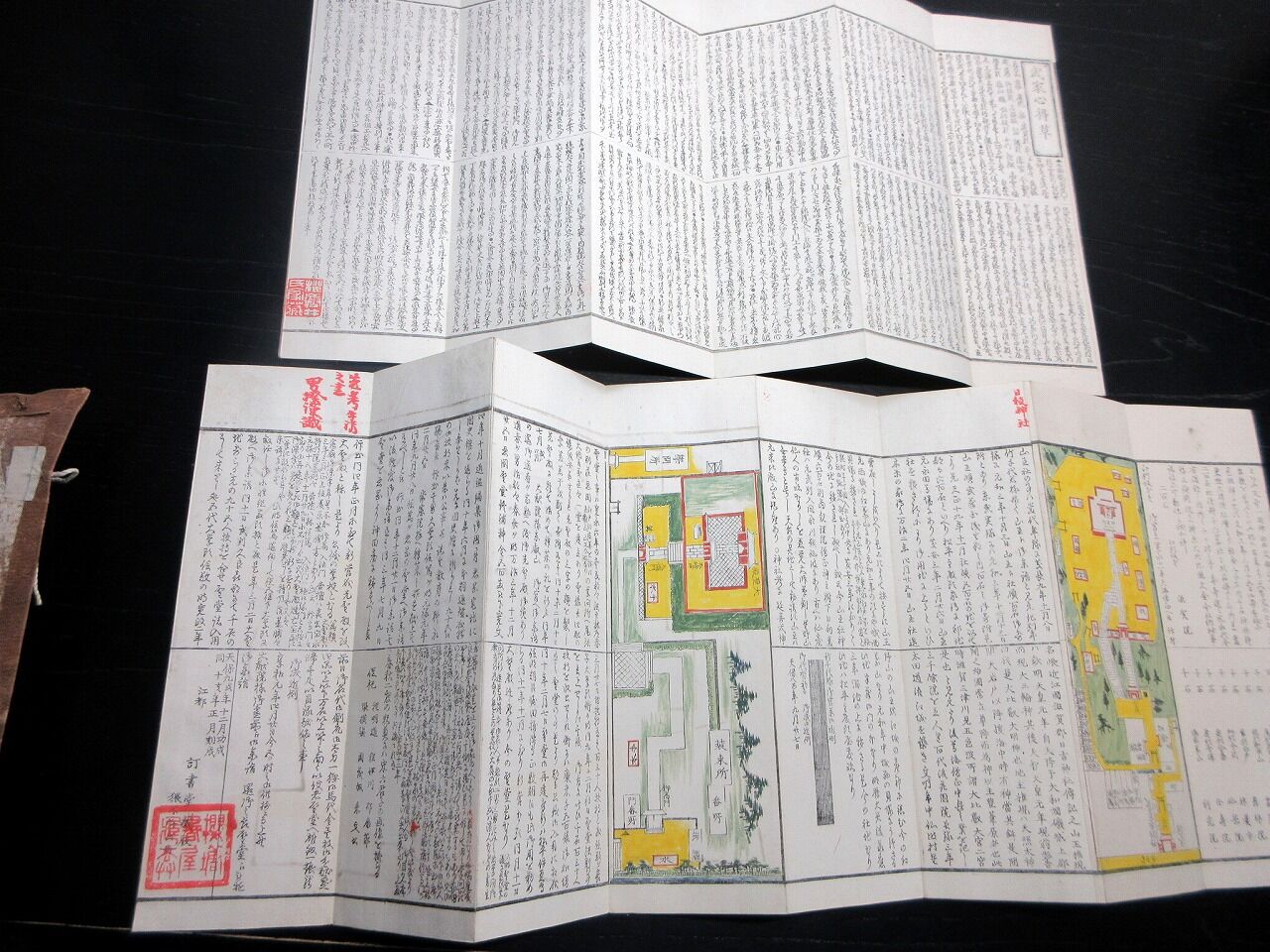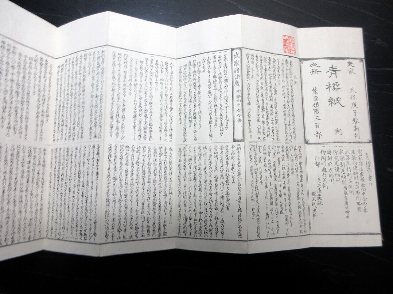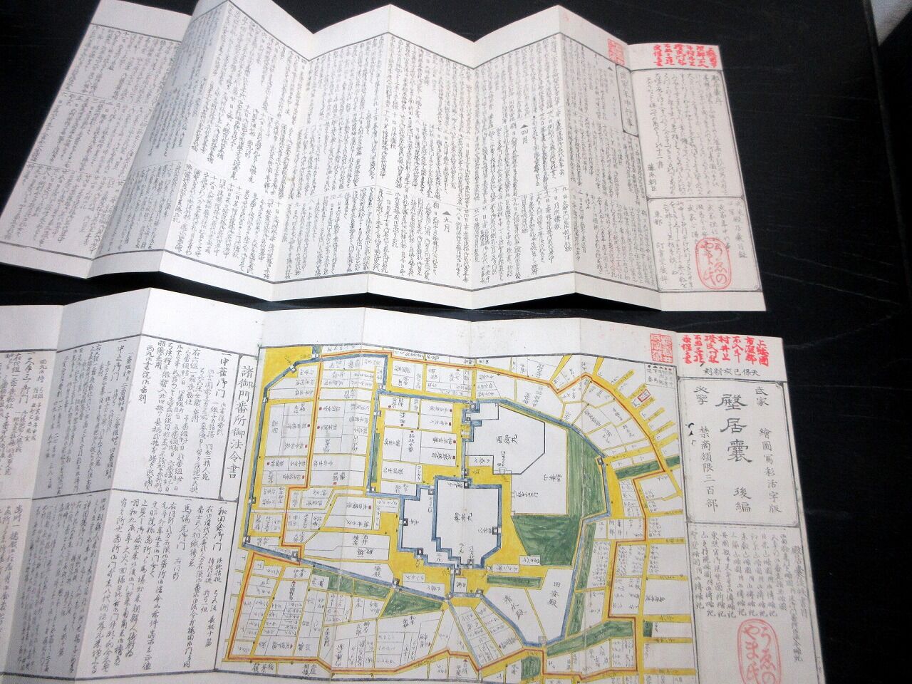 2024年03月01日 和本江戸天保10~11年武家故実折本「殿居袋/青標紙」3帖/大野広城/古地図/古書古文書/木版両面摺り(手彩色) 和本江戸天保10~11年武家故実折本「殿居袋/青標紙」3帖/大野広城/古地図/古書古文書/木版両面摺り(手彩色)です。18、17、21丁。19.5cm×6cm。木版両面刷り(手彩色)。元題簽。見返しあり。奥付あり。上総国市原郡の書き入れがある。【書名】 殿居袋/青標紙【巻冊】 殿居袋2帖と青標紙1帖の3帖【著者】 大野広城【成立】 天保10~11年 タグ :#和本#武家故実#JAPAN#antiquebooks#Antiquemap