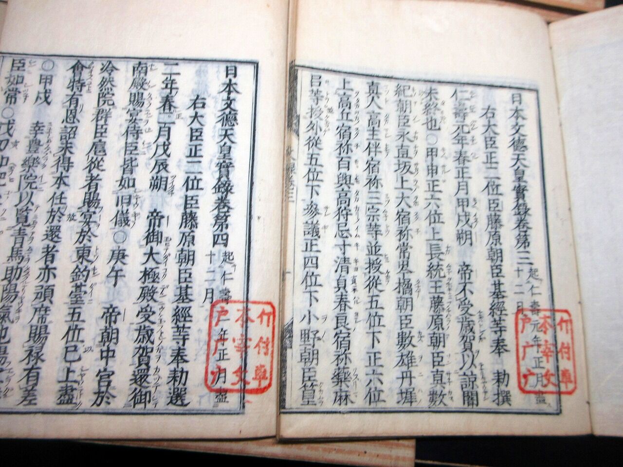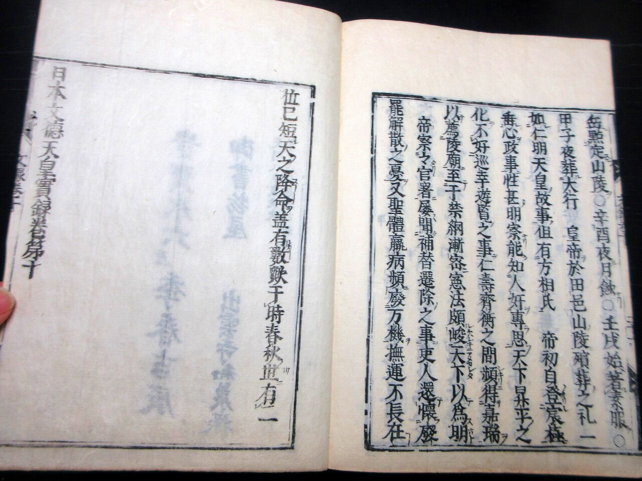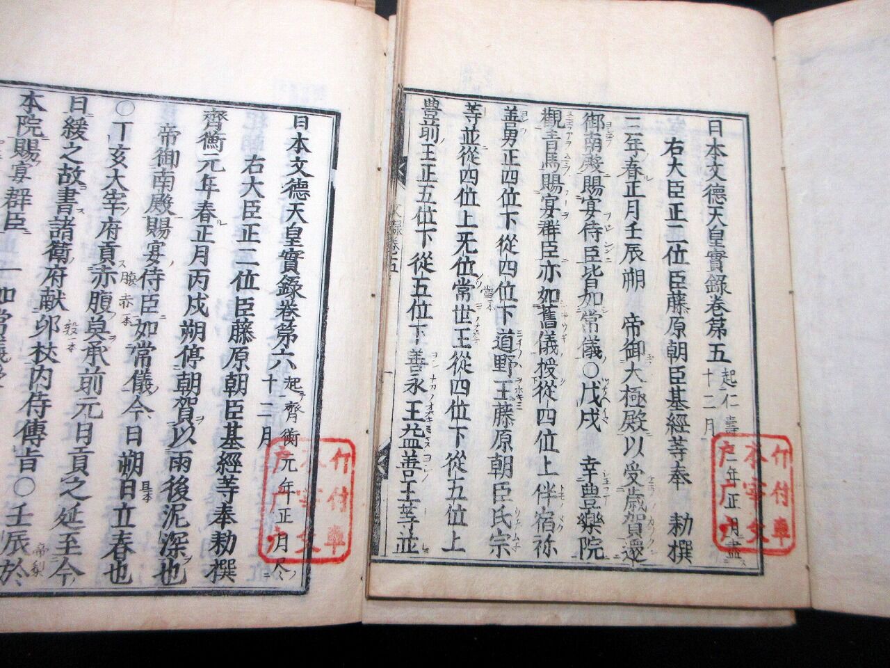 2025年08月29日 和本江戸寛政8年(1796)平安時代の歴史書「文徳実録(日本文徳天皇実録)」10冊揃い/本所宰府文庫の蔵書印/亀戸天神社 和本江戸寛政8年(1796)平安時代の歴史書「文徳実録(日本文徳天皇実録)」10冊揃い/本所宰府文庫の蔵書印/亀戸天神社です。2+23、19、19、21、22、18、18、23、34、27丁。27cm×19cm。木版刷り。平安時代の日本で編纂された歴史書。六国史の第五にあたり、文徳天皇の代である嘉祥3年(850年)から天安2年(858年)までの8年間を扱う。略して文徳実録ともいう。編年体、漢文、全10巻。【書名】 文徳実録(日本文徳天皇実録)【巻冊】 10冊揃い【著者】 本所宰府文庫の蔵書印。亀戸天神社関連の旧蔵書のようです。【成立】 寛政8年(1796) タグ :#和本#亀戸天神#本所宰府文庫#JAPAN#Antiquebooks#日本の古本屋#大江戸骨董市