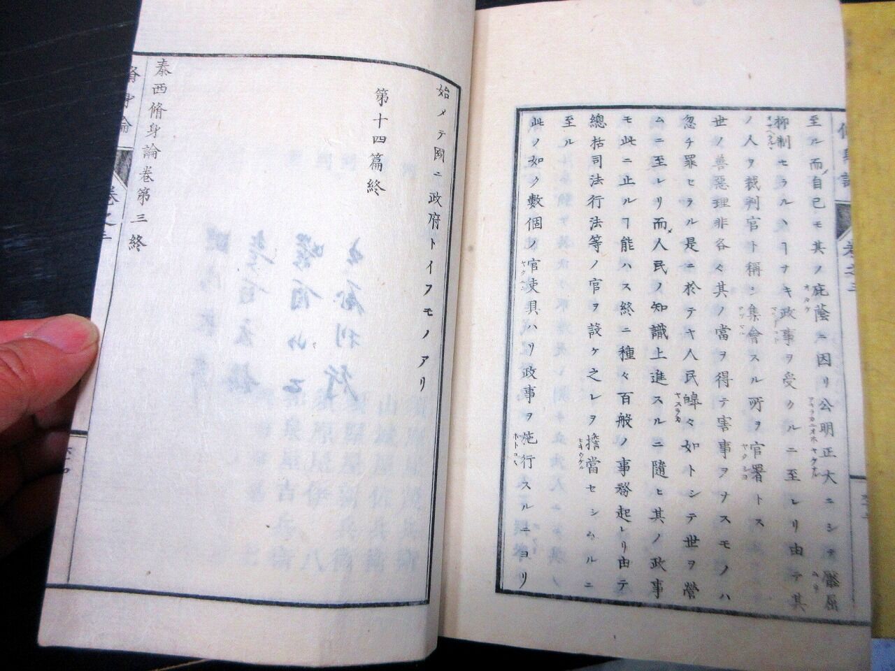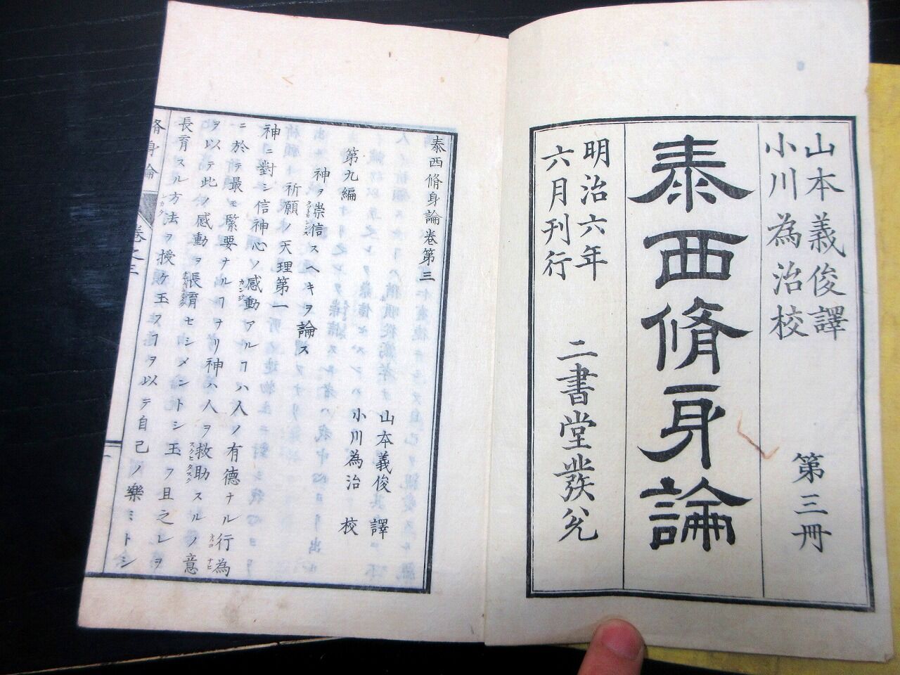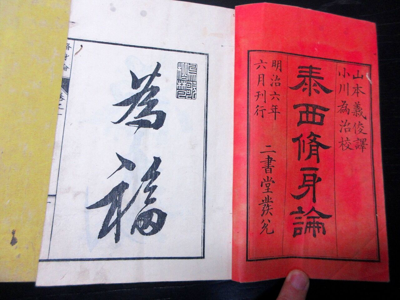 2025年08月15日 和本明治6年(1873)「泰西修身論」3冊揃い/山本義俊訳/古書古文書/木版摺り 和本明治6年(1873)「泰西修身論」3冊揃い/山本義俊訳/古書古文書/木版摺りです。13+38、47、64丁。22.5cm×15cm。木版刷り。元題簽2冊残存。見返しあり。奥付あり。【書名】 泰西修身論【巻冊】 3冊揃い【著者】 山本義俊 訳 小川為治 校【成立】 明治6年(1873) タグ :#和本#西洋#道徳#JAPAN#Antiquebooks#日本の古本屋#大江戸骨董市