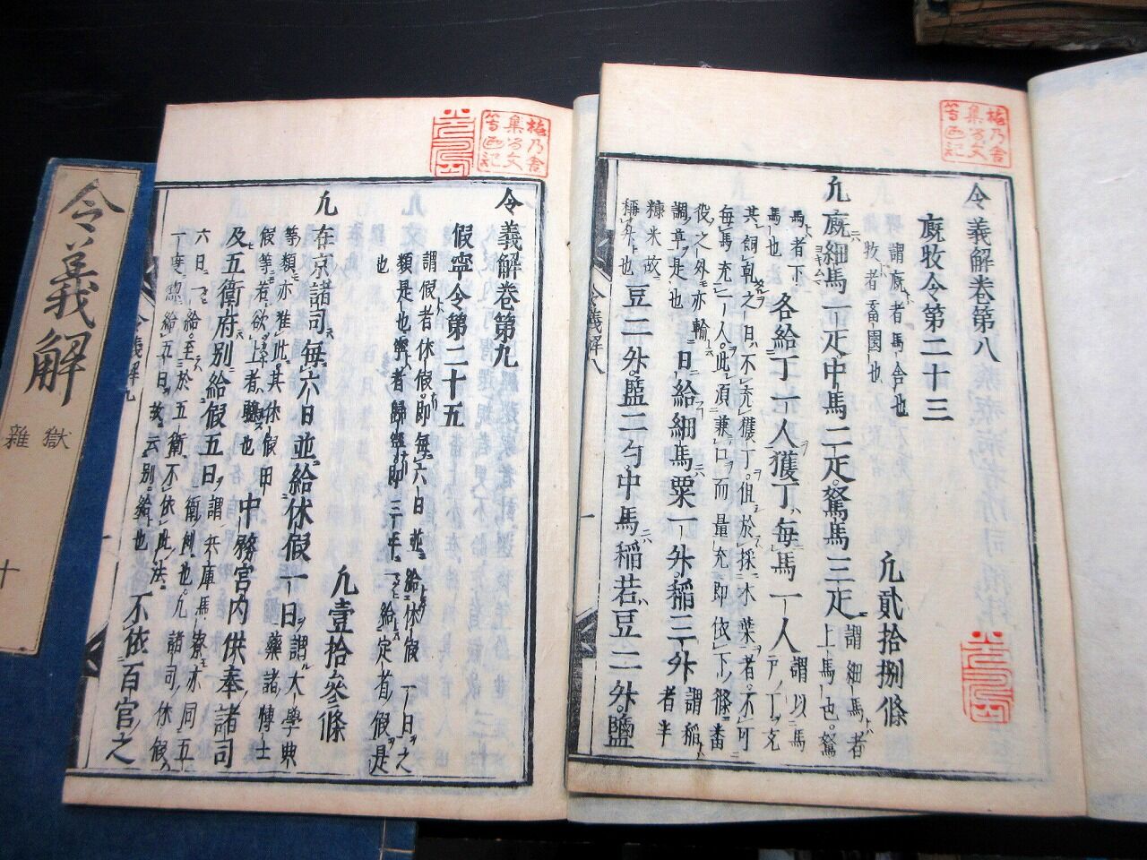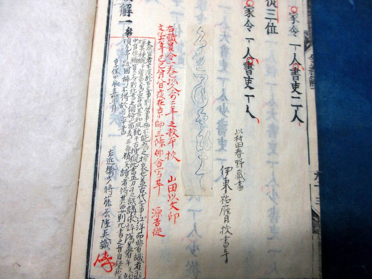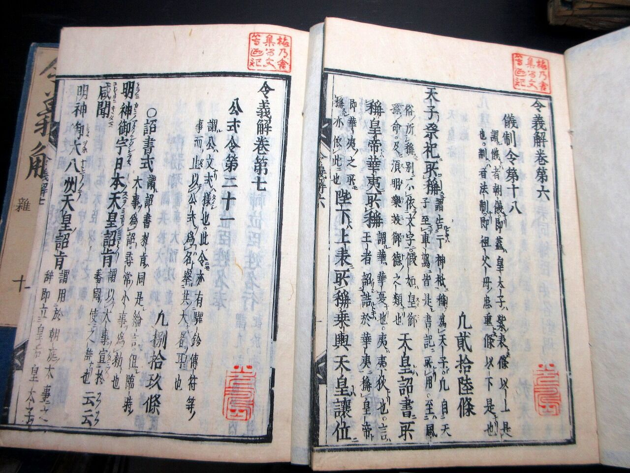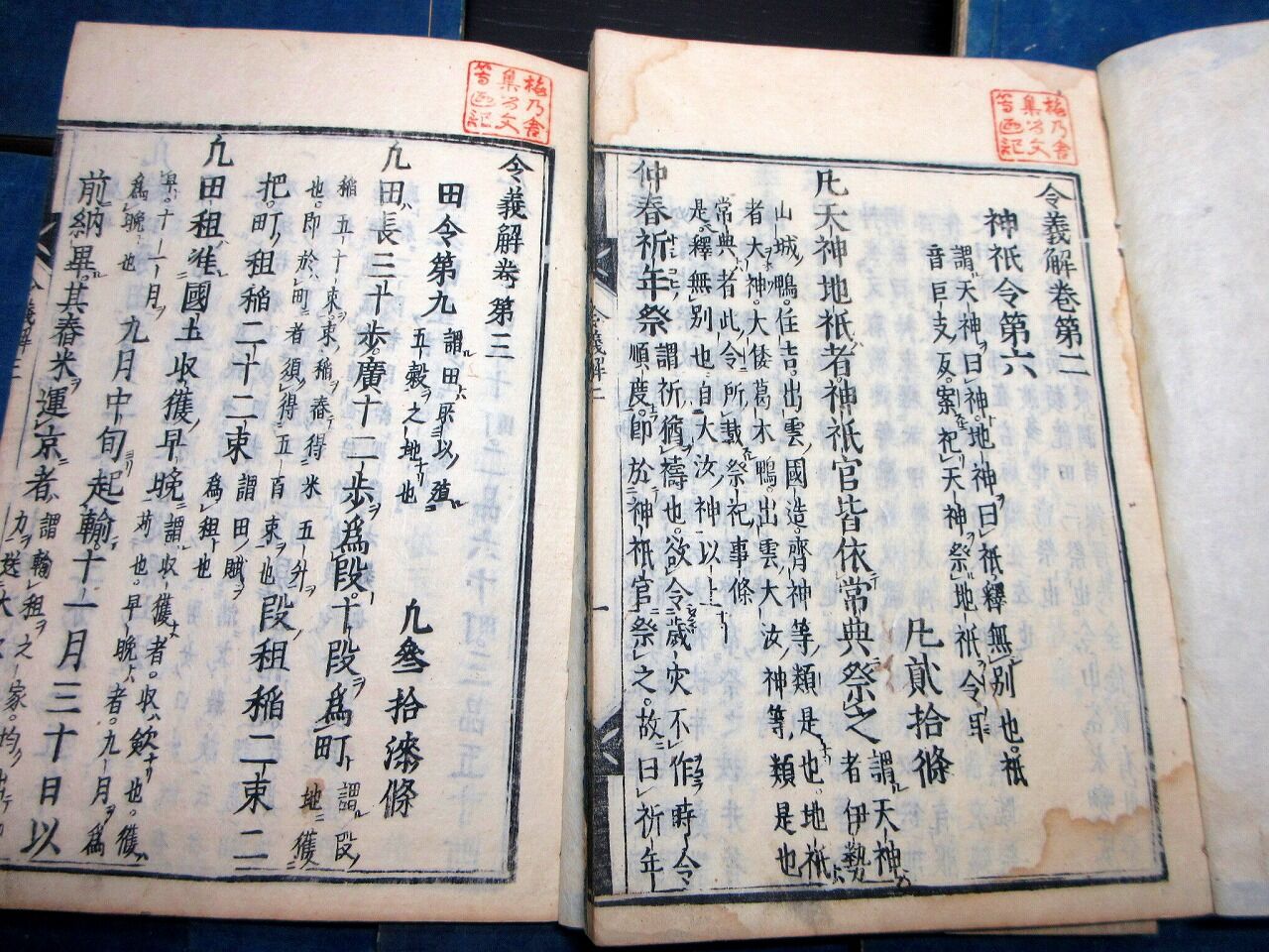 2025年08月29日 和本江戸慶安3年跋(1650)律令制度「令義解」11冊揃い/飫肥藩交代寄合/伊東祐膺旧蔵書/古書古文書/木版摺り 和本江戸慶安3年跋(1650)律令制度「令義解」11冊揃い/飫肥藩交代寄合/伊東祐膺旧蔵書/古書古文書/木版摺りです。37、56、34、30、44、31、22、39、9、18、36+2丁。26cm×18cm。木版刷り。元題簽。養老令の官撰の注釈書。伊東祐膺旧蔵書。伊東祐膺は飫肥藩交代寄合伊東勝之助家10代目。江戸後期の人。巻1下に本人の書き入れがたくさんある。【書名】 令義解【巻冊】 11冊揃い【成立】 慶安3年跋(1650) タグ :#和本#律令制度#伊東祐膺#飫肥藩交代寄合#JAPAN#Antiquebooks#日本の古本屋#大江戸骨董市