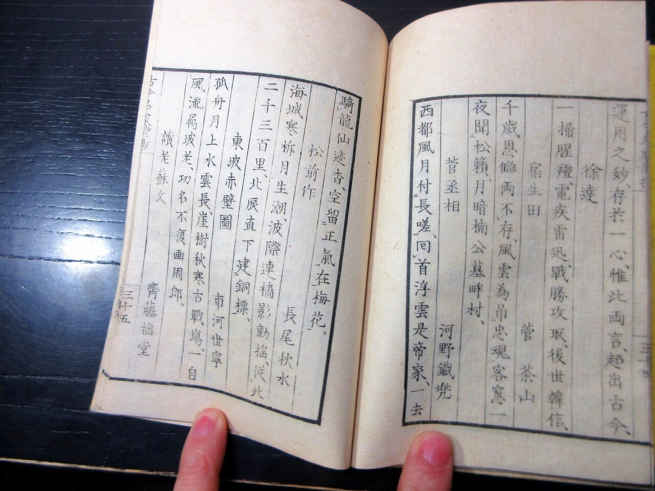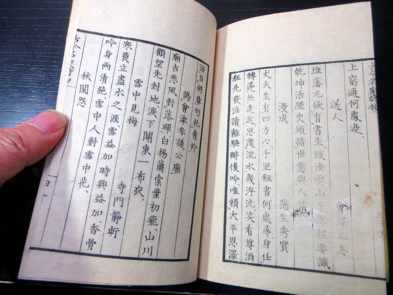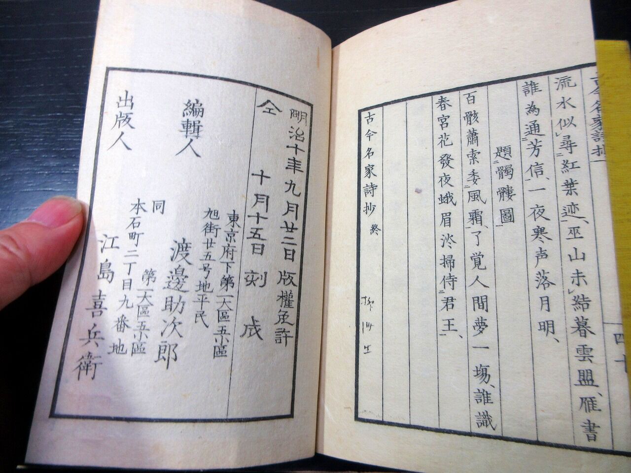 2026年01月26日 和本明治10年(1877)漢詩「古今名家詩抄」上下2冊揃い/渡辺助次郎/古書古文書/木版摺り 和本明治10年(1877)漢詩「古今名家詩抄」上下2冊揃い/渡辺助次郎/古書古文書/木版摺りです。2冊通しで1+3+40丁。18cm×12cm。木版刷り。元題簽。見返しあり。奥付あり。【書名】 古今名家詩抄【巻冊】 上下2冊揃い【著者】 渡辺助次郎 編輯【成立】 明治10年(1877) タグ :#和本#漢詩#JAPAN#Antiquebooks#日本の古本屋#大江戸骨董市