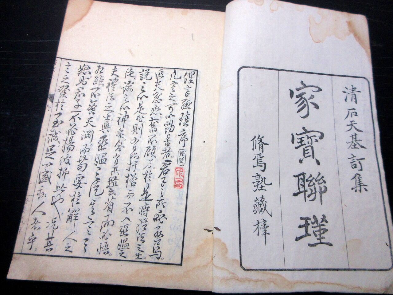 2026年01月29日 和本江戸嘉永5年序(1852)「家宝聯瑾」全1冊/石天基/古書古文書/木版摺り 和本江戸嘉永5年序(1852)「家宝聯瑾」全1冊/石天基/古書古文書/木版摺りです。8+23+1丁。26.5cm×17.5cm。木版刷り。元題簽。見返しあり。【書名】 家宝聯瑾【巻冊】 全1冊【著者】 石天基 訂【成立】 嘉永5年序(1852) タグ :#和本#JAPAN#Antiquebooks#日本の古本屋#大江戸骨董市