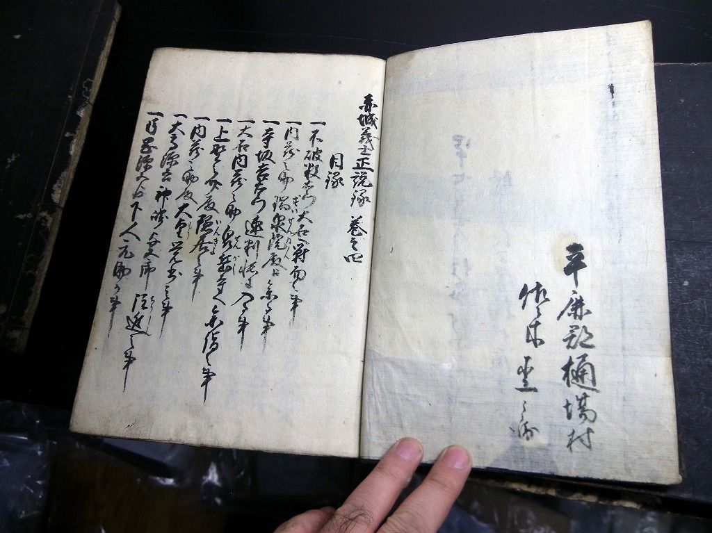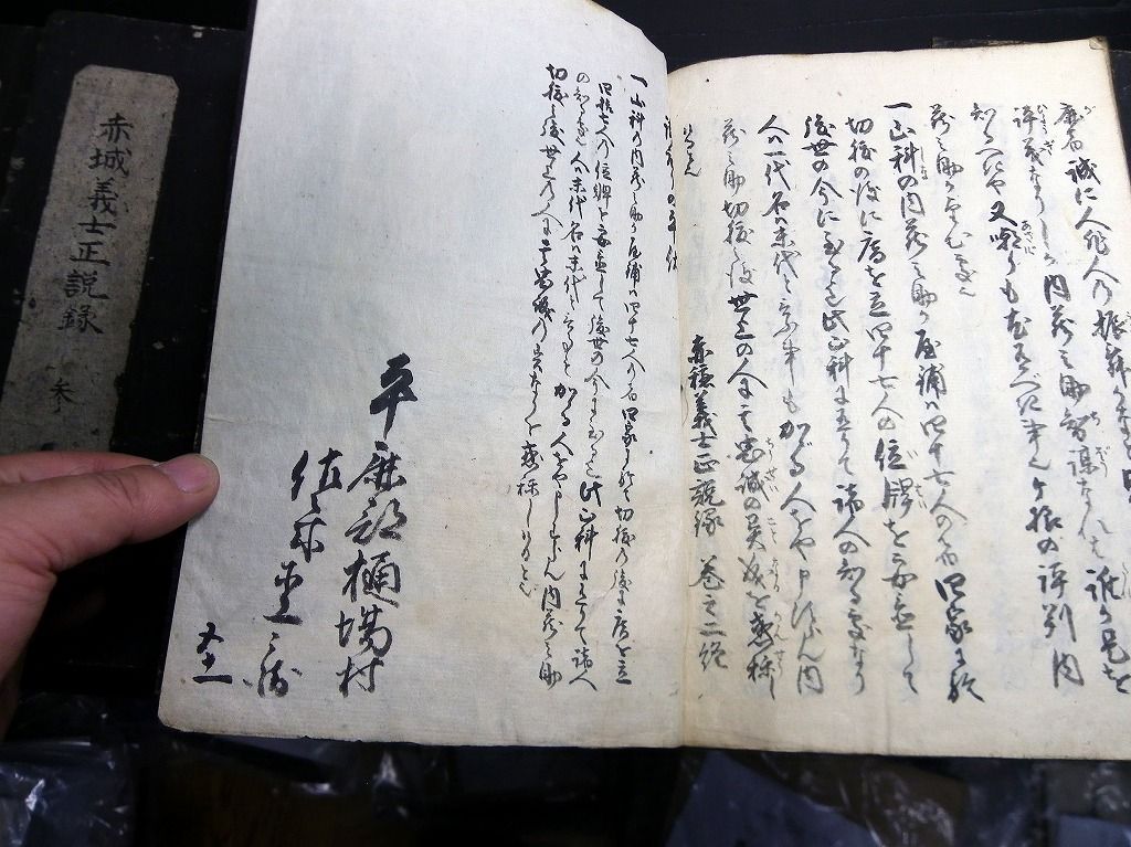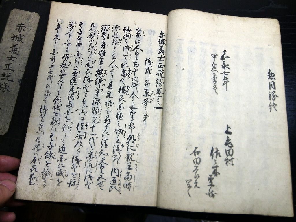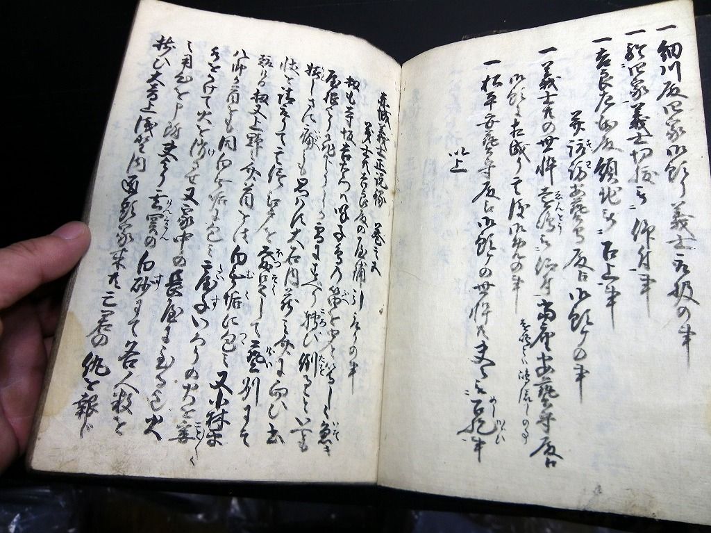 2019年09月10日 和本江戸安政2年(1855)赤穂浪士忠臣蔵写本「赤城義士正説録」5冊揃/出羽国平鹿郡樋場村/秋田県横手市/古書古文書/手書き 和本江戸安政2年(1855)赤穂浪士忠臣蔵写本「赤城義士正説録」5冊揃/出羽国平鹿郡樋場村/秋田県横手市/古書古文書/手書きです。 54、50、51、53、51丁。25cm×17cm。手書き。元題簽。 『データ』 【書名】 赤城義士正説録 【巻冊】 5冊揃 【著者】 出羽国平鹿郡樋場村(秋田県横手市)の記載がある 【成立】 安政2年(1855) 「写本」カテゴリの最新記事 タグ :#和本#写本#古文書#赤穂浪士#忠臣蔵#大石内蔵助 < 前の記事次の記事 > コメント コメントフォーム 名前 コメント 記事の評価 リセット リセット 顔 星 情報を記憶 コメントを投稿する