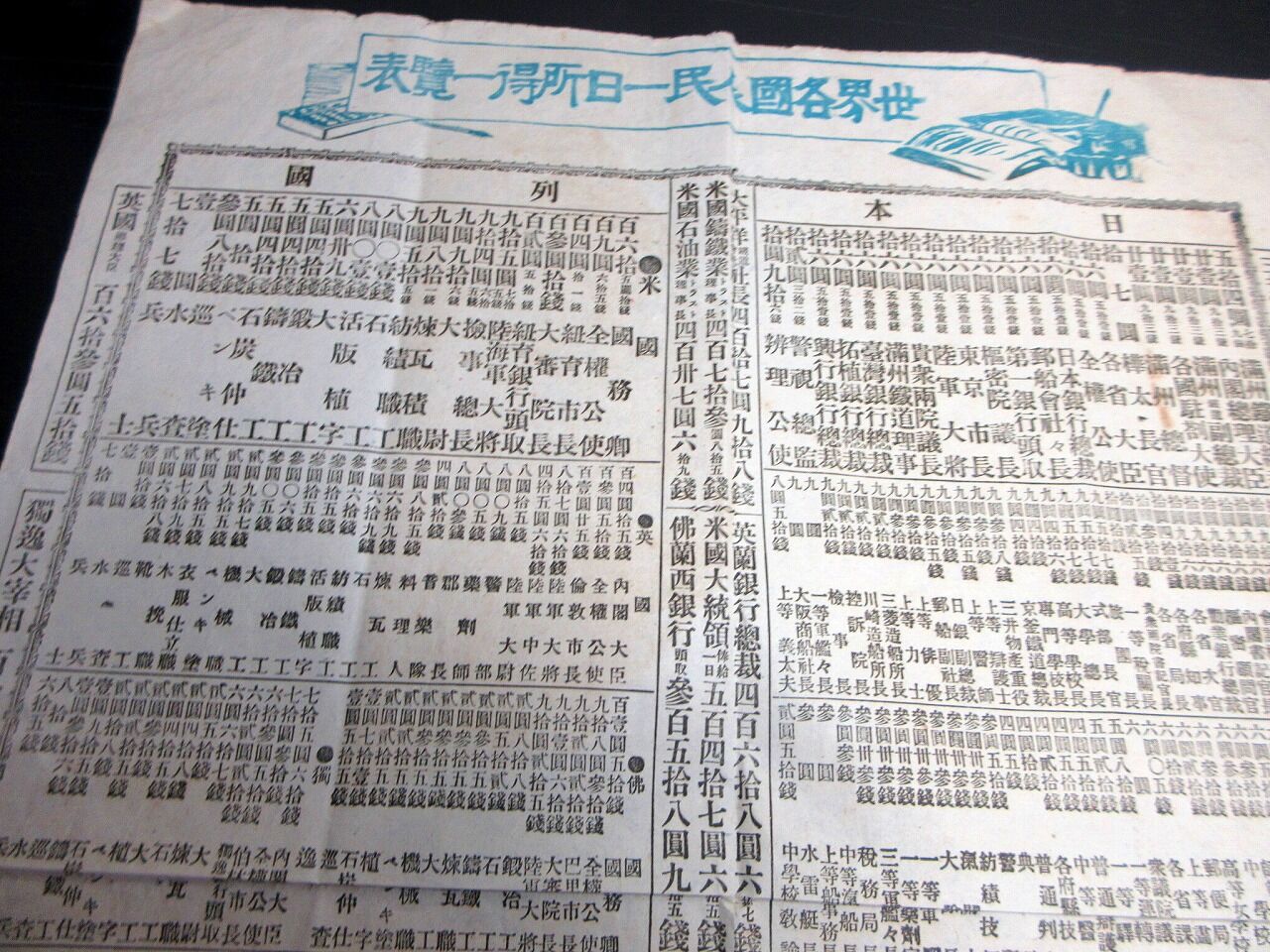 2025年02月21日 明治41年(1908)番付「世界各国人民一日所得一覧表」1点/榎本松之助/古書 明治41年(1908)番付「世界各国人民一日所得一覧表」1点/榎本松之助/古書です。54cm×39cm。【書名】 世界各国人民一日所得一覧表【巻冊】 1点【著者】 榎本松之助【成立】 明治41年(1908) 「摺物」カテゴリの最新記事 タグ :#摺物#刷物#番付#長者番付#JAPAN#antiquebooks < 前の記事次の記事 > コメント コメントフォーム 名前 コメント 記事の評価 リセット リセット 顔 星 情報を記憶 コメントを投稿する