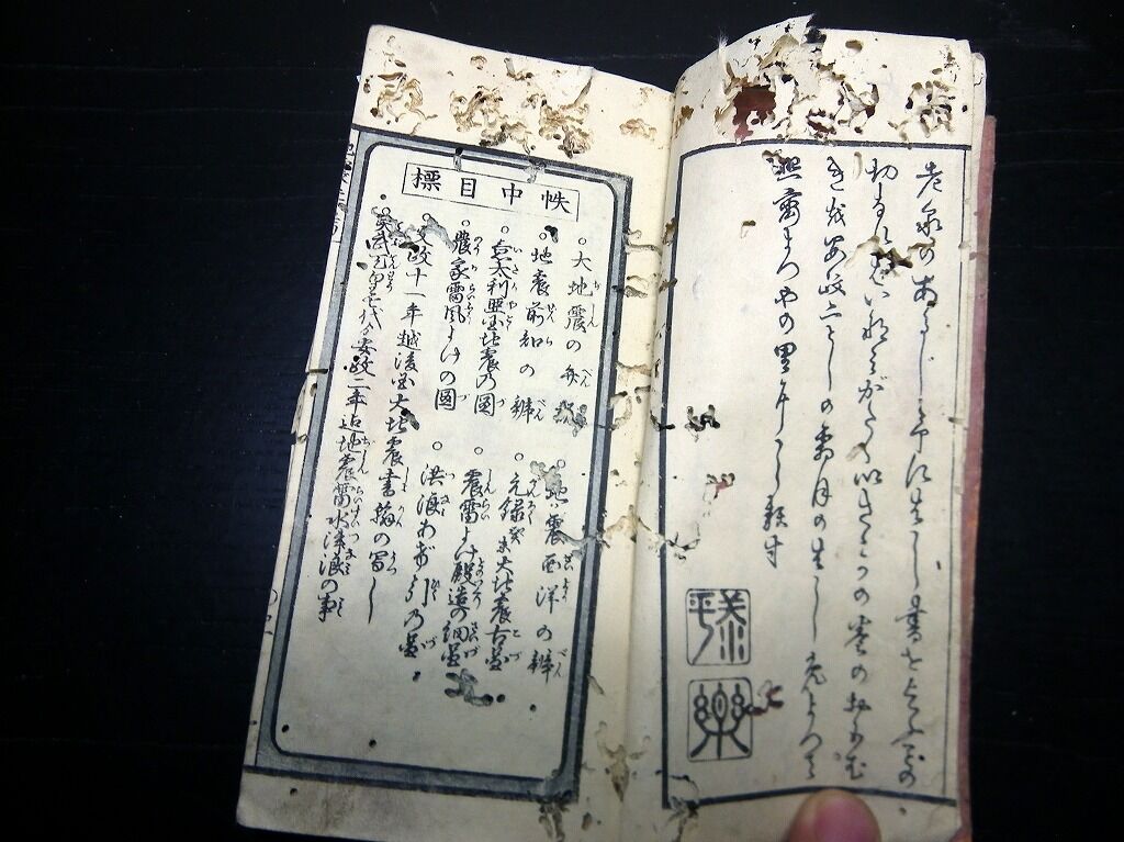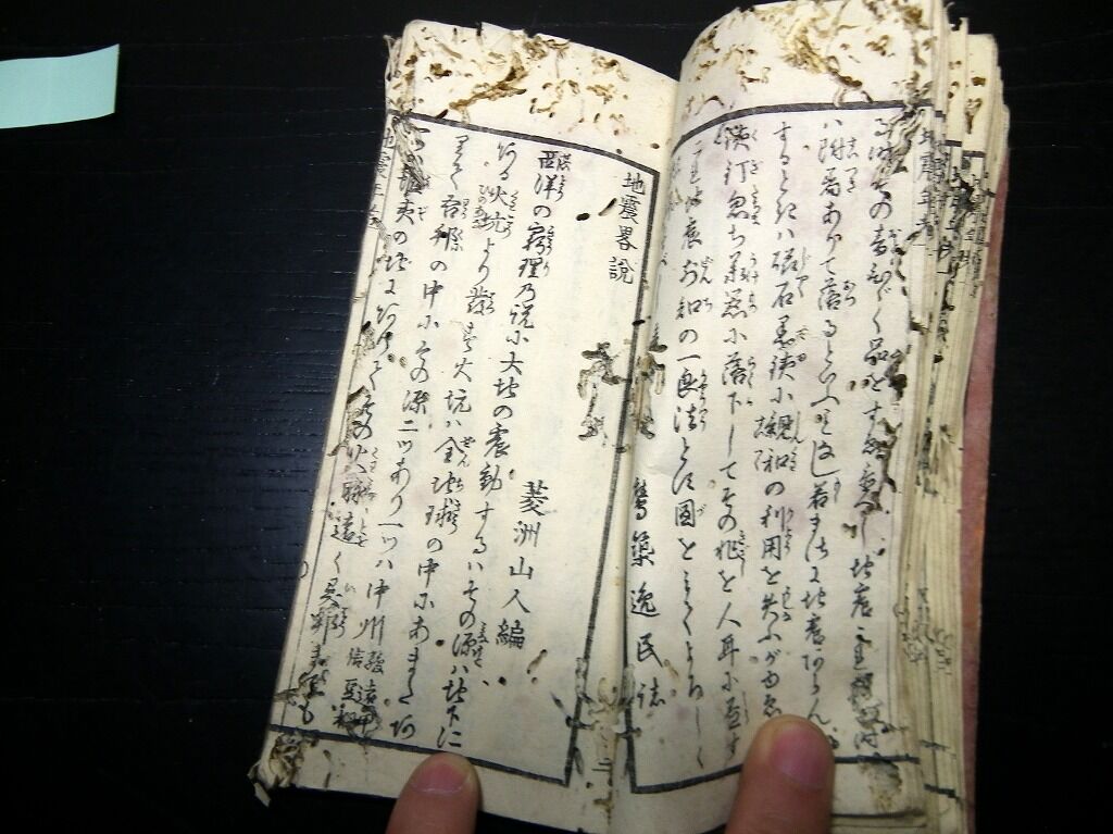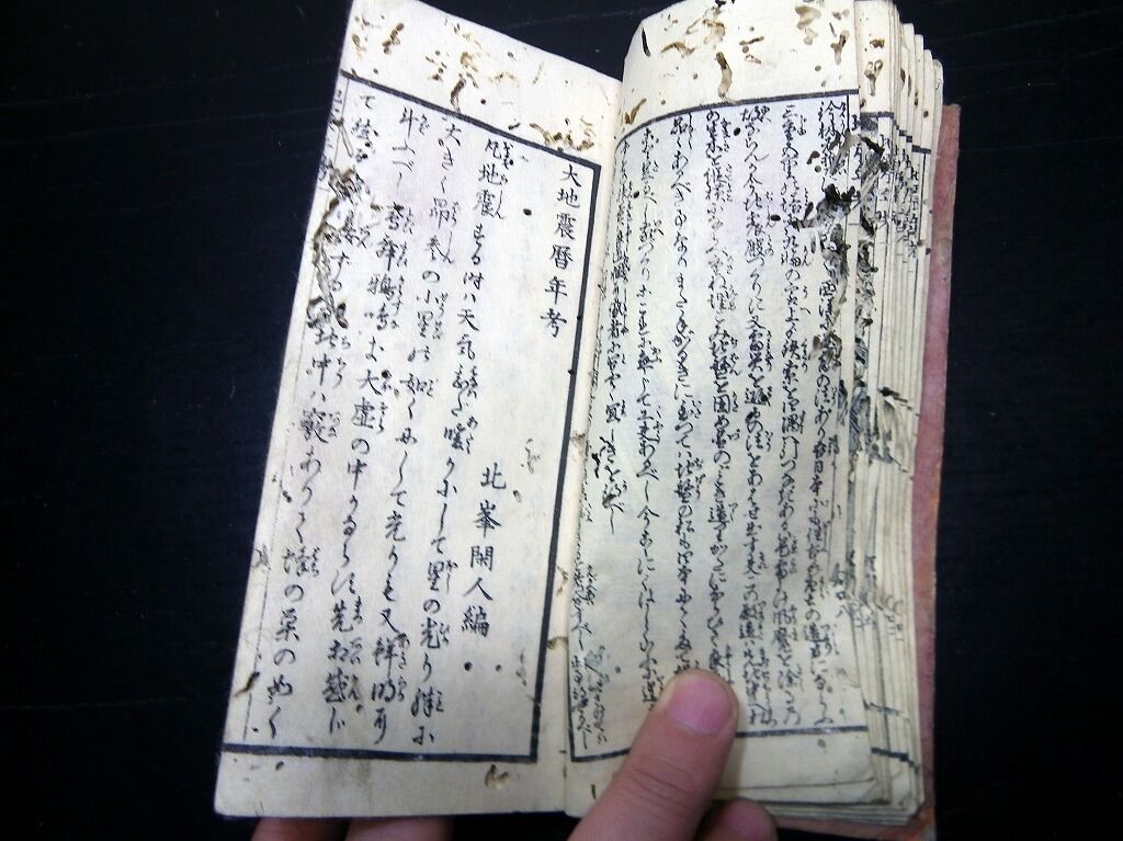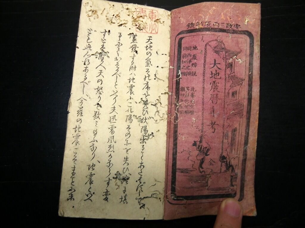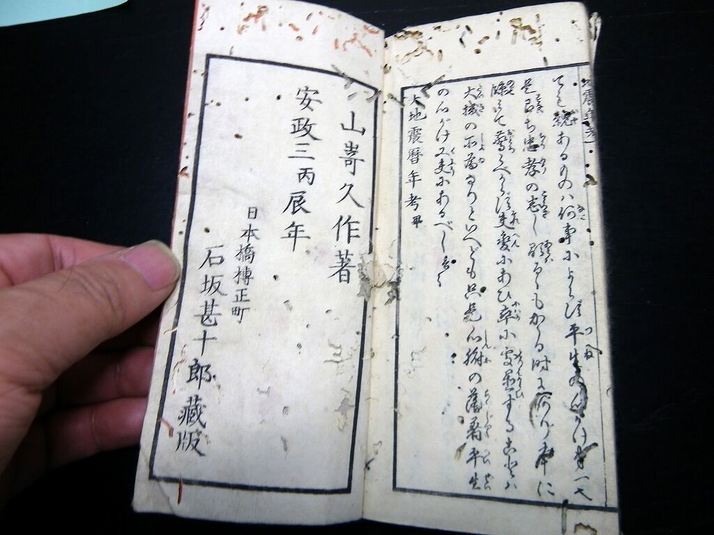 2023年07月13日 和本江戸安政3年(1856)「大地震暦年考」全1冊/山崎美成/古書古文書/木版摺り 和本江戸安政3年(1856)「大地震暦年考」全1冊/山崎美成/古書古文書/木版摺りです。2+8+5+18丁。16.5cm×8.5cm。木版刷り。元題簽。見返しあり。奥付あり。『データ』【書名】 大地震暦年考【巻冊】 全1冊【著者】 山崎美成【成立】 安政3年(1856) タグ :#和本#地震#災害#JAPAN#antiquebook