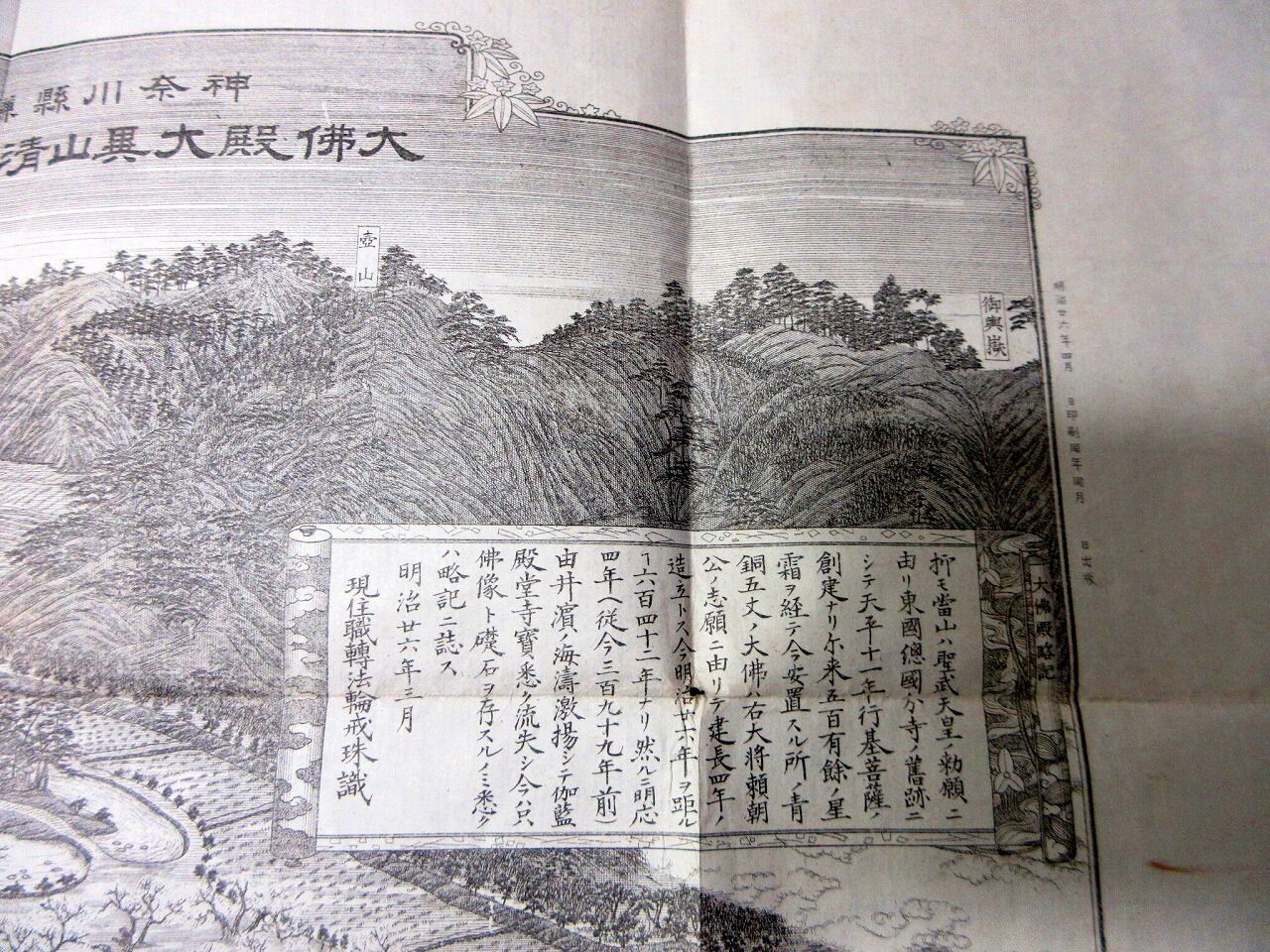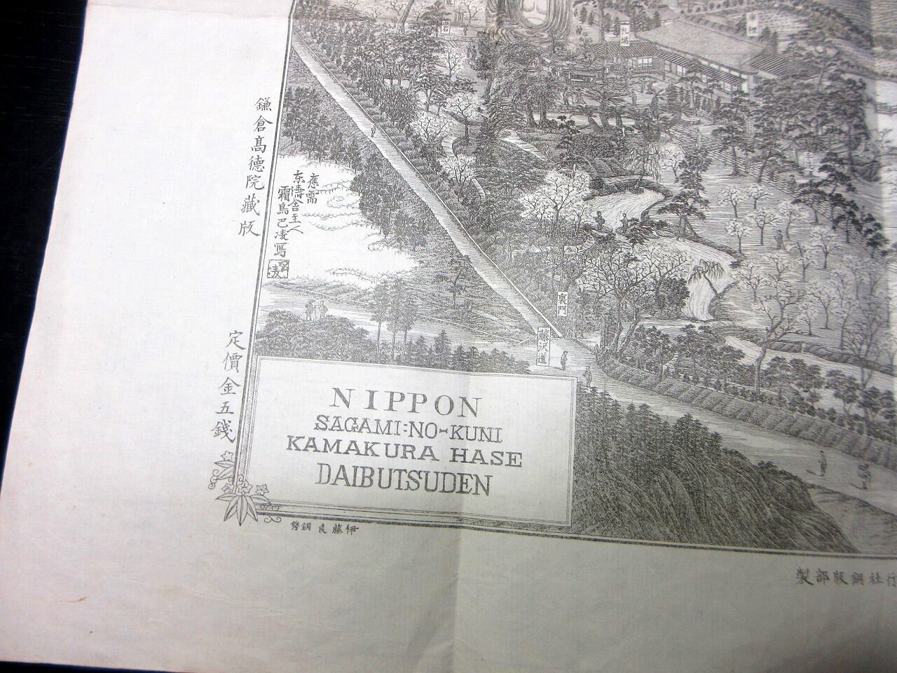 2026年01月09日 明治26年(1893)古地図鳥瞰図「国宝鎌倉大仏殿境内全図(大仏殿大異山清浄泉寺高徳院全図)」1点/銅版摺り 明治26年(1893)古地図鳥瞰図「国宝鎌倉大仏殿境内全図(大仏殿大異山清浄泉寺高徳院全図)」1点/銅版摺りです。37cm×49cm。銅版刷り。奥付あり。【書名】 国宝鎌倉大仏殿境内全図(大仏殿大異山清浄泉寺高徳院全図)【巻冊】 1点(袋付き)【著者】 青山豊太郎【成立】 明治26年(1893) タグ :#古地図#鳥瞰図#鎌倉#大仏#JAPAN#Antiquemap#日本の古本屋#大江戸骨董市