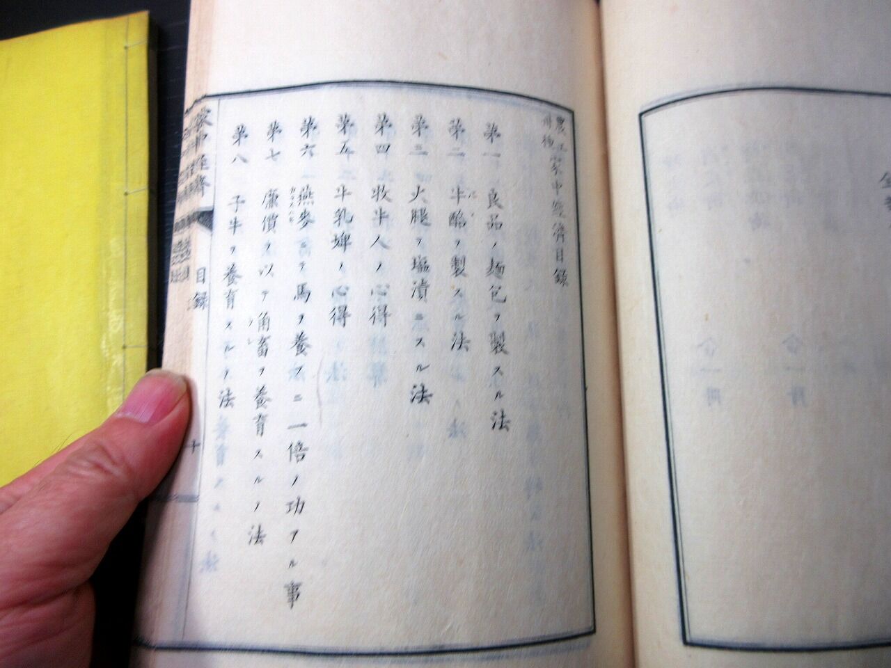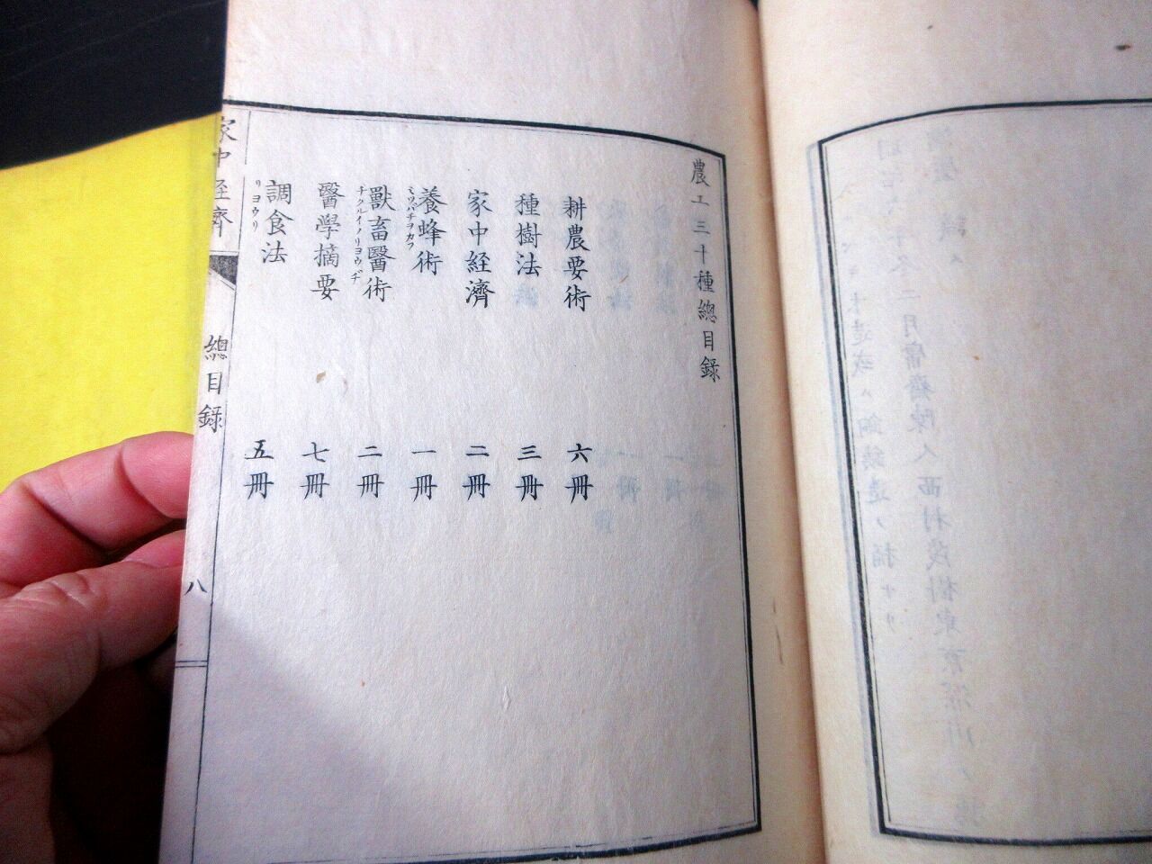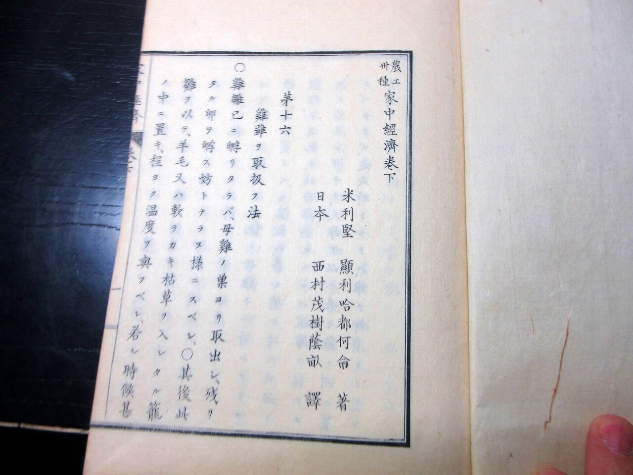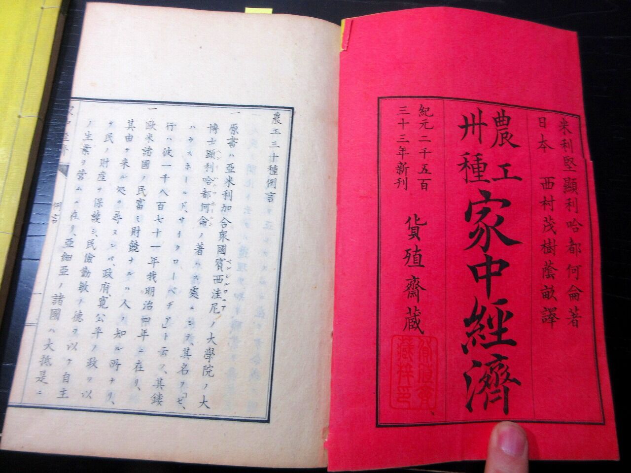 2026年01月28日 和本明治6年(1873)「農工丗種/家中経済」上下2冊揃い/西村茂樹/古書古文書/木版摺り 和本明治6年(1873)「農工丗種/家中経済」上下2冊揃い/西村茂樹/古書古文書/木版摺りです。13+19、32丁。23cm×15.5cm。木版刷り。元題簽。見返しあり。奥付あり。【書名】 農工丗種/家中経済【巻冊】 上下2冊揃い【著者】 西村茂樹 訳【成立】 明治6年(1873) タグ :#和本#JAPAN#Antiquebooks#日本の古本屋#大江戸骨董市