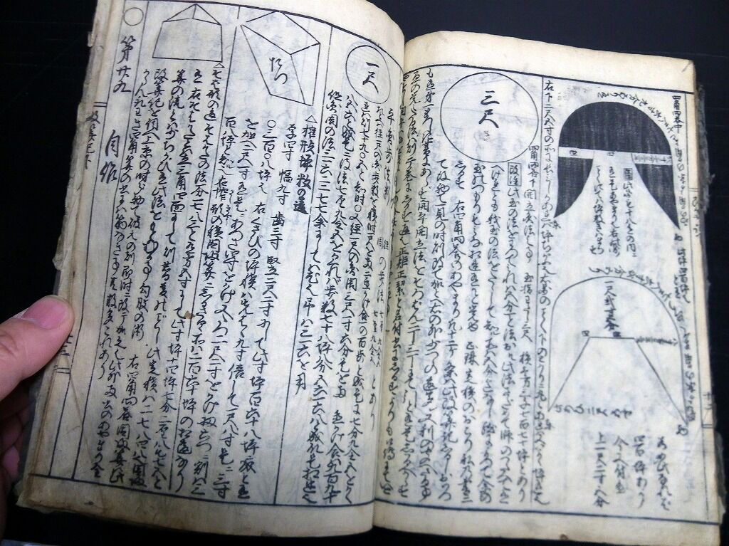 2023年03月02日 和本江戸文化4年(1807)和算/算額「神壁算法」上下と続の3冊/藤田貞資/藤田嘉言/古書古文書/木版摺り 和本江戸文化4年(1807)和算/算額「神壁算法」上下と続の3冊/藤田貞資/藤田嘉言/古書古文書/木版摺りです。6+2+15+10+9+4、21+1、6+16+15丁。22.5cm×16cm。木版刷り。見返しあり。奥付あり。算額に書かれた問題や解答を集めた本。『データ』【書名】 神壁算法【巻冊】 上下と続の3冊【著者】 藤田貞資 閲 藤田嘉言 編【成立】 文化4年(1807) タグ :#和本#和算#数学#算数#JAPAN#antiquebooks