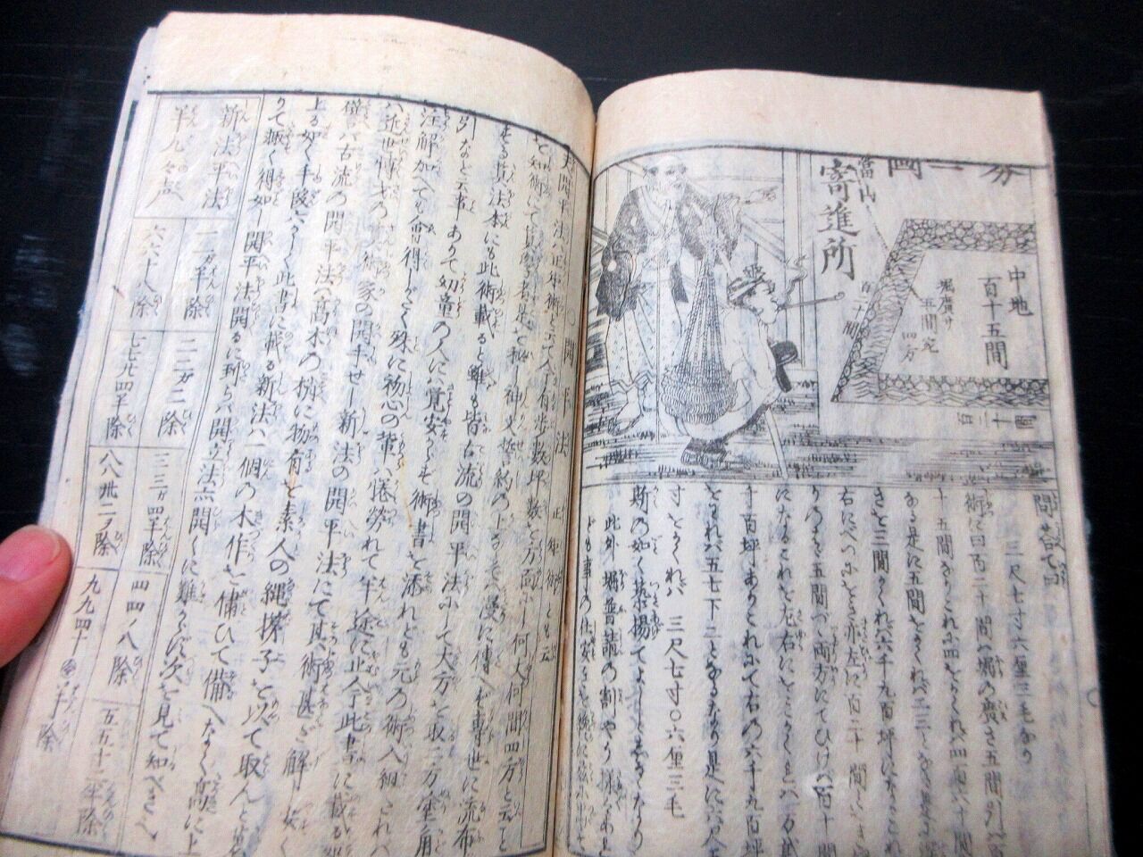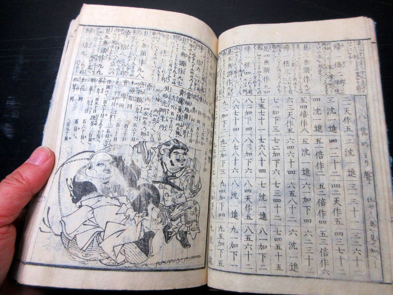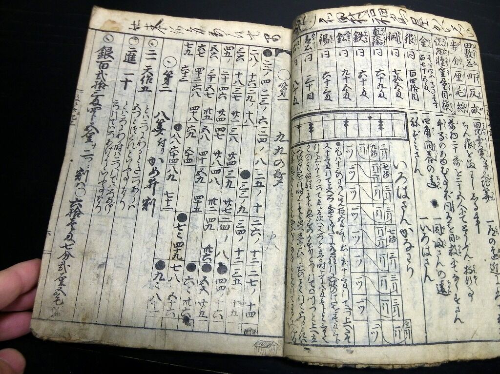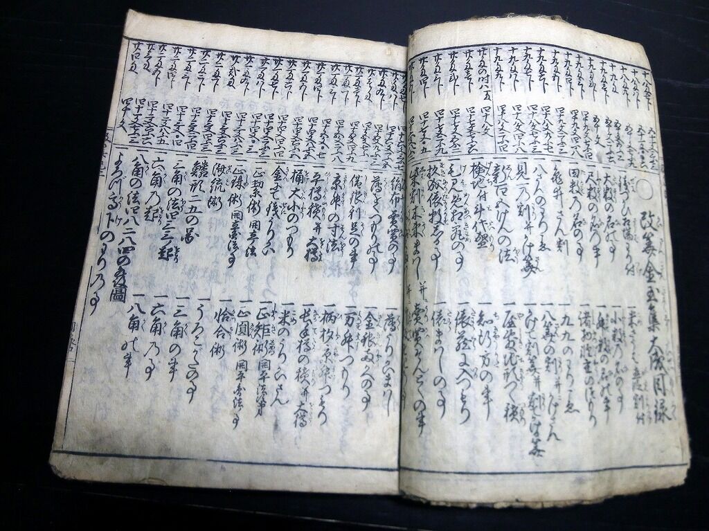 2023年04月13日 和本江戸明和元年(1764)和算塵劫記「大増補改算記綱目大全」全1冊/絵入古書古文書/木版摺り/算数/数学/そろばん 和本江戸明和元年(1764)和算塵劫記「大増補改算記綱目大全」全1冊/絵入古書古文書/木版摺り/算数/数学/そろばんです。 3+103丁。22.5cm×16cm。木版刷り。元題簽。見返しあり。『データ』【書名】 大増補改算記綱目大全【巻冊】 全1冊【成立】 明和元年(1764) タグ :#和本#和算#算数#数学#そろばん#JAPAN#antiquebook