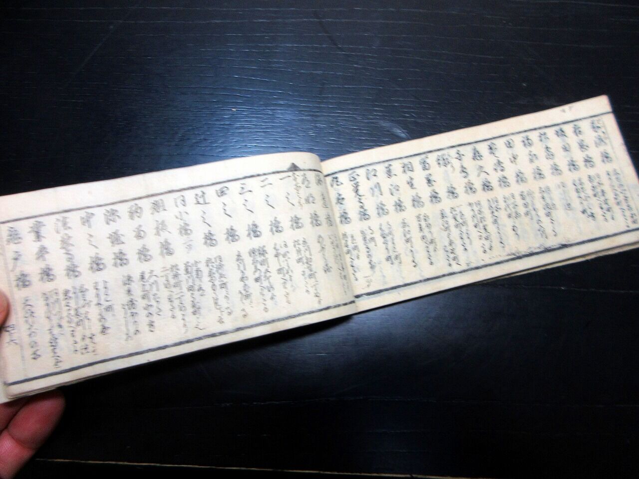 2024年06月14日 和本江戸天保11年(1840)地誌折本「日光山諸所案内手引草」1帖(袋付き)/大嶋久兵衛蔵版/古書古文書/木版摺り/古地図 和本江戸天保11年(1840)地誌折本「日光山諸所案内手引草」1帖(袋付き)/大嶋久兵衛蔵版/古書古文書/木版摺り/古地図です。11丁。15.5cm×6.5cm。木版刷り。元題簽。奥付あり。【書名】 日光山諸所案内手引草【巻冊】 1帖(袋付き)【著者】 大嶋久兵衛蔵版【成立】 天保11年(1840) タグ :#和本#古地図#Japan#antiquebook#Map