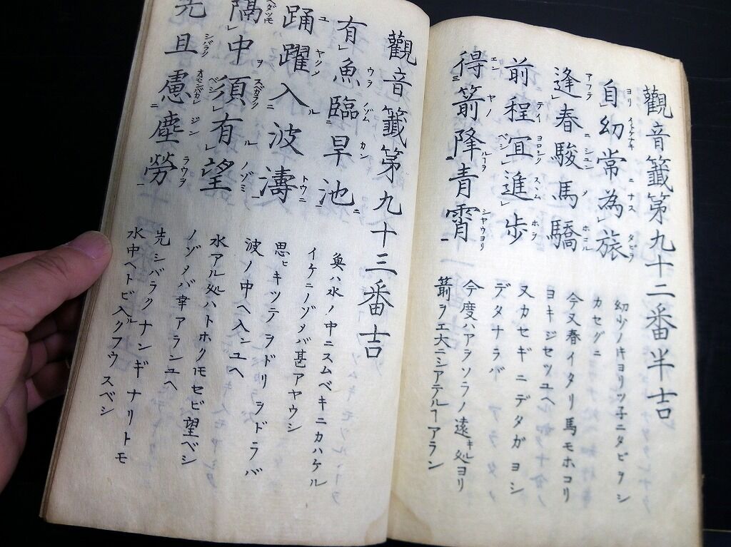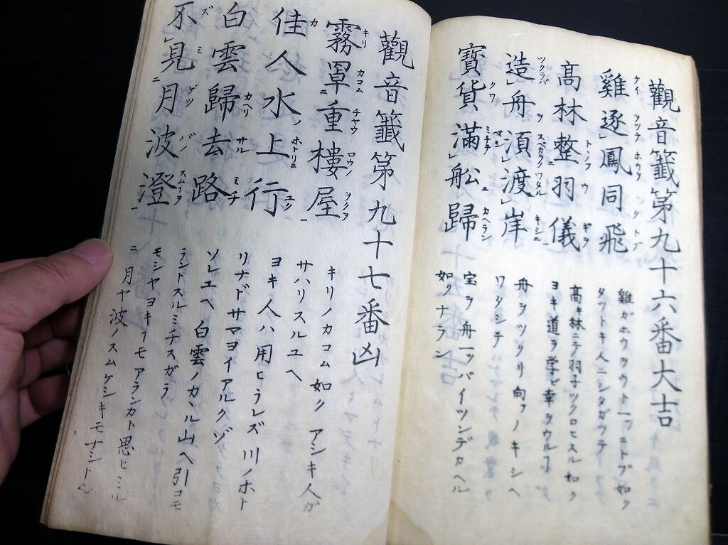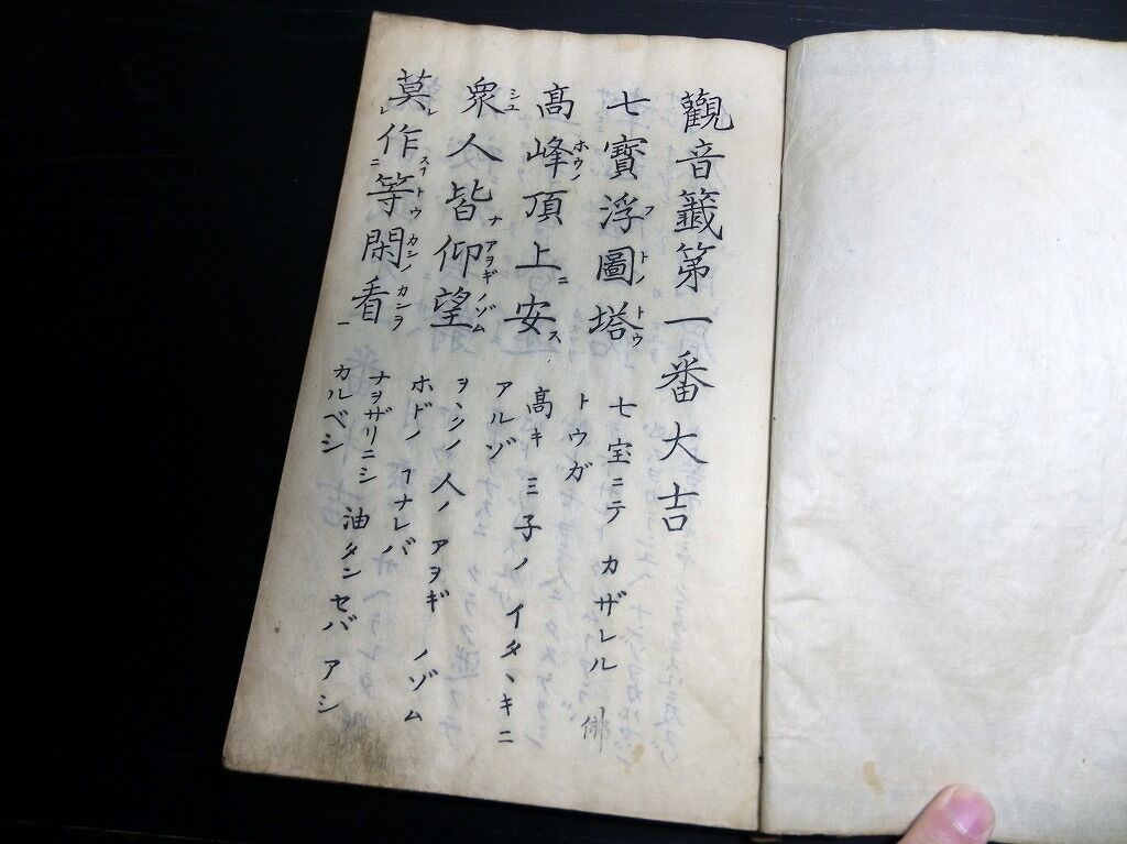 2022年11月03日 和本江戸期おみくじ観音籤「御籤文」全1冊/古書古文書/木版摺り/仏教 和本江戸期おみくじ観音籤「御籤文」全1冊/古書古文書/木版摺り/仏教です。50丁。26.5cm×17cm。木版刷り。『データ』【書名】 御籤文【巻冊】 全1冊【成立】 江戸期 タグ :#和本#おみくじ#仏教#占い#古書#古文書#JAPAN#antiquebooks