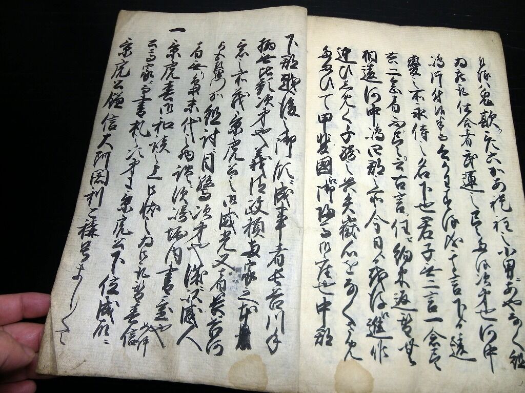 2025年06月06日 和本江戸期写本「川中島感状写」1冊/上杉謙信/古書古文書/手書き 和本江戸期写本「川中島感状写」1冊/上杉謙信/古書古文書/手書きです。5丁。24cm×17cm。手書き。【書名】 川中島感状写【巻冊】 1冊【著者】 上杉謙信【成立】 江戸期の写本だと思いますが、正確な年代は不明。 タグ :#和本#写本#古文書#上杉謙信#川中島の戦い#JAPAN#antiquebooks#日本の古本屋#大江戸骨董市