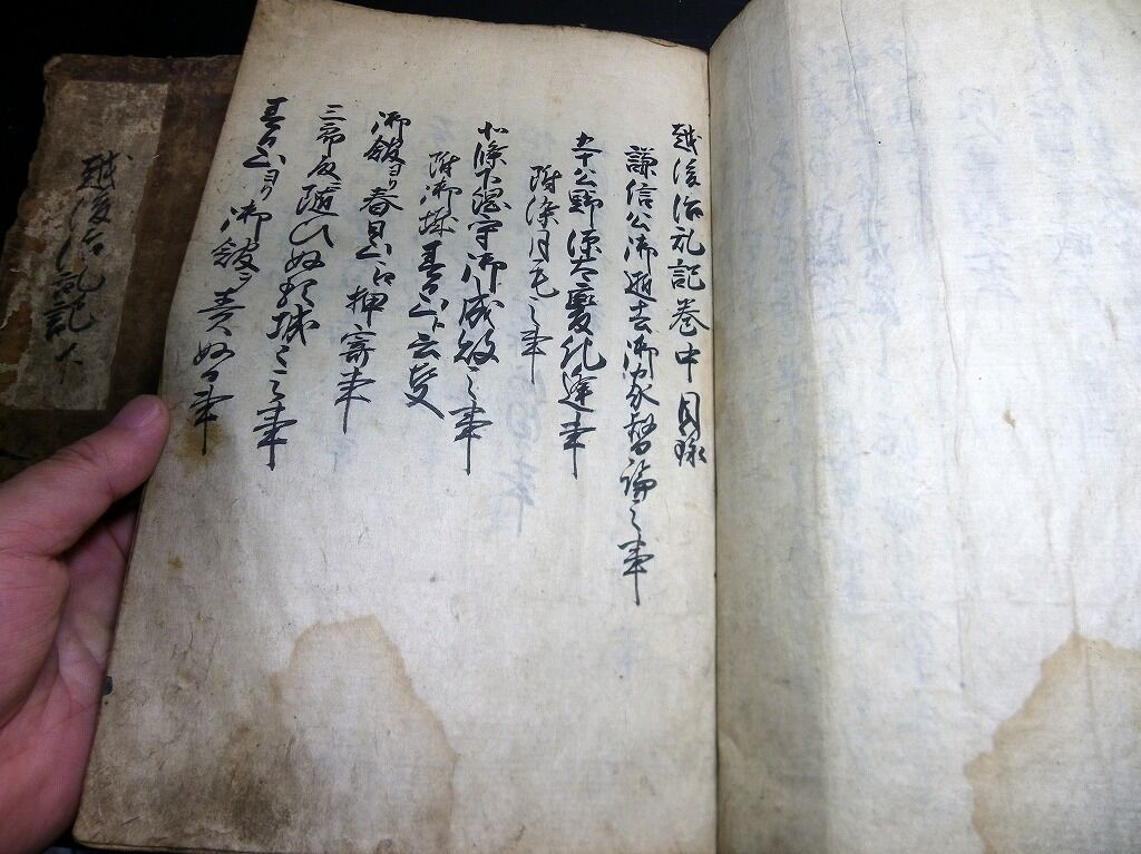 2022年10月11日 和本江戸期武田信玄上杉謙信写本「越後治乱記」上中下3冊揃/古書古文書/手書き/武田勝頼 和本江戸期武田信玄上杉謙信写本「越後治乱記」上中下3冊揃/古書古文書/手書き/武田勝頼です。49、44、40丁。大本(かなり大きい)程度。手書き。『データ』【書名】 越後治乱記【巻冊】 上中下3冊揃【成立】 江戸期の写本だと思いますが、正確な年代は不明。 タグ :#和本#写本#武田信玄#上杉謙信#古書#古文書