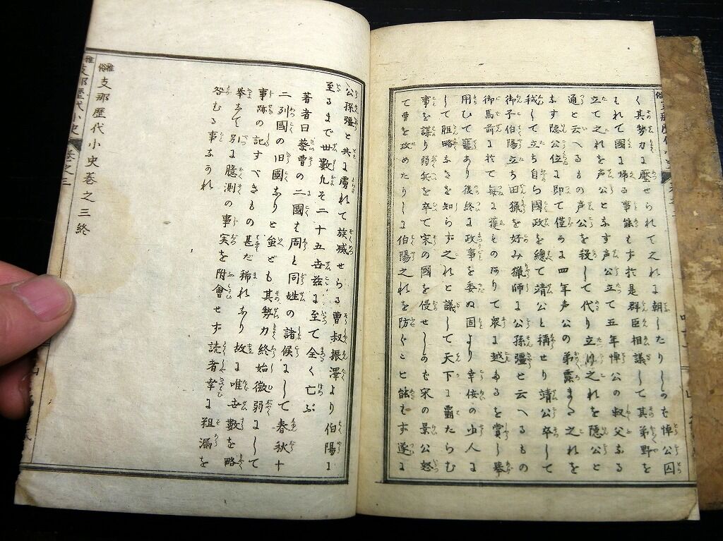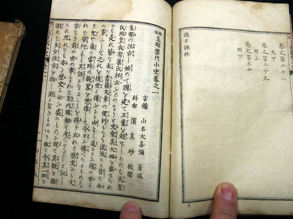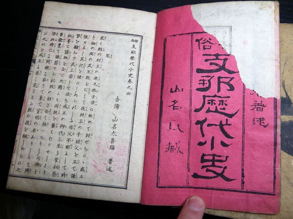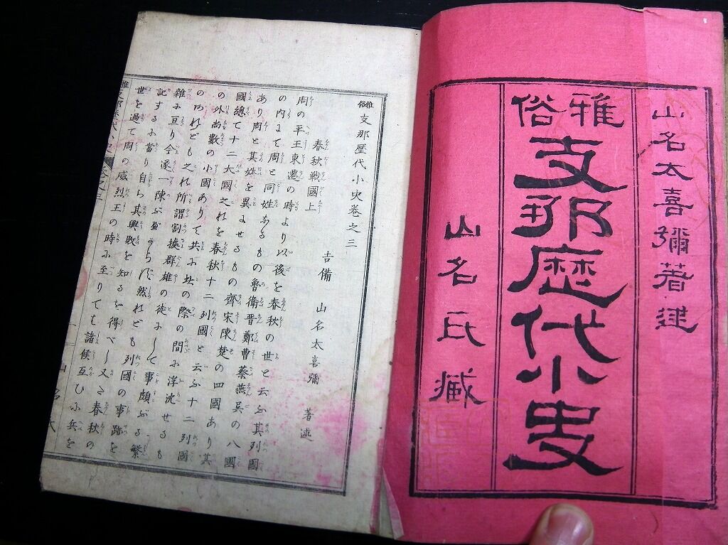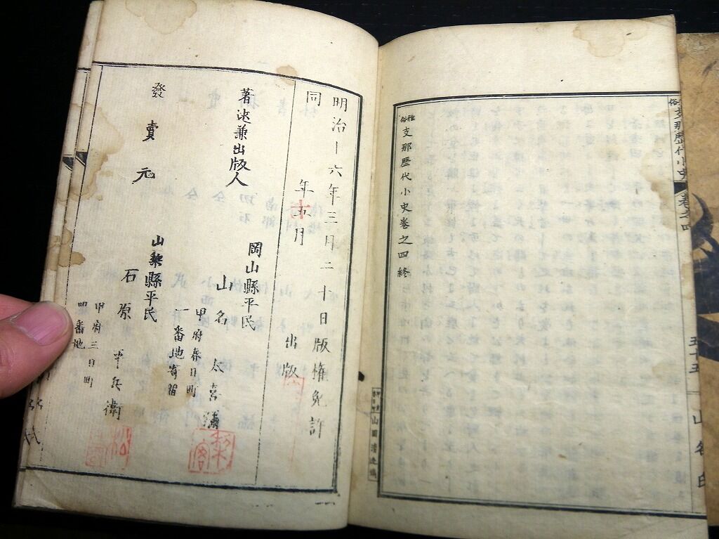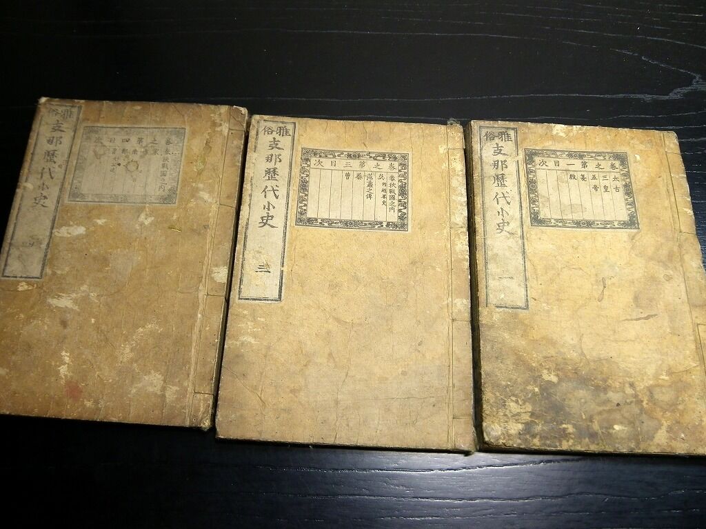 2020年04月04日 和本明治16年(1883)中国歴史「雅俗支那歴代小史」3冊/山名太喜弥/古書古文書/銅版摺り 和本明治16年(1883)中国歴史「雅俗支那歴代小史」3冊/山名太喜弥/古書古文書/銅版摺りです。 32、48、55丁。中本。銅版刷り。元題簽。見返し破れあり。奥付あり。 『データ』 【書名】 雅俗支那歴代小史 【巻冊】 巻1,3,4の3冊です 【著者】 山名太喜弥 【成立】 明治16年(1883) タグ :#和本#中国歴史