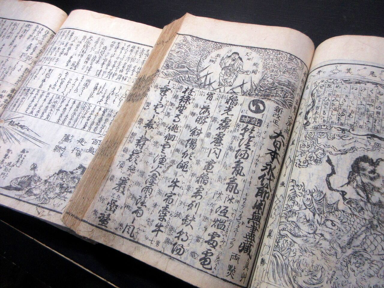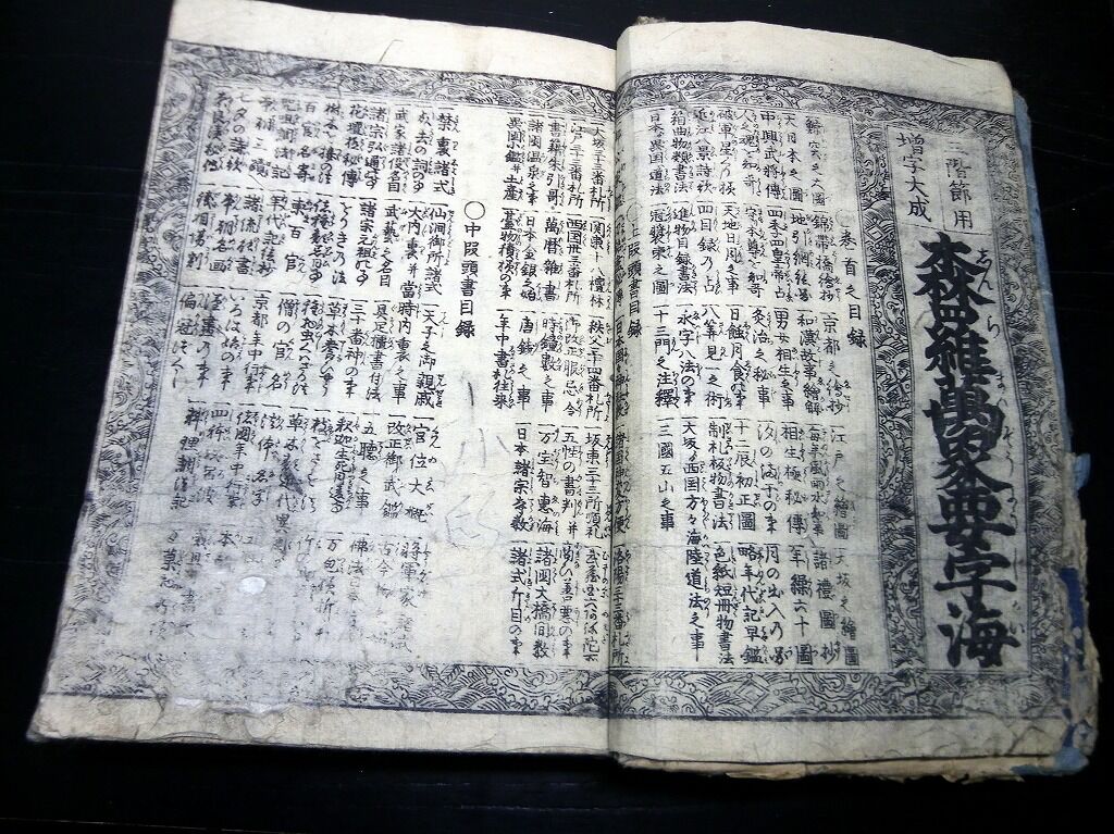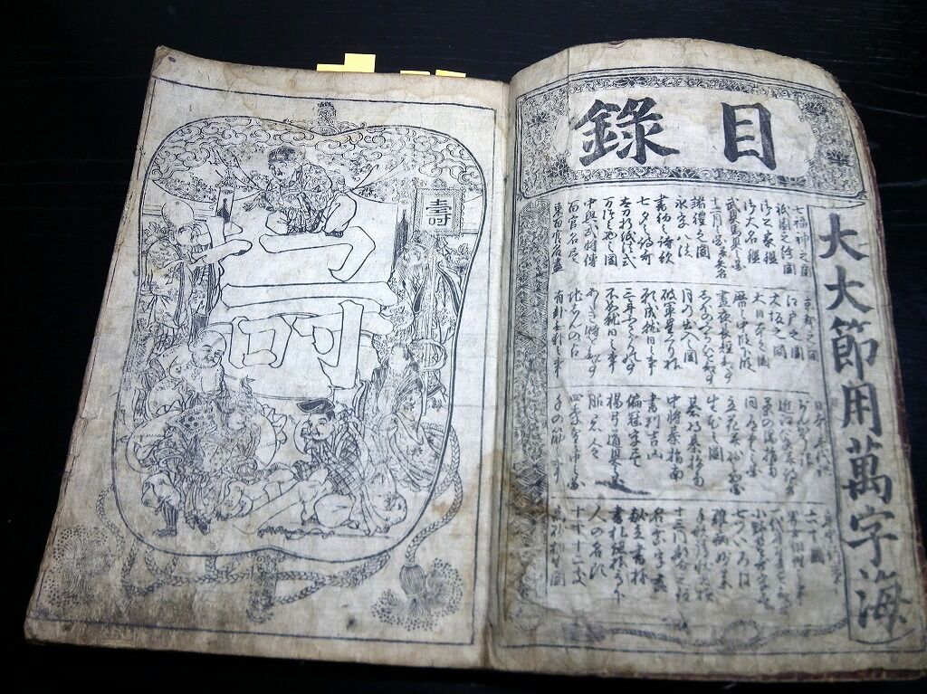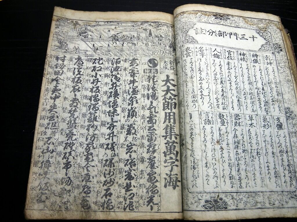 2020年01月04日 和本江戸宝暦7年(1757)版漢字辞書事典「大大節用集万字海」全1冊/玉葉軒七友/川枝豊信/絵入古書古文書/木版摺り/古地図 和本江戸宝暦7年(1757)版漢字辞書事典「大大節用集万字海」全1冊/玉葉軒七友/川枝豊信/絵入古書古文書/木版摺り/古地図です。115丁。大本。木版刷り。見返しあり。奥付あり。『データ』【書名】 大大節用集万字海【巻冊】 全1冊【著者】 玉葉軒七友 編 川枝豊信 画 【成立】 宝暦7年(1757)版 タグ :#和本#辞書#事典#古地図#節用集