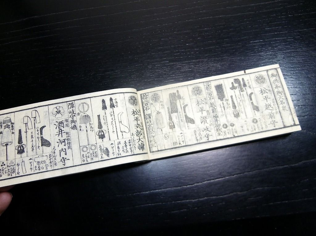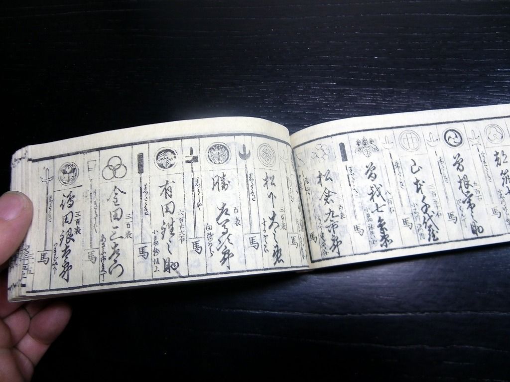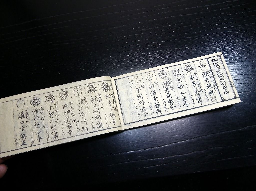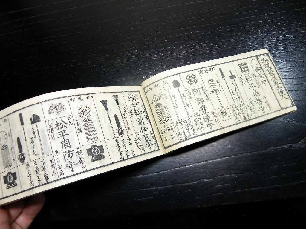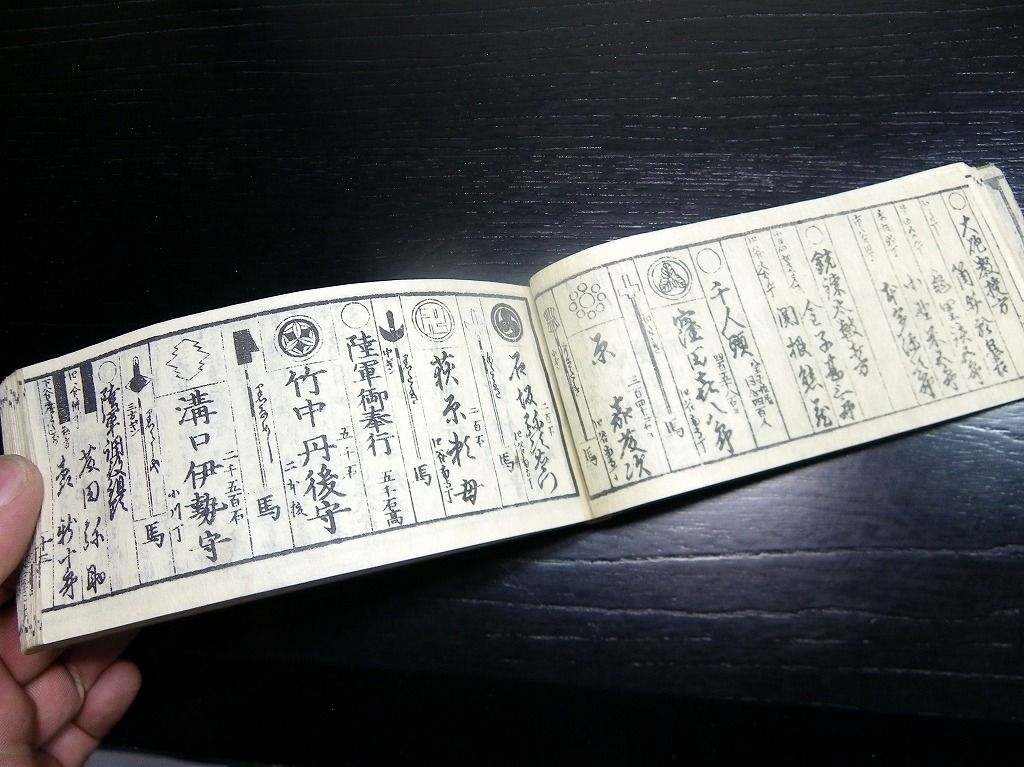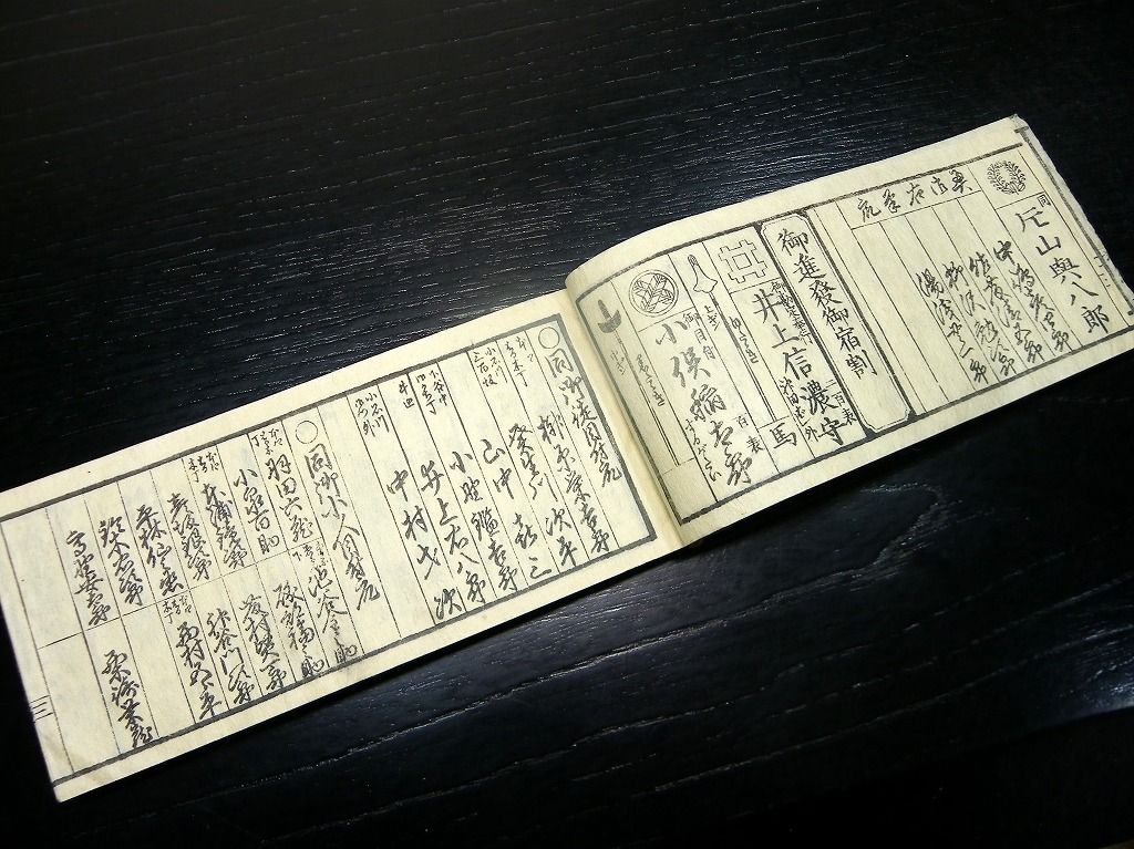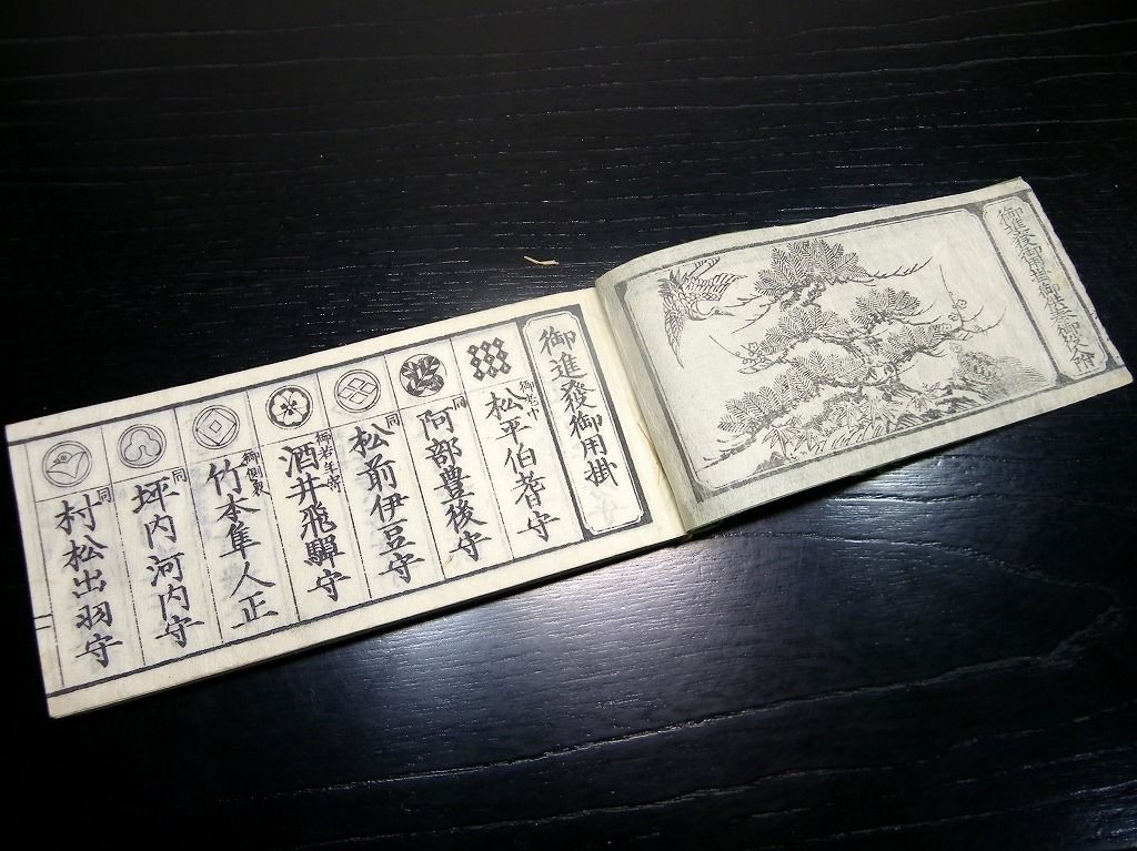 2019年09月12日 和本江戸慶応元年(1865)版長州征討関連武鑑「御進発御用掛御供奉御役人附」全冊/出雲寺万次郎版/古書古文書/木版摺り 和本江戸慶応元年(1865)版長州征討関連武鑑「御進発御用掛御供奉御役人附」全冊/出雲寺万次郎版/古書古文書/木版摺りです。 62丁。横本(7cm×16cm)。木版刷り。見返しあり。奥付あり。 第2次長州征討の前の14代将軍徳川家茂の進発に関する武鑑です。 『データ』 【書名】 御進発御用掛御供奉御役人附 【巻冊】 全1冊 【著者】 出雲寺万次郎版 【成立】 慶応元年(1865)版 タグ :#和本#武鑑#長州征討#木版摺り#出雲寺万次郎