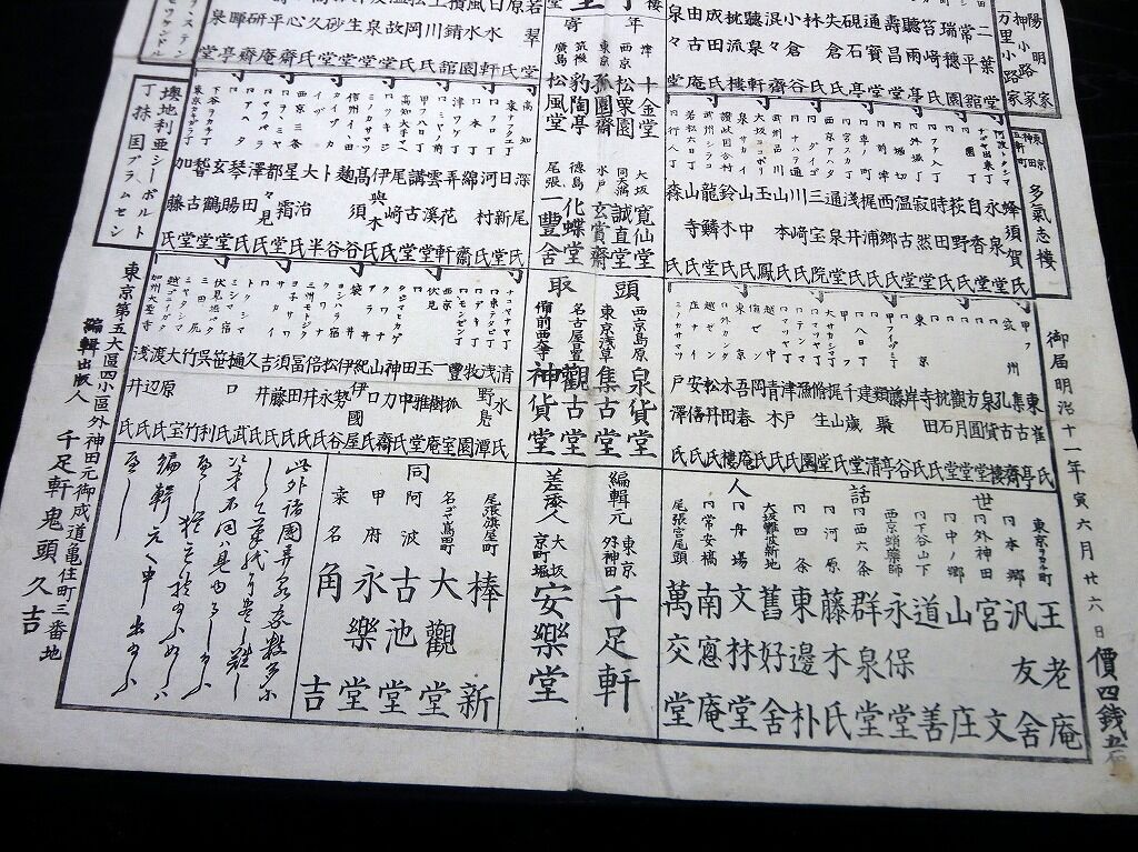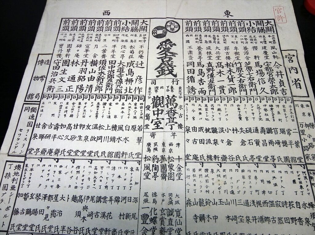 2020年12月01日 明治11年(1878)古銭コレクター番付「愛古銭」1点/千足軒鬼頭久吉/古書古文書/木版摺り 明治11年(1878)古銭コレクター番付「愛古銭」1点/千足軒鬼頭久吉/古書古文書/木版摺りです。52cm×38.5cm。木版刷り。『データ』【書名】 愛古銭【巻冊】 1点【著者】 千足軒 鬼頭久吉【成立】 明治11年(1878) タグ :#刷物#摺物#古銭