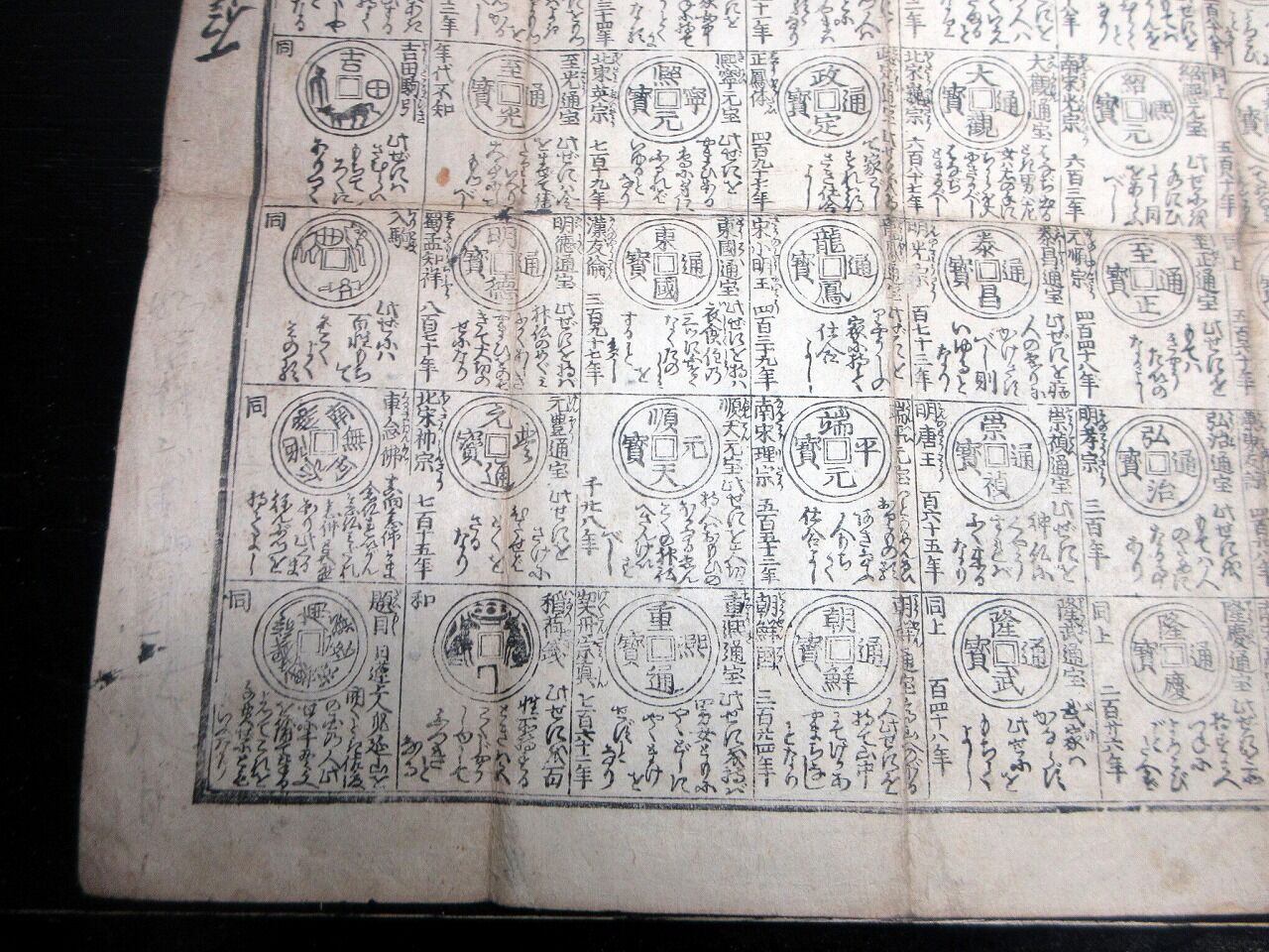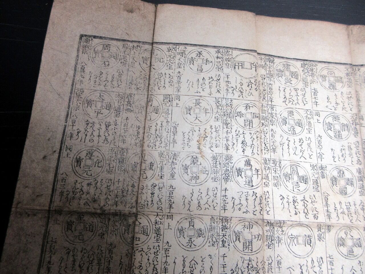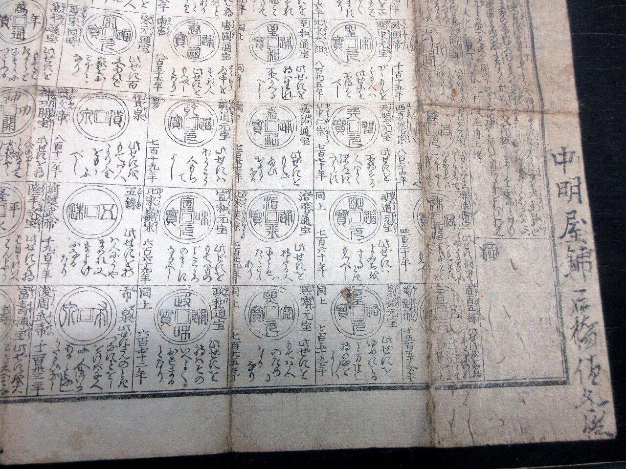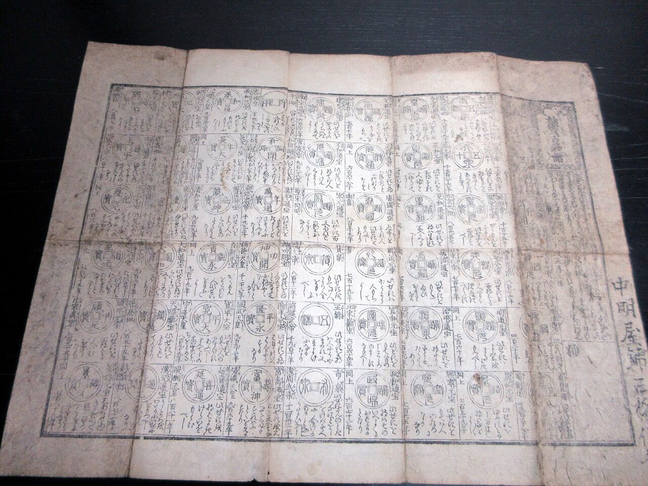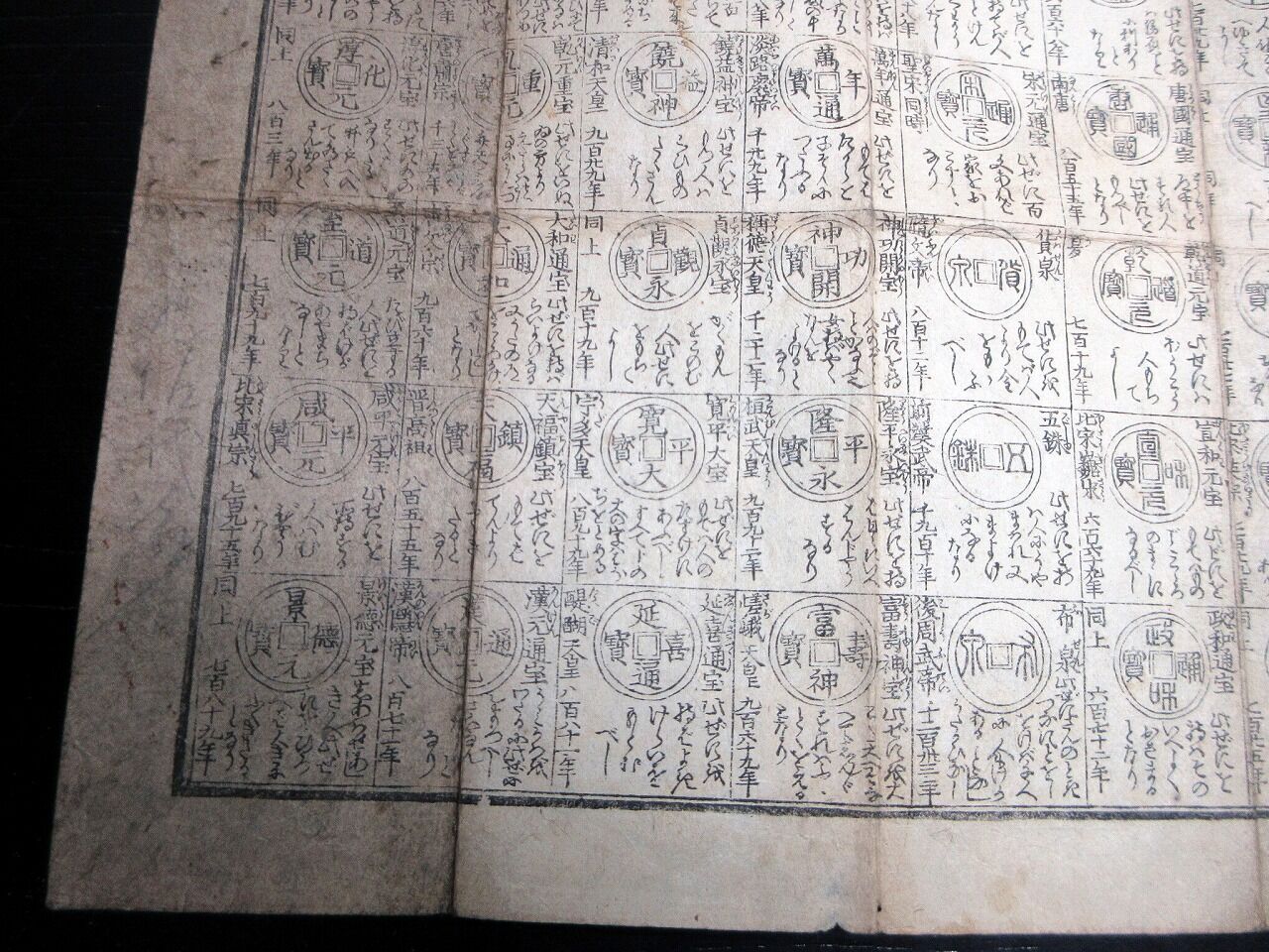 2022年06月11日 江戸文化4年(1807)古銭カタログ「袖宝古銭譜」1点/古書古文書/木版両面摺り 江戸文化4年(1807)古銭カタログ「袖宝古銭譜」1点/古書古文書/木版両面摺りです。31cm×39cm。木版両面刷り。『データ』【書名】 袖宝古銭譜【巻冊】 1点【著者】 西村屋与八版【成立】 文化4年(1807) タグ :#摺物#古銭#和同開珎