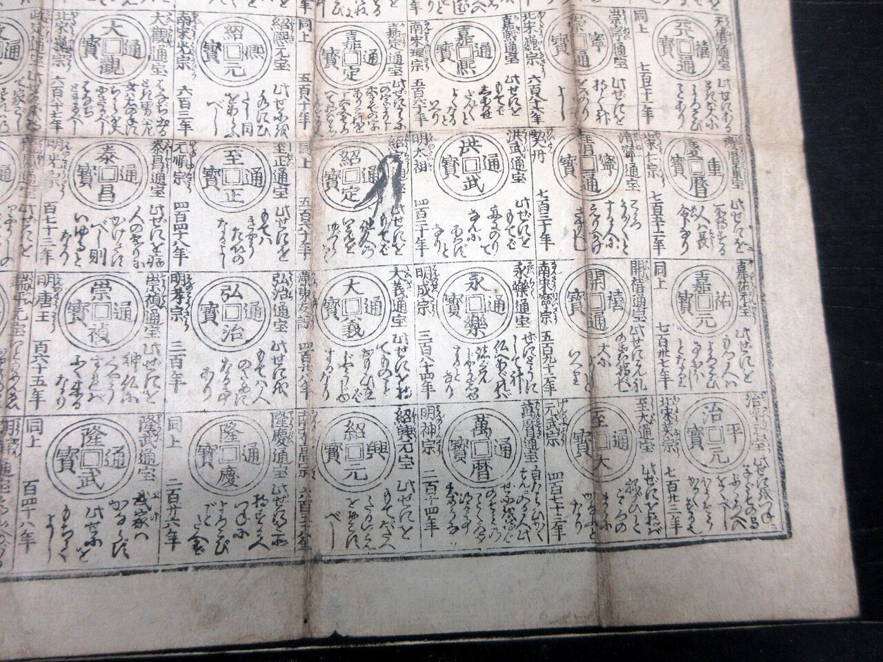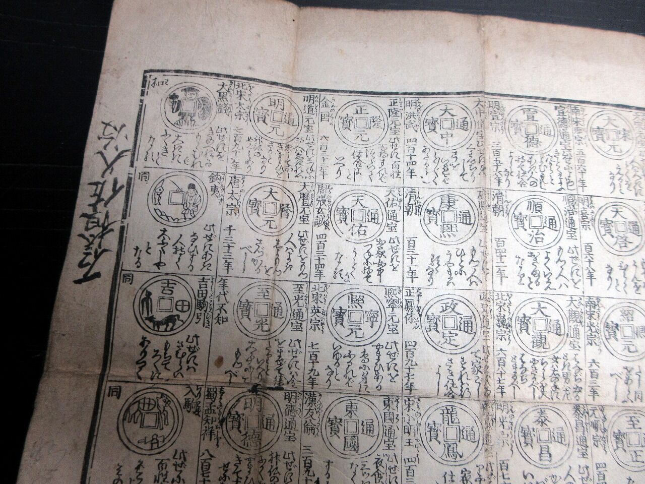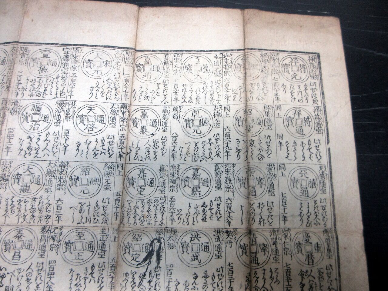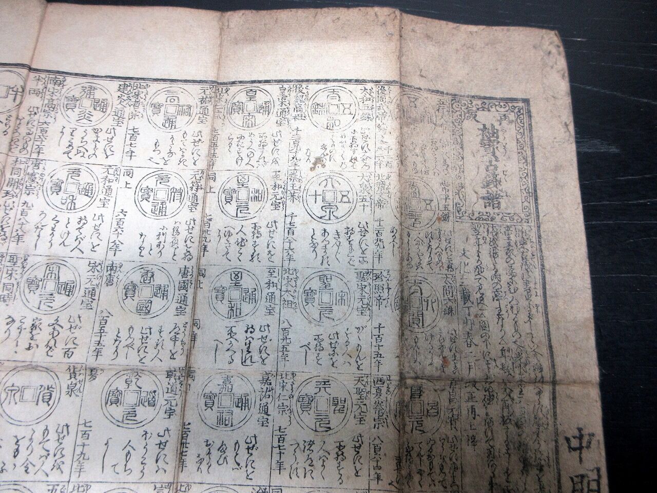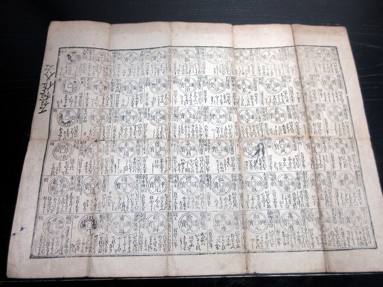 2022年06月11日 江戸文化4年(1807)古銭カタログ「袖宝古銭譜」1点/古書古文書/木版両面摺り 江戸文化4年(1807)古銭カタログ「袖宝古銭譜」1点/古書古文書/木版両面摺りです。31cm×39cm。木版両面刷り。『データ』【書名】 袖宝古銭譜【巻冊】 1点【著者】 西村屋与八版【成立】 文化4年(1807) タグ :#摺物#古銭#和同開珎