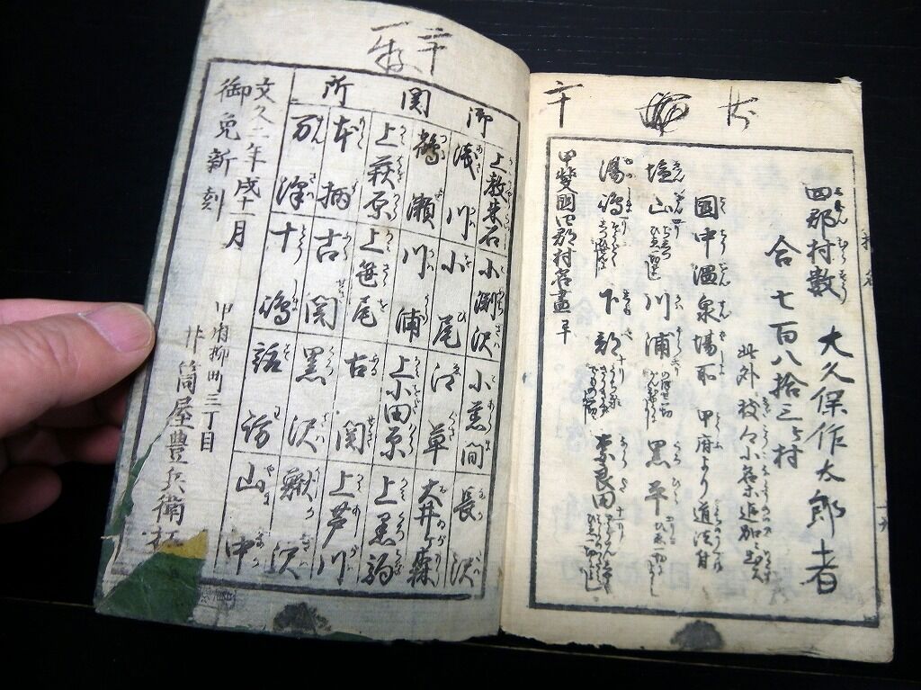 2022年10月27日 和本江戸文久2年(1862)山梨往来物「甲斐四郡村名尽」全1冊/甲府柳町三丁目井筒屋豊兵衛板/古書古文書/木版摺り 和本江戸文久2年(1862)山梨往来物「甲斐四郡村名尽」全1冊/甲府柳町三丁目井筒屋豊兵衛板/古書古文書/木版摺りです。19丁。中本。木版刷り。元題簽。奥付あり。『データ』【書名】 甲斐四郡村名尽【巻冊】 全1冊【著者】 甲府柳町三丁目井筒屋豊兵衛板【成立】 文久2年(1862) タグ :#和本#古書#古文書#山梨#antiquebooks#JAPAN