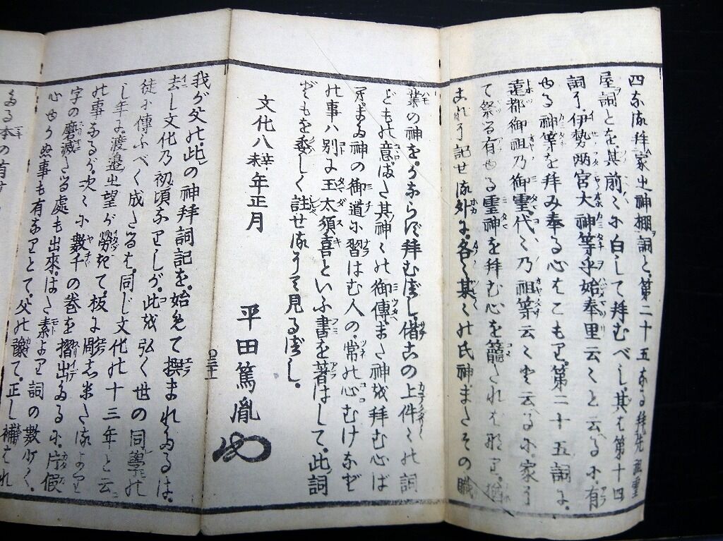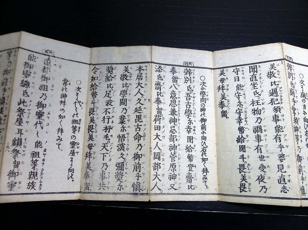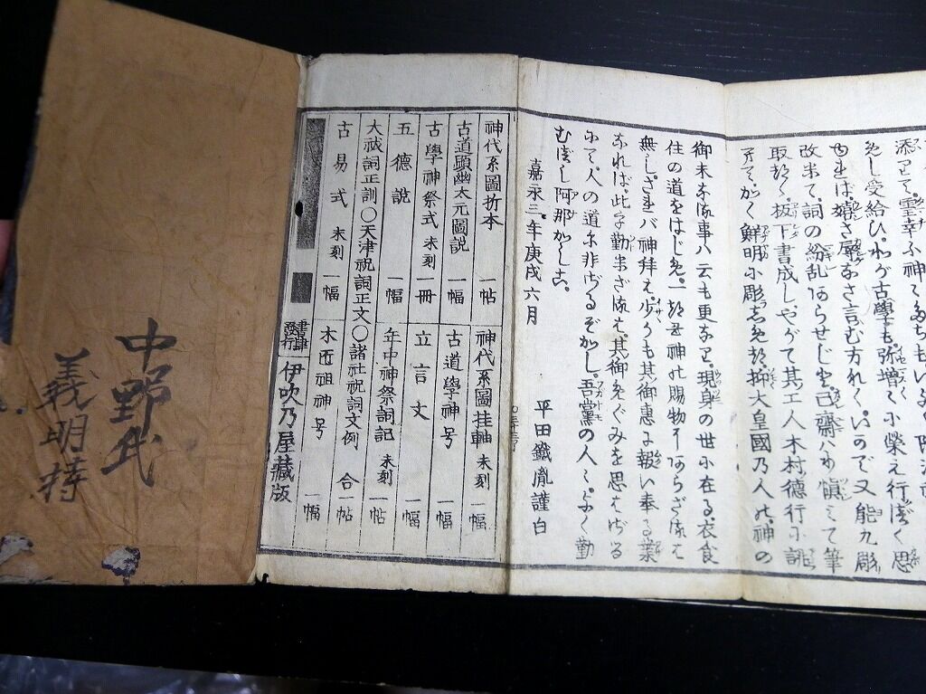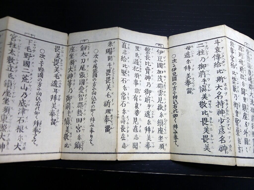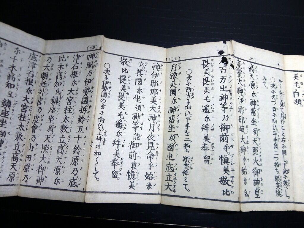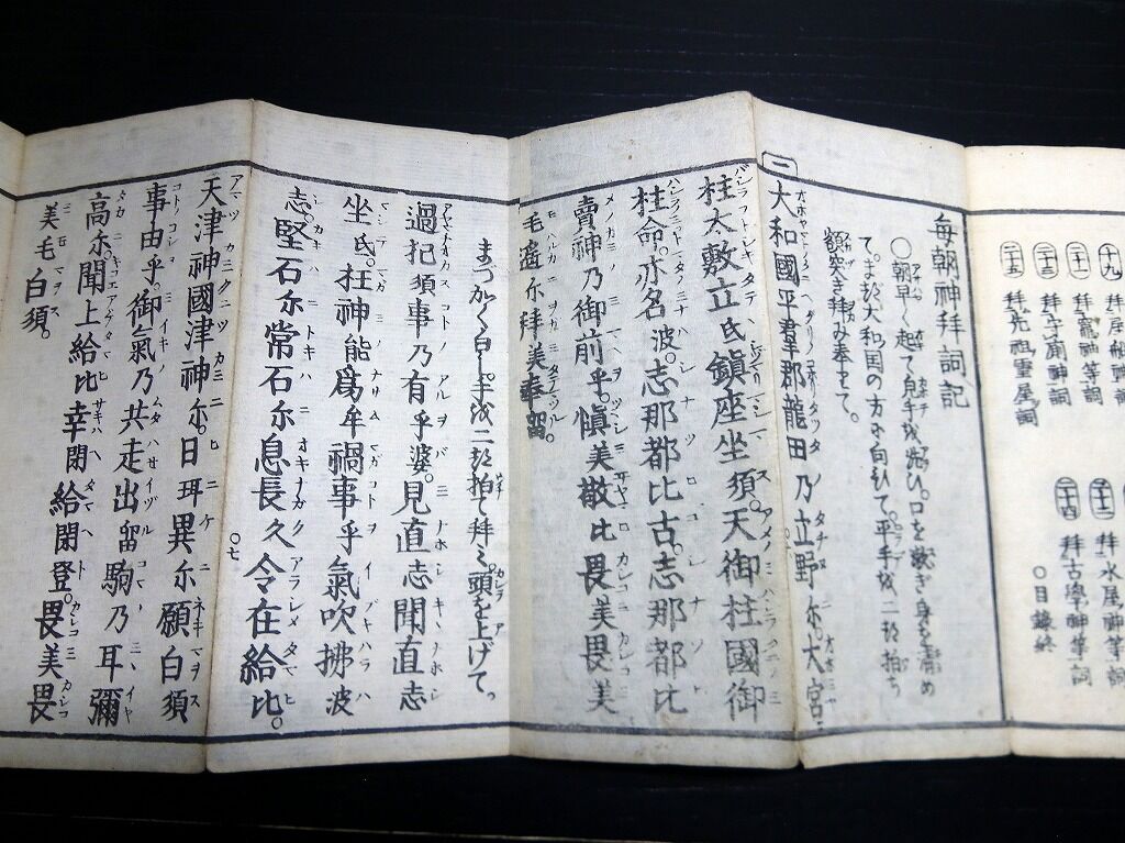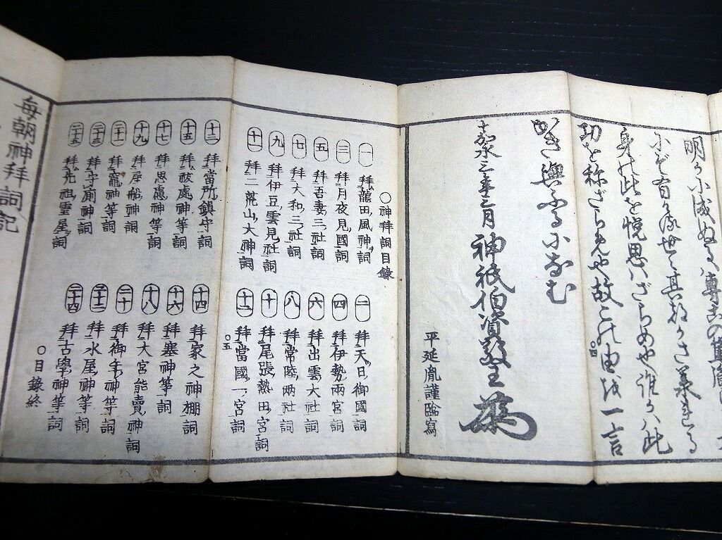 2022年09月16日 和本江戸嘉永3年(1850)国学神道祝詞折本「毎朝神拝詞記」全1帖/平田篤胤/古書古文書/木版摺り 和本江戸嘉永3年(1850)国学神道祝詞折本「毎朝神拝詞記」全1帖/平田篤胤/古書古文書/木版摺りです。33丁。中本。木版刷り。元題簽。『データ』【書名】 毎朝神拝詞記【巻冊】 全1帖【著者】 平田篤胤【成立】 嘉永3年(1850) タグ :#和本#古書#古文書#国学#神道#平田篤胤