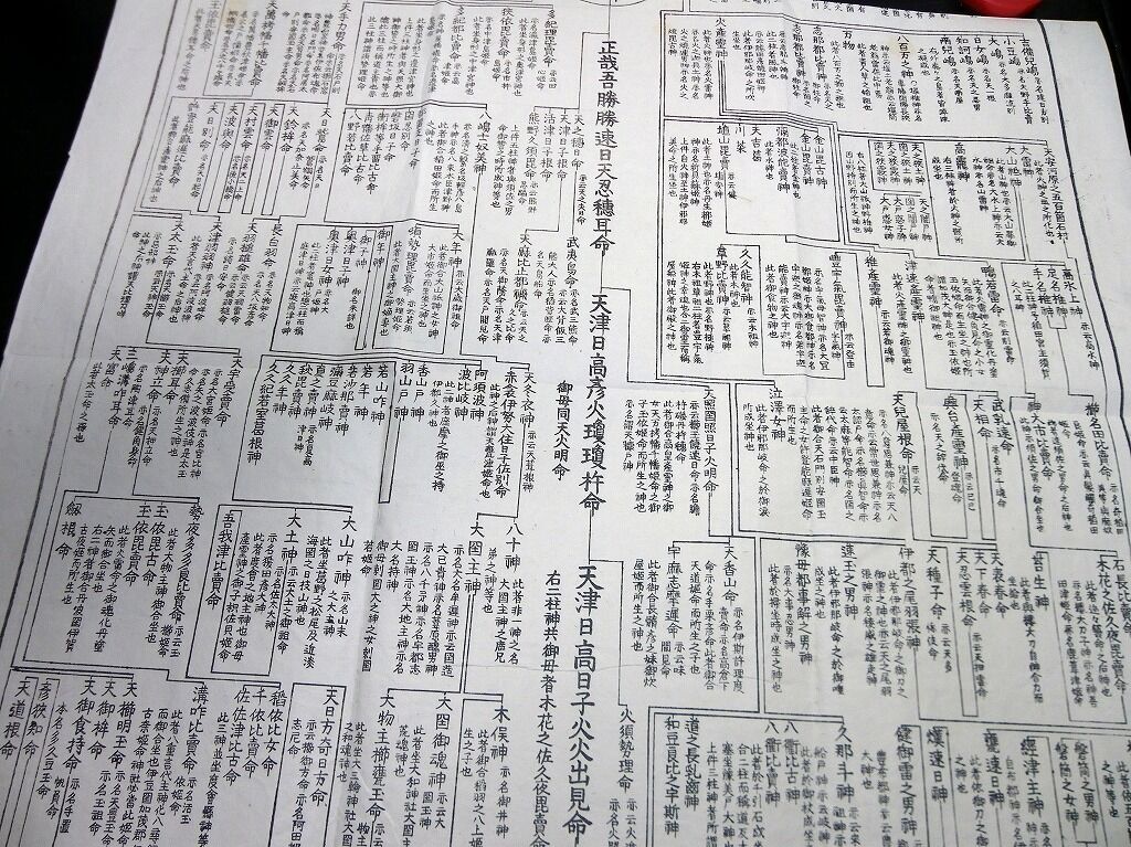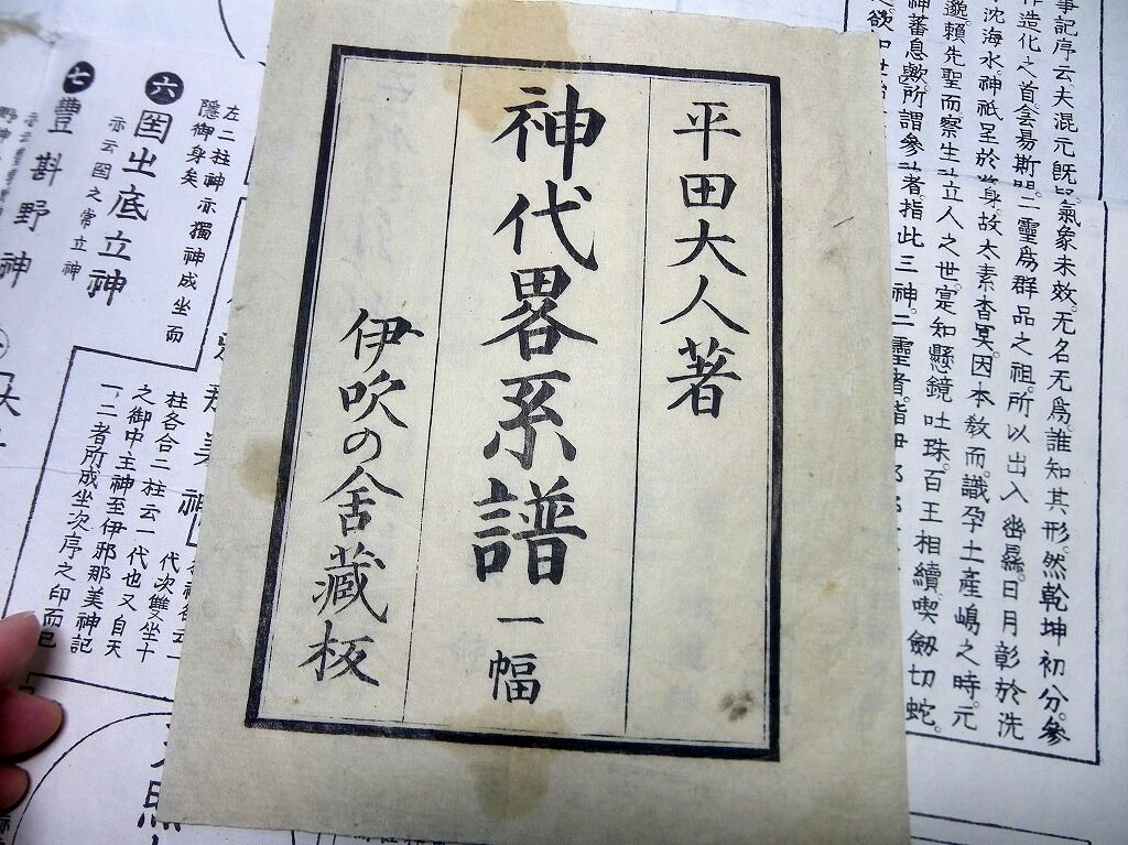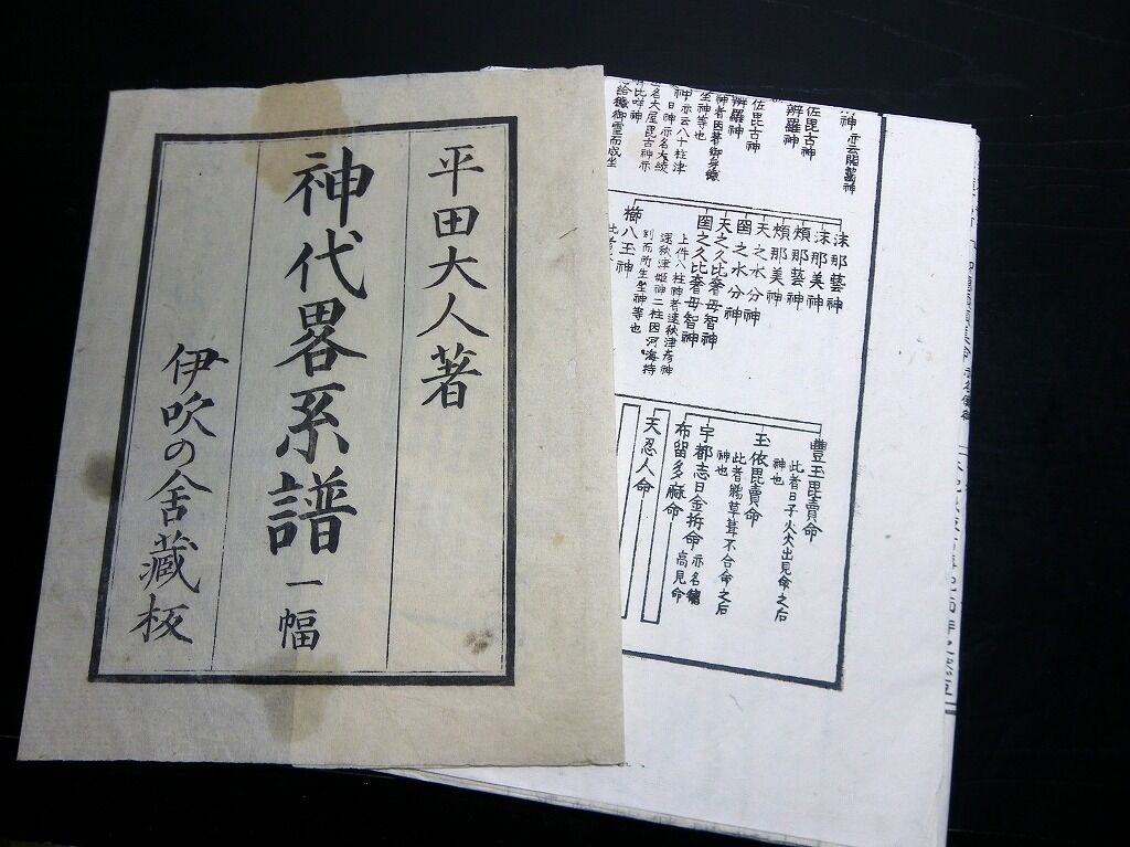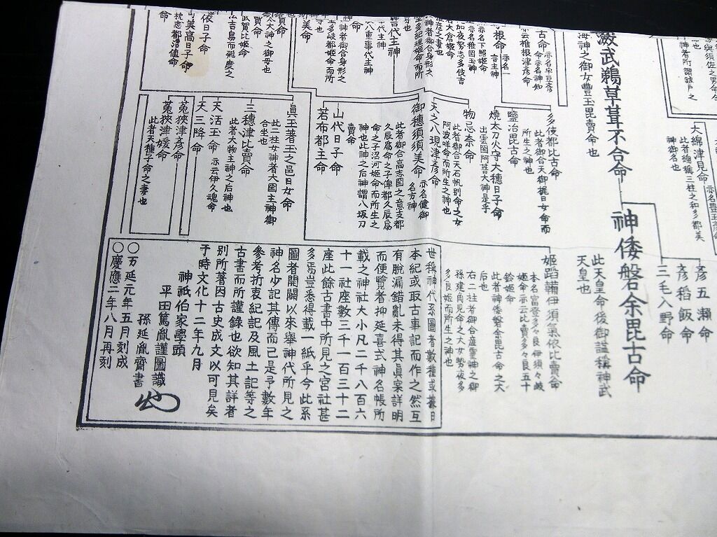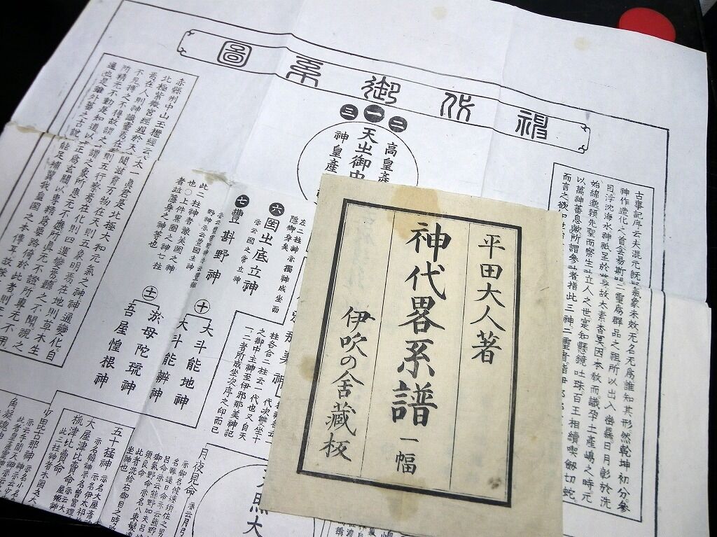 2022年05月19日 江戸慶応2年(1866)国学神道「神代略系譜」1点/平田篤胤/古書古文書/木版摺り 江戸慶応2年(1866)国学神道「神代略系譜」1点/平田篤胤/古書古文書/木版摺りです。123cm×56cm。木版刷り。『データ』【書名】 神代略系譜【巻冊】 1点【著者】 平田篤胤【成立】 慶応2年(1866) タグ :#和本#平田篤胤#国学#神道