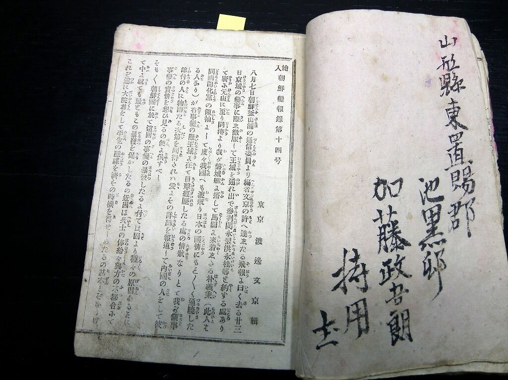 2019年12月09日 和本明治15年(1882)版壬午軍乱「絵入朝鮮変報録」13号と14号合1冊/絵入古書古文書/木版刷り/和紙に活版 和本明治15年(1882)版壬午軍乱「絵入朝鮮変報録」13号と14号合1冊/絵入古書古文書/木版刷り/和紙に活版です。 8+8丁。中本。表紙は木版刷り。本文は和紙に活版。奥付あり。 『データ』 【書名】 絵入朝鮮変報録 【巻冊】 13号と14号合1冊 【著者】 渡辺文京 【成立】 明治15年(1882)版 タグ :#和本#壬午軍乱#朝鮮変報録