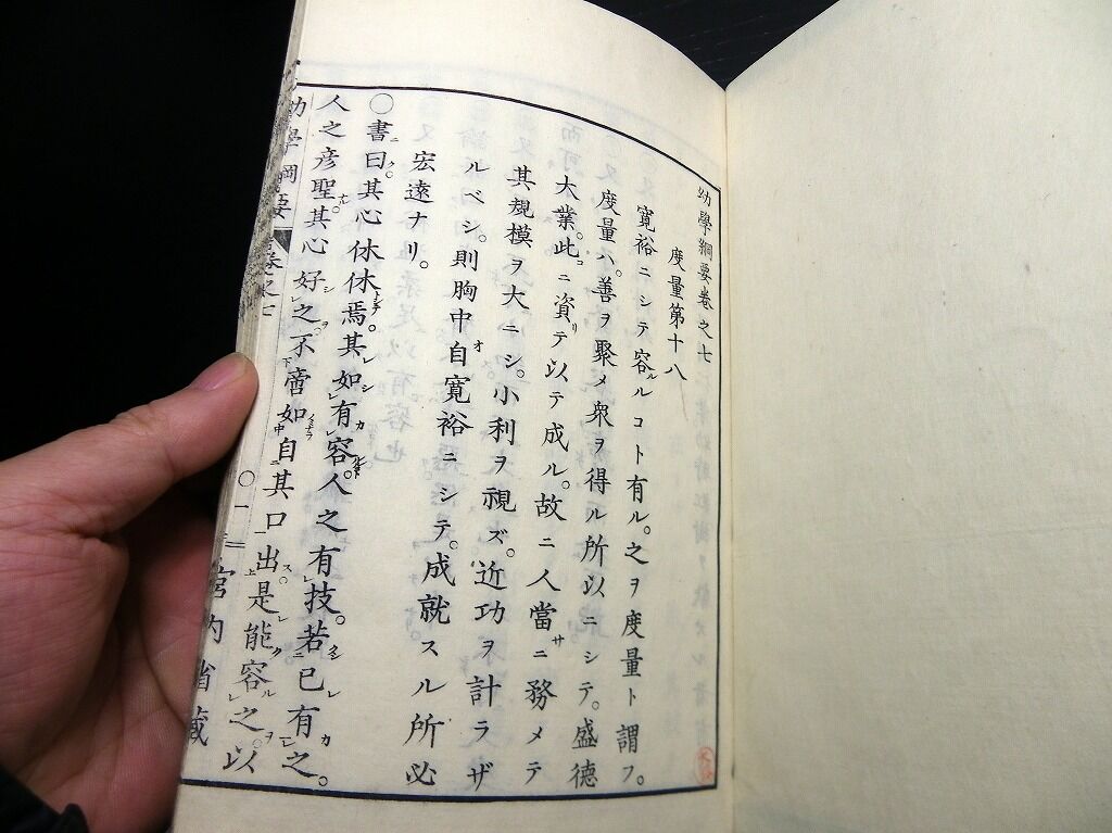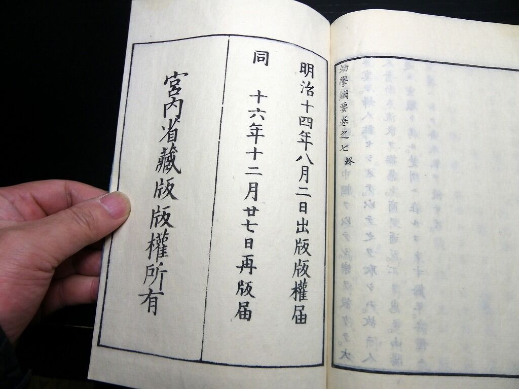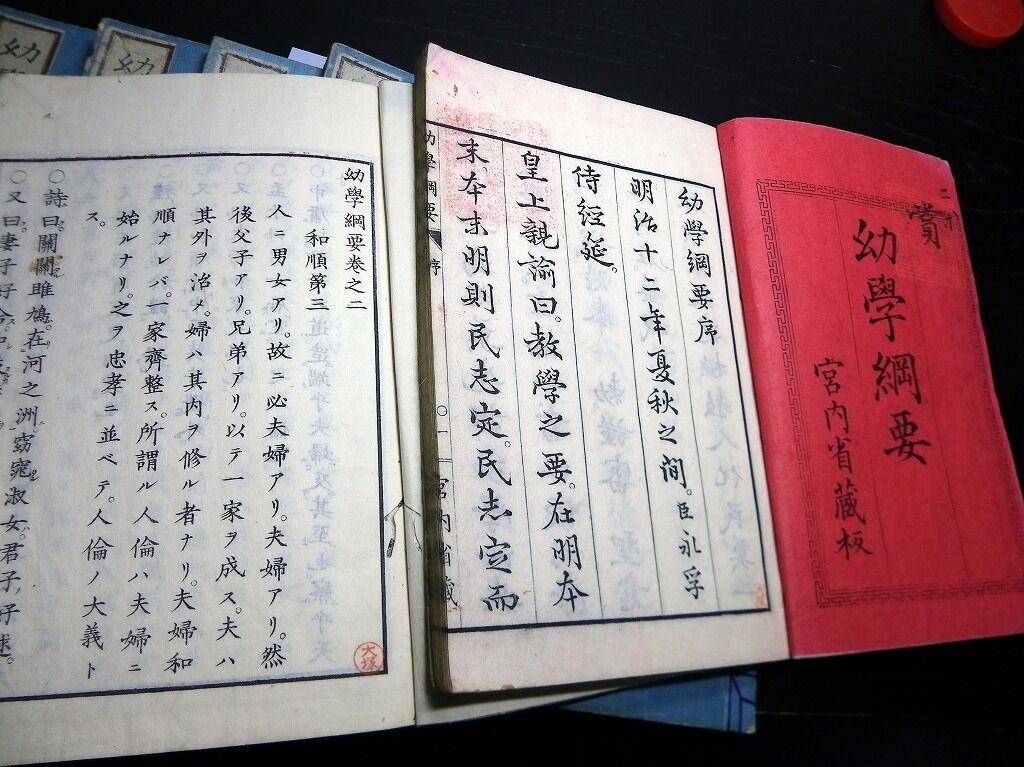 2020年08月31日 和本明治16年(1883)勅撰修身書「幼学綱要」7冊揃/宮内省蔵版/侍講元田永孚/松本楓湖/絵入古書古文書/木版摺り 和本明治16年(1883)勅撰修身書「幼学綱要」7冊揃/宮内省蔵版/侍講元田永孚/松本楓湖/絵入古書古文書/木版摺りです。 6+1+1+41、34、40、33、43、49、44丁。半紙本。木版刷り。元題簽。見返しあり。奥付あり。 『データ』 【書名】 幼学綱要 【巻冊】 7冊揃 【著者】 侍講元田永孚 編 松本楓湖 画 【成立】 明治16年(1883) タグ :#和本#松本楓湖#元田永孚