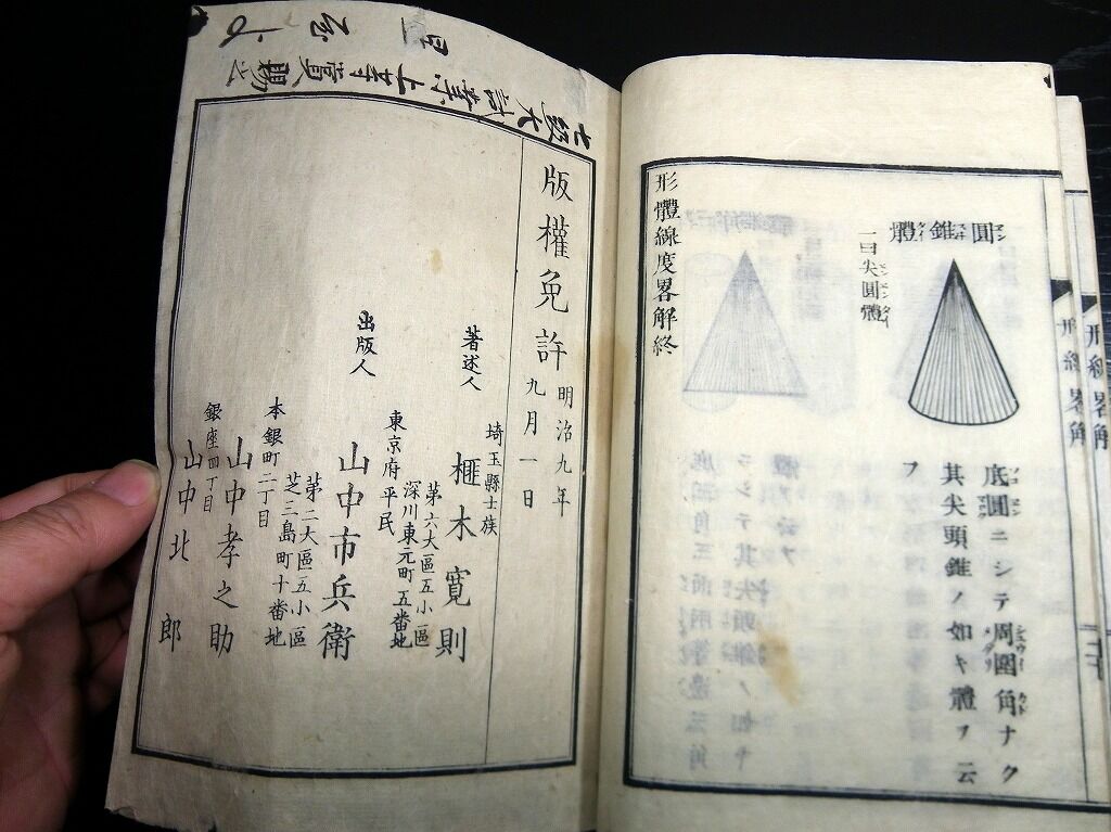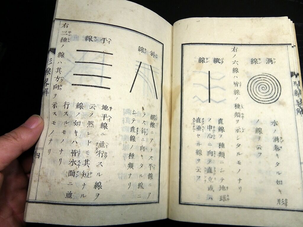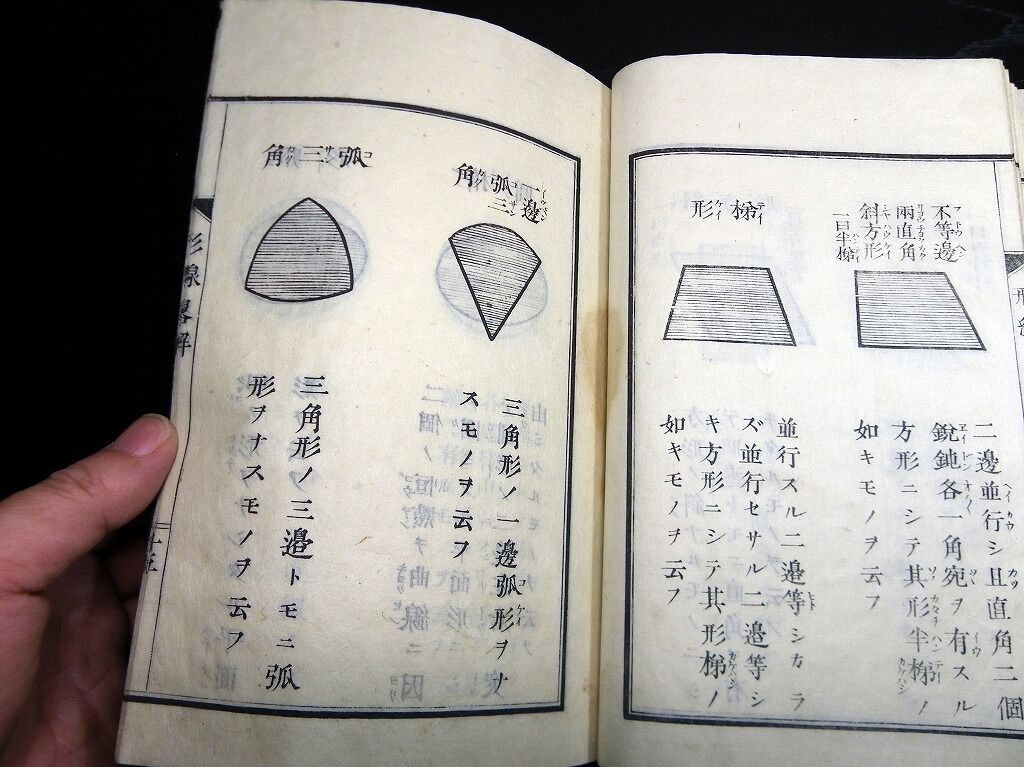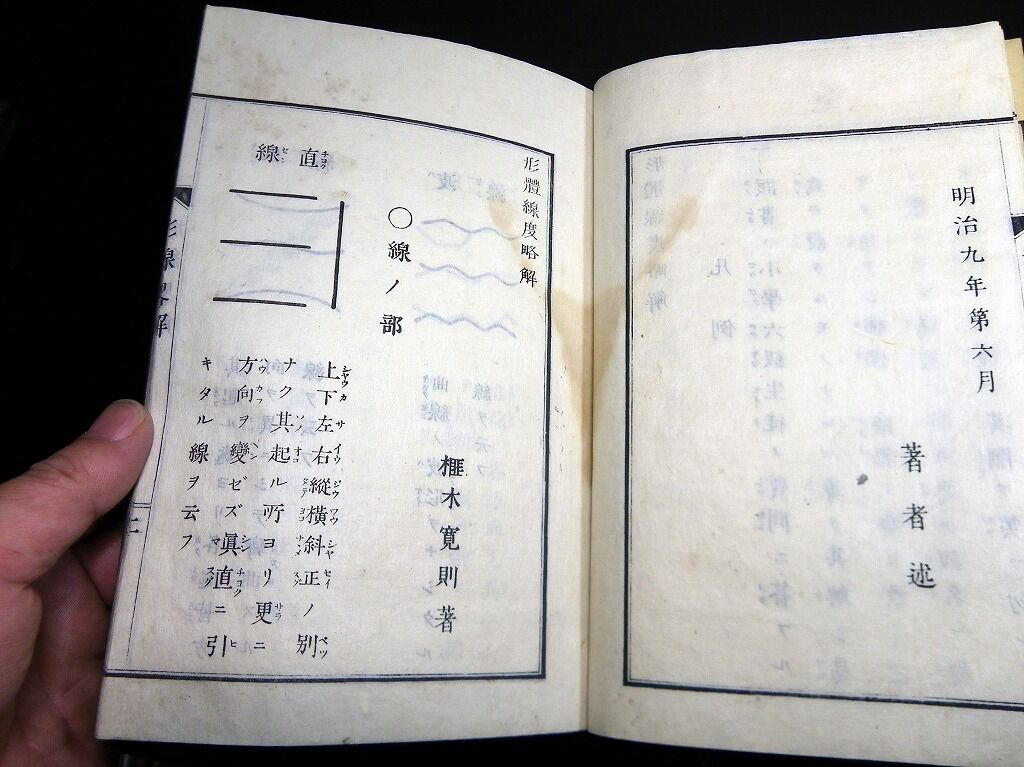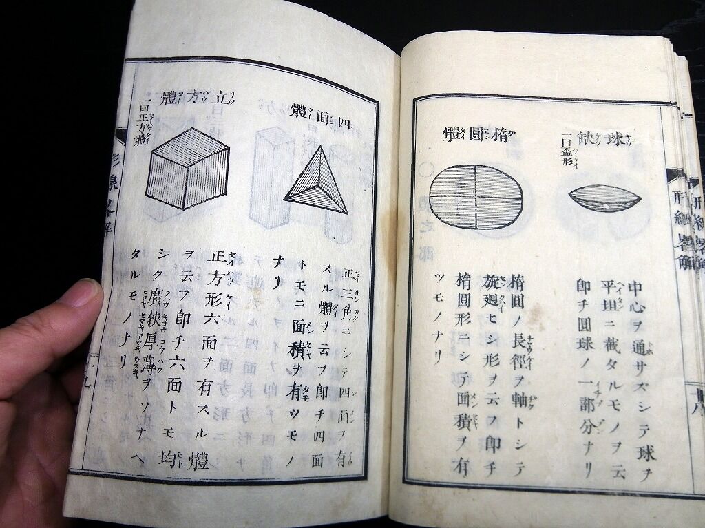 2020年07月04日 和本明治9年(1876)図形「小学形体線度略解」全1冊/東京府師範学校/榧木寛則/絵入古書古文書/木版摺り 和本明治9年(1876)図形「小学形体線度略解」全1冊/東京府師範学校/榧木寛則/絵入古書古文書/木版摺りです。 2+20丁。半紙本。木版刷り。題簽ほとんど欠。見返しあり。奥付あり。 『データ』 【書名】 小学形体線度略解 【巻冊】 全1冊 【著者】 東京府師範学校 榧木寛則 【成立】 明治9年(1876) タグ :#和本#榧木寛則