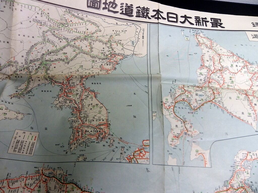 2021年04月17日 昭和11年(1936)古地図「最新大日本鉄道地図」1点/大阪毎日新聞附録/朝鮮/台湾/樺太 昭和11年(1936)古地図「最新大日本鉄道地図」1点/大阪毎日新聞附録/朝鮮/台湾/樺太です。78cm×109cm。『データ』【書名】 最新大日本鉄道地図【巻冊】 1点【著者】 大阪毎日新聞附録【成立】 昭和11年(1936) タグ :#古地図#朝鮮#台湾#樺太