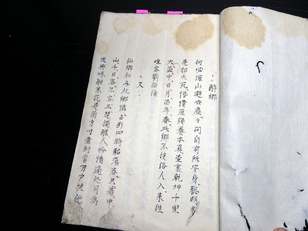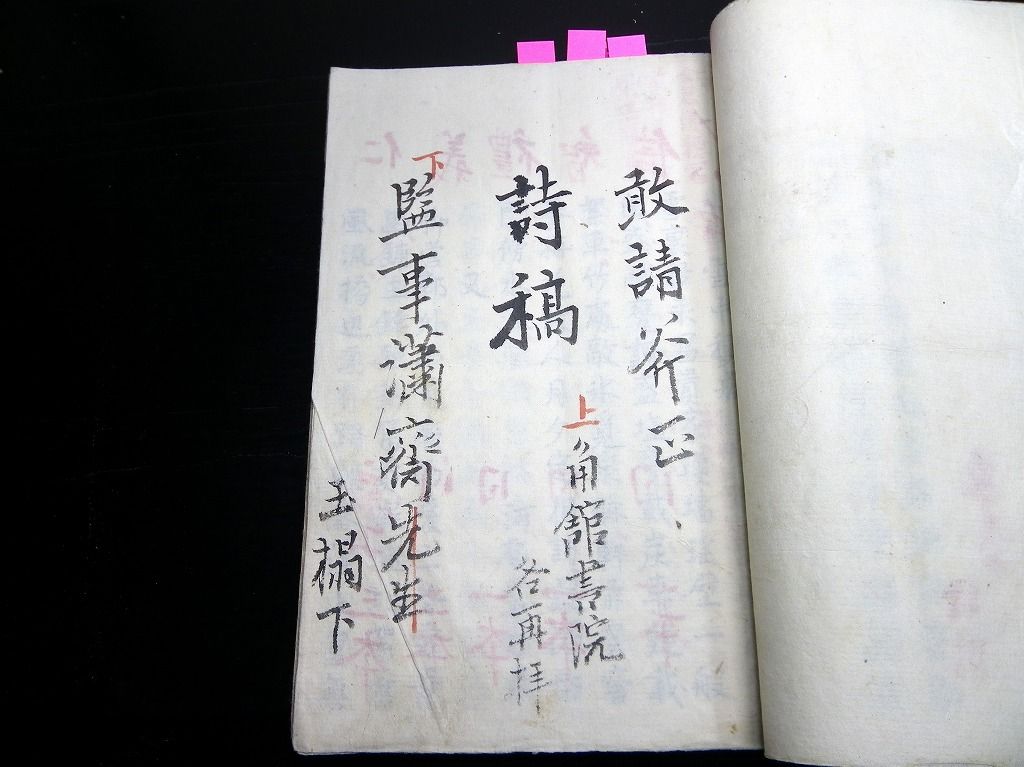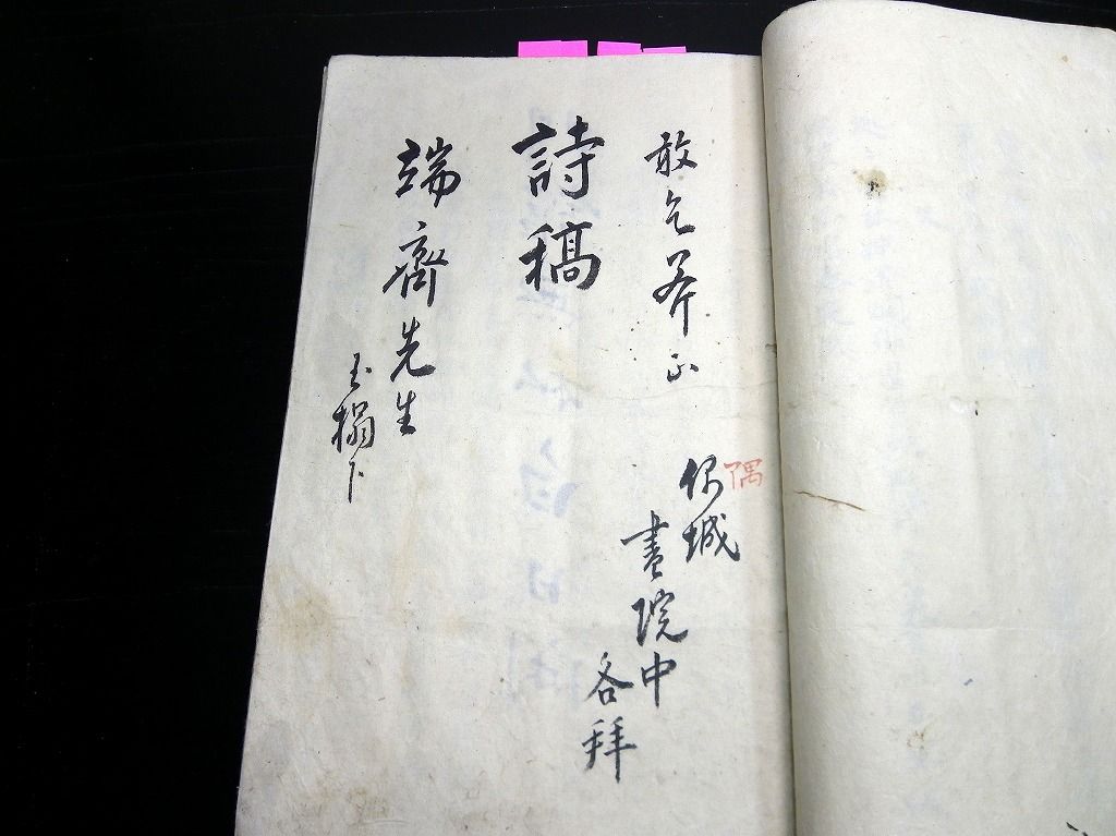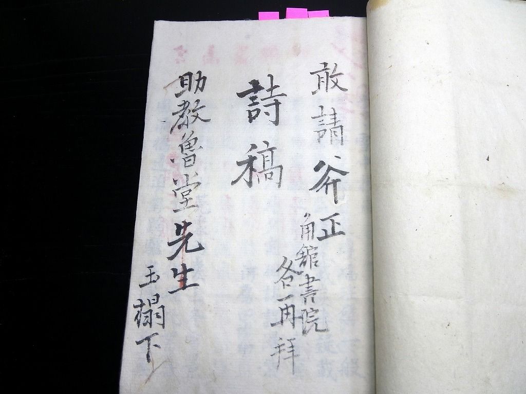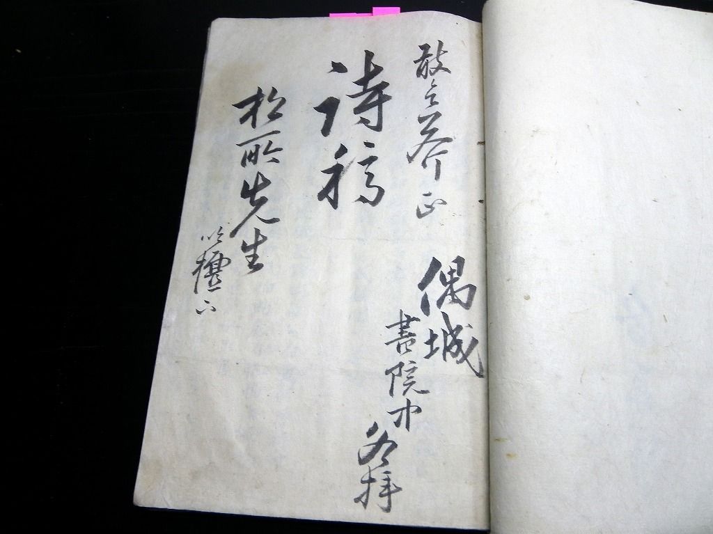 2019年10月08日 和本江戸幕末~明治期秋田藩漢詩文写本「詩稿」1冊/郷校湯沢時習書院/角館/古書古文書/手書き/石黒直信 和本江戸幕末~明治期秋田藩漢詩文写本「詩稿」1冊/郷校湯沢時習書院/角館/古書古文書/手書き/石黒直信です。 95丁。半紙本程度。手書き。 『データ』 【書名】 詩稿 【巻冊】 1冊 【著者】 秋田藩の郷校湯沢時習書院の記載があるので、秋田藩士が書いたものだと思います 【成立】 幕末~明治期 タグ :#和本#漢詩#秋田藩#古書古文書#石黒直信#時習書院
