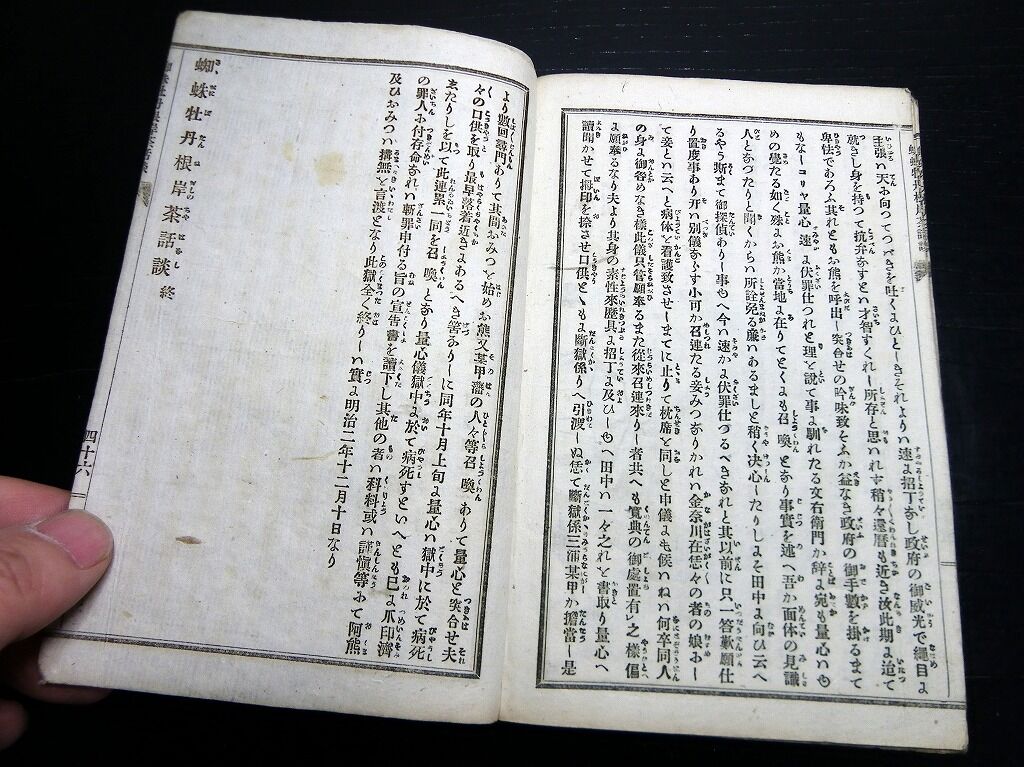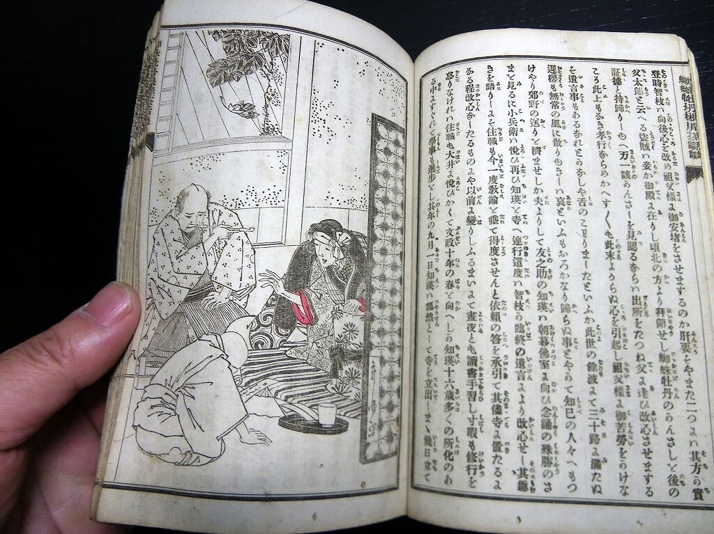2021年04月06日 和本明治18年(1885)小説「蜘蛛牡丹根岸茶話談」全1冊/彩霞園柳香/稲野年恒/絵入古書/木版摺り/和紙に活版 和本明治18年(1885)小説「蜘蛛牡丹根岸茶話談」全1冊/彩霞園柳香/稲野年恒/絵入古書/木版摺り/和紙に活版です。2+46丁。中本。表紙及び口絵が木版刷り。本文は和紙に活版。奥付あり。『データ』【書名】 蜘蛛牡丹根岸茶話談【巻冊】 全1冊【著者】 彩霞園柳香 著 稲野年恒 画【成立】 明治18年(1885) タグ :#古書#絵入