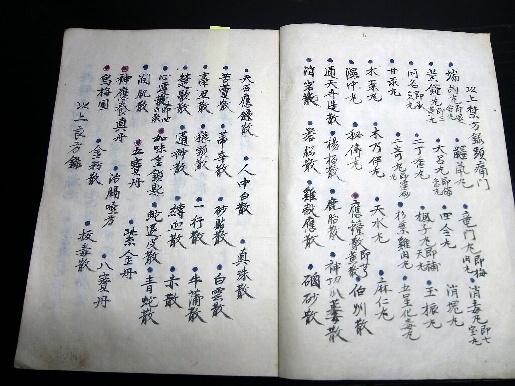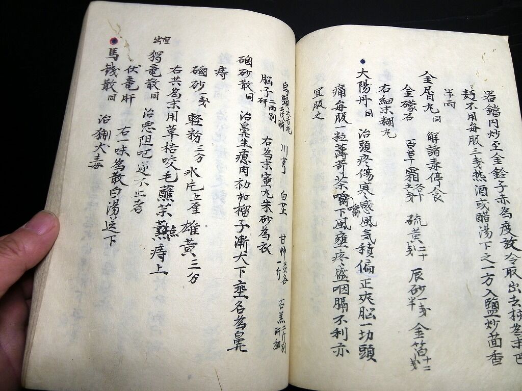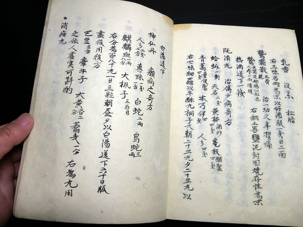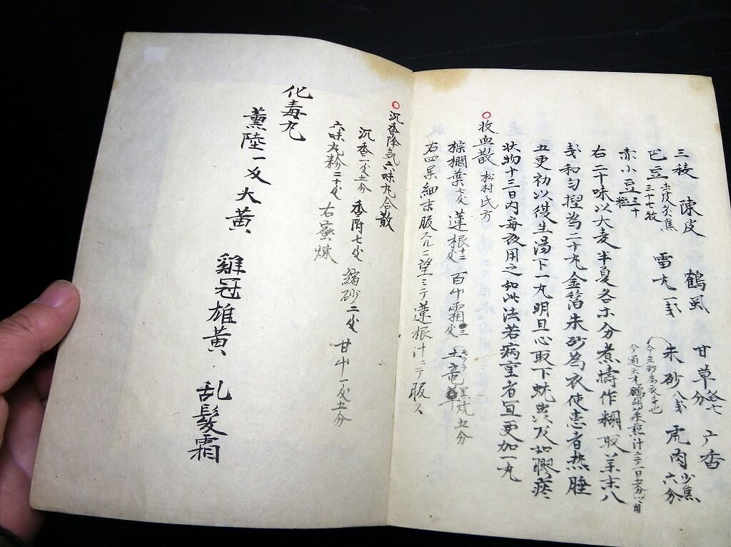 2021年10月13日 和本江戸弘化4年(1847)華岡青洲系統医学薬学写本「日用丸散録」全1冊/古書古文書/手書き 和本江戸弘化4年(1847)華岡青洲系統医学薬学写本「日用丸散録」全1冊/古書古文書/手書きです。57丁。23.5cm×17.5cm。手書き。『データ』【書名】 日用丸散録【巻冊】 全1冊【著者】 春日写【成立】 弘化4年(1847) タグ :#和本#医学#華岡青洲#薬学#古文書