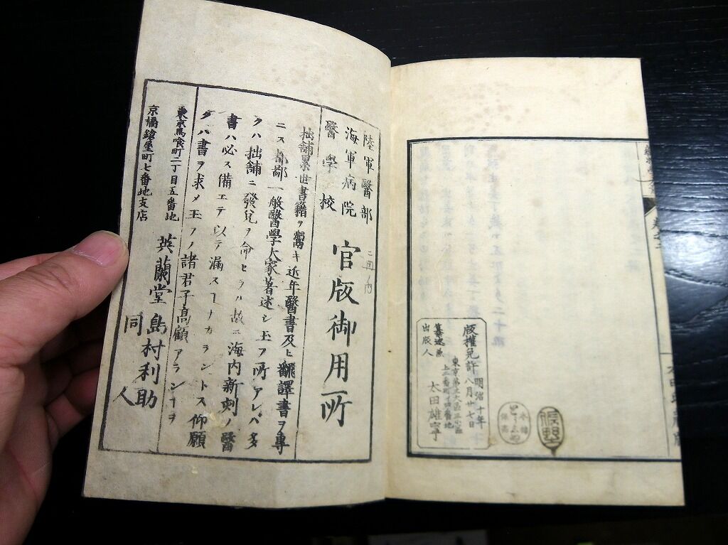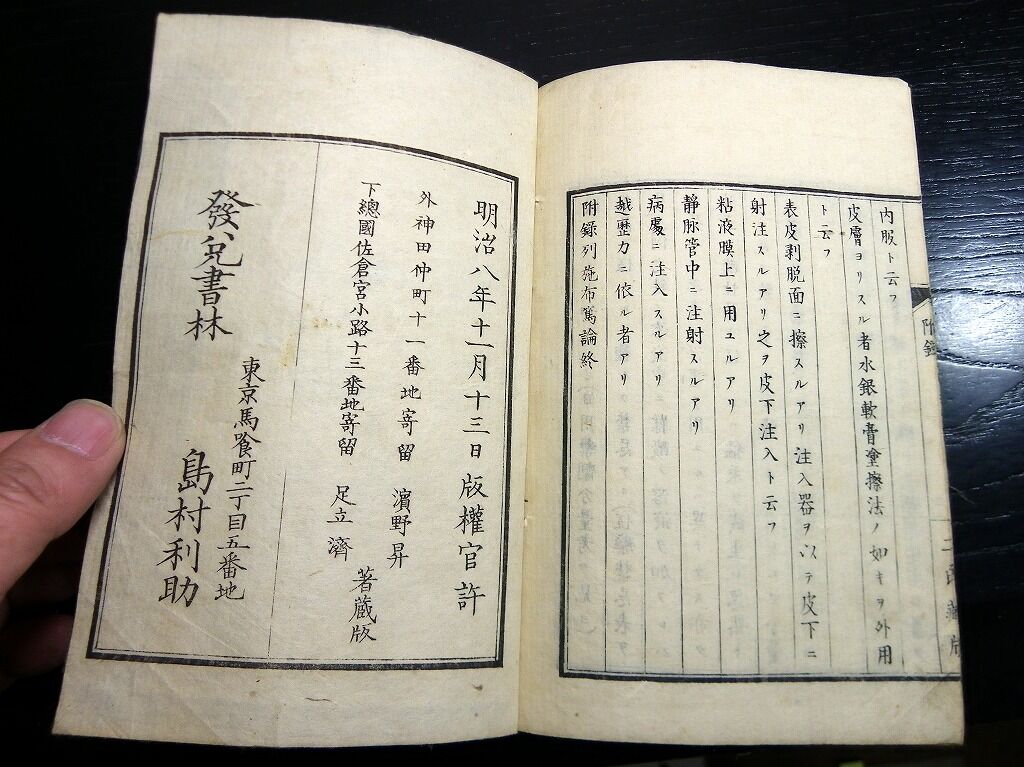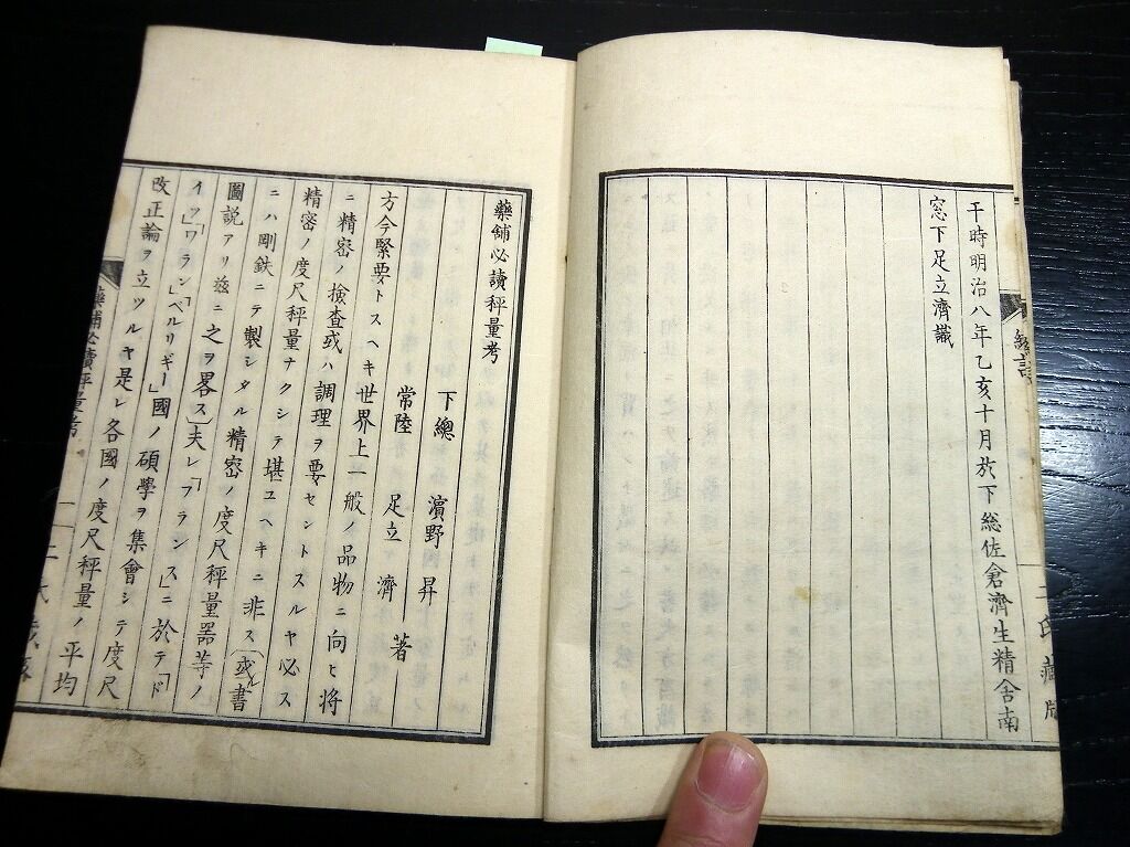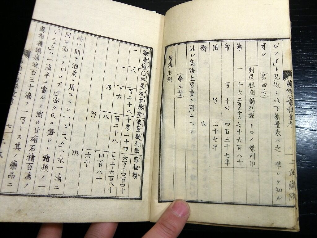 2020年02月04日 和本明治8年(1875)版薬屋薬局「薬舗必読秤量考/付録処方論」全1冊/浜野昇/足立済/古書古文書/木版摺り/西洋医学 和本明治8年(1875)版薬屋薬局「薬舗必読秤量考/付録処方論」全1冊/浜野昇/足立済/古書古文書/木版摺り/西洋医学です。 2+15+3丁。中本。木版刷り。元題簽。見返しあり。奥付あり。 『データ』 【書名】 薬舗必読秤量考/付録処方論 【巻冊】 全1冊 【著者】 浜野昇/足立済 【成立】 明治8年(1875)版 タグ :#和本#医学#薬学